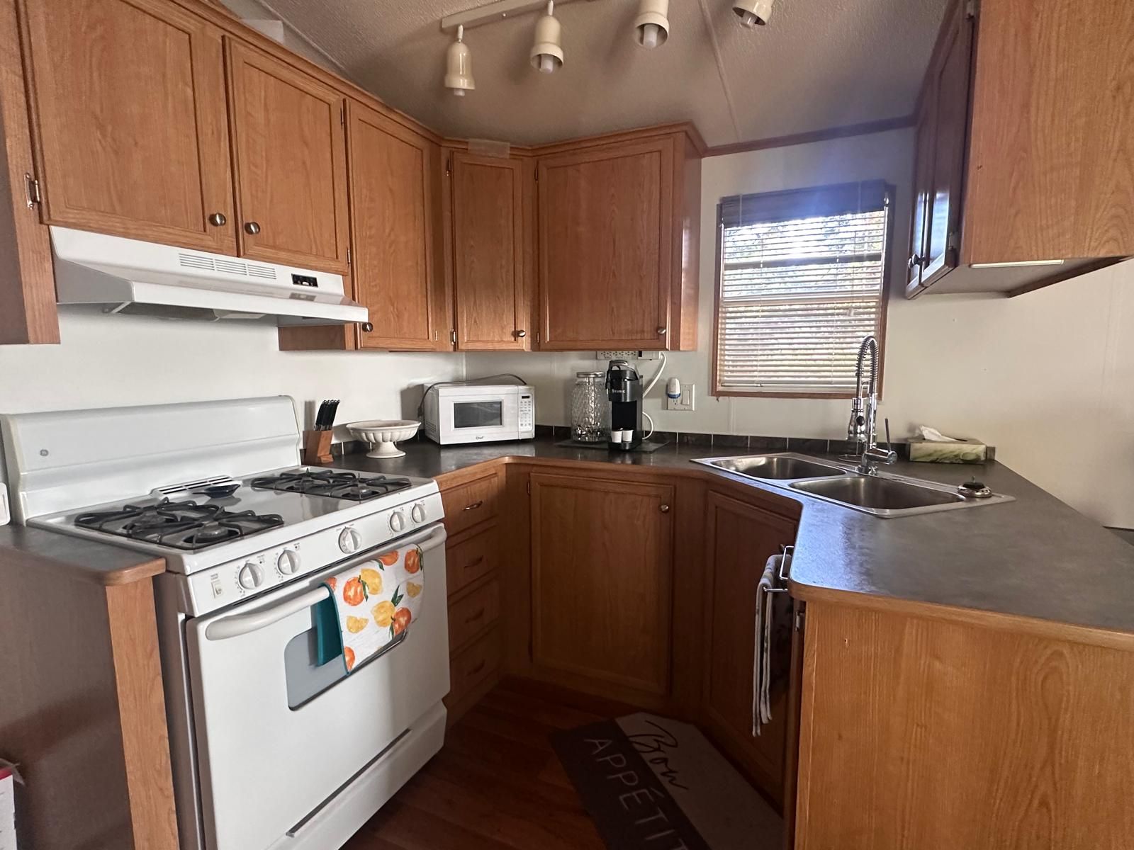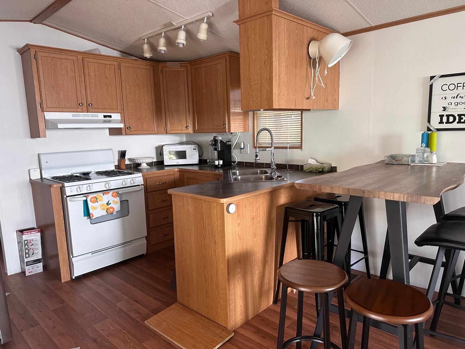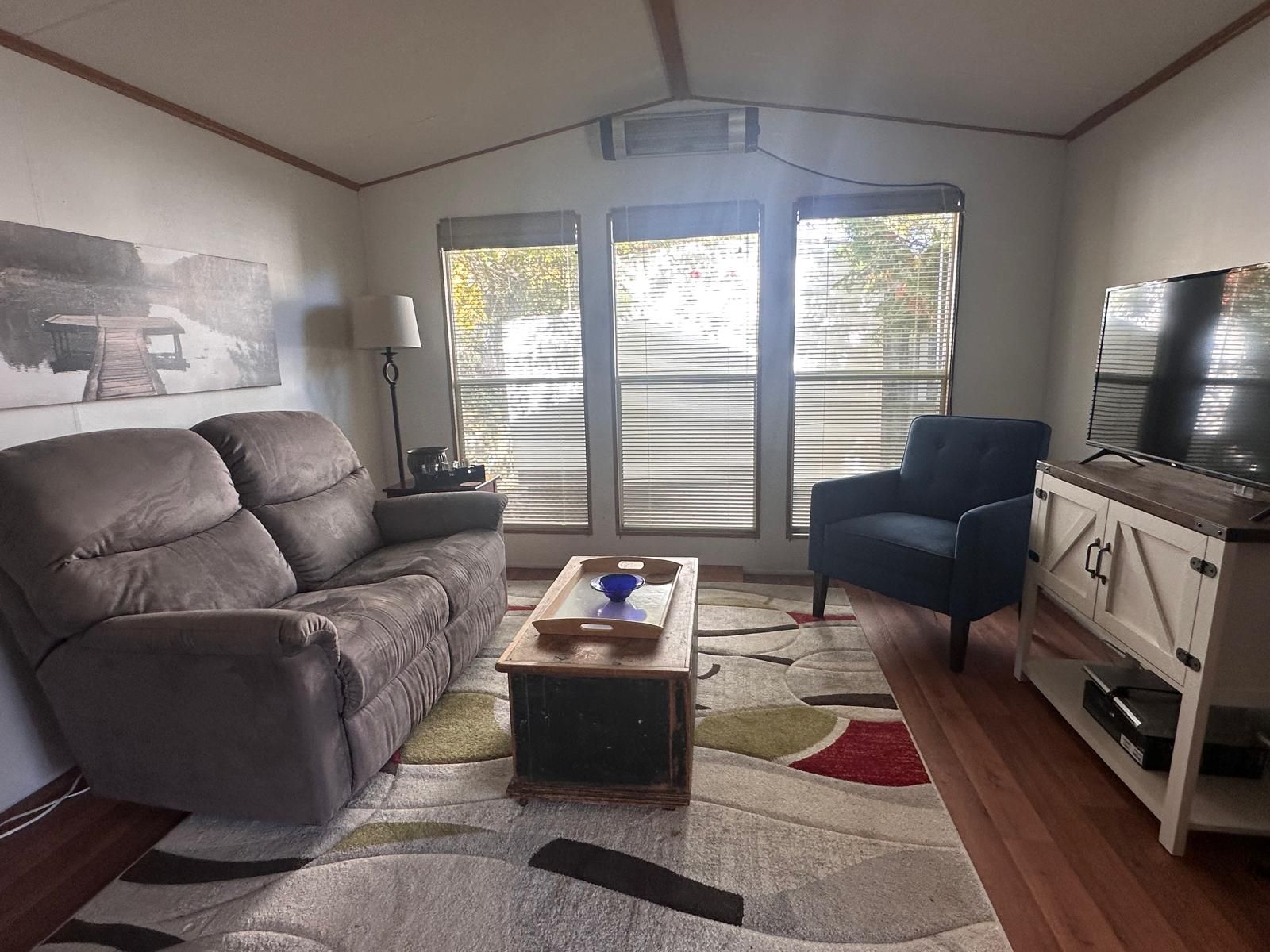 • Spacious interior with a full kitchen, living room, and covered deck.