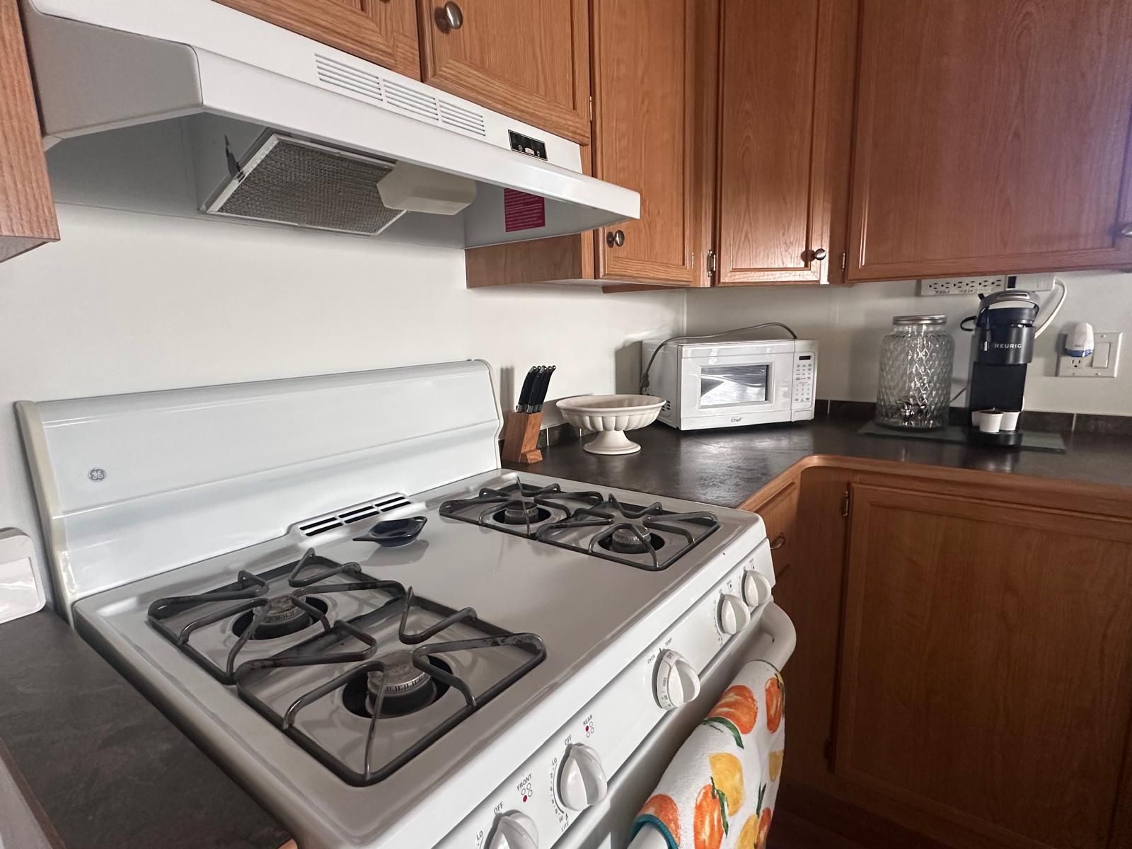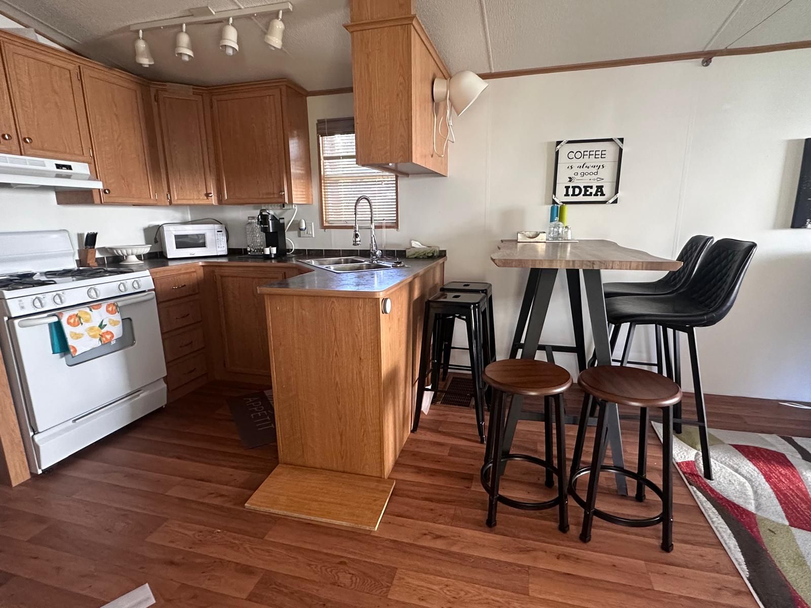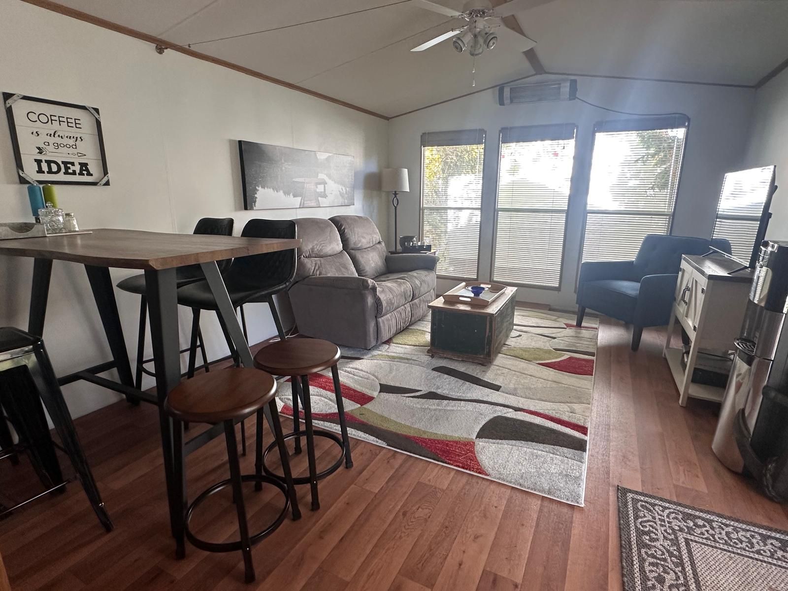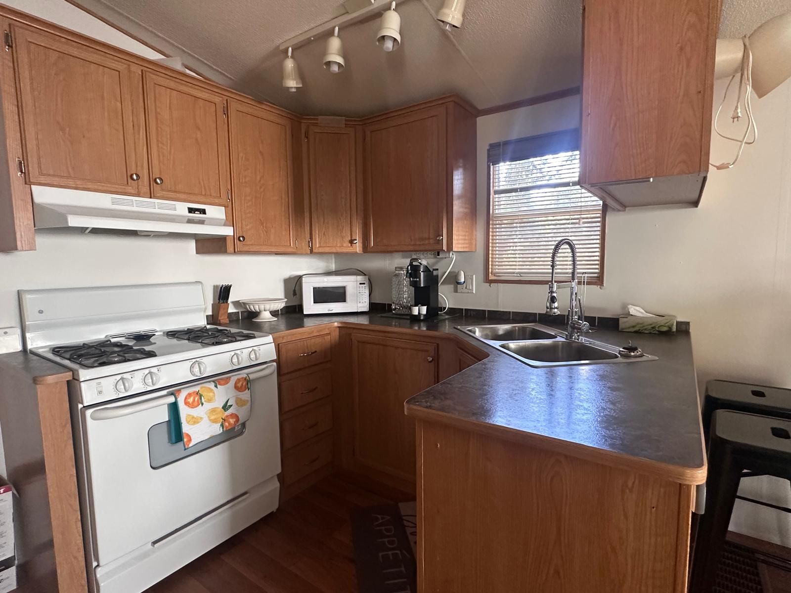 • Spacious interior with a full kitchen, living room, and covered deck.