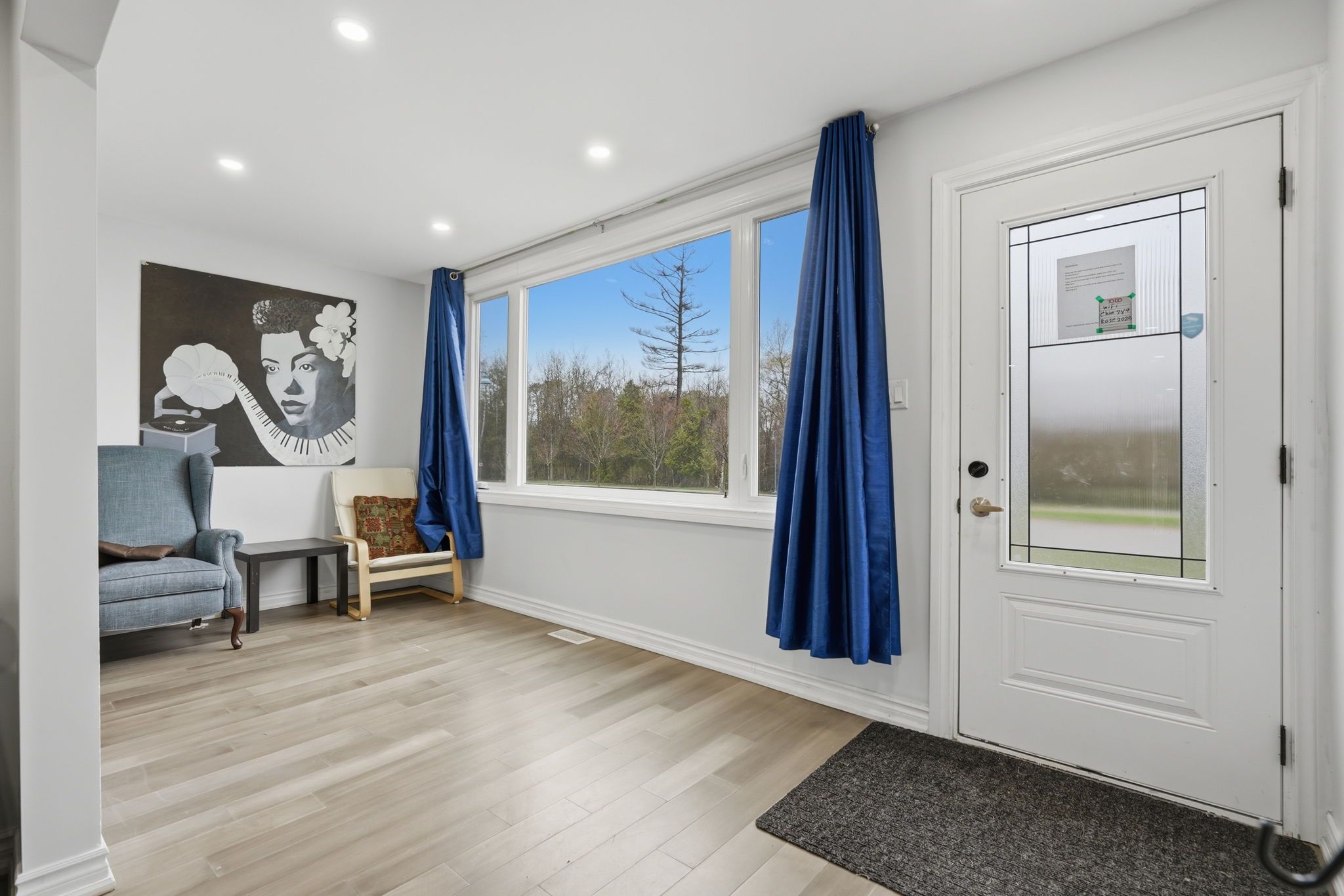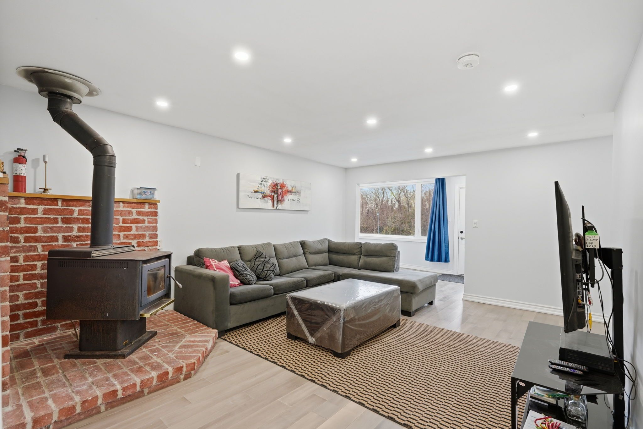 • Cozy wood-burning fireplace in the welcoming living room.
