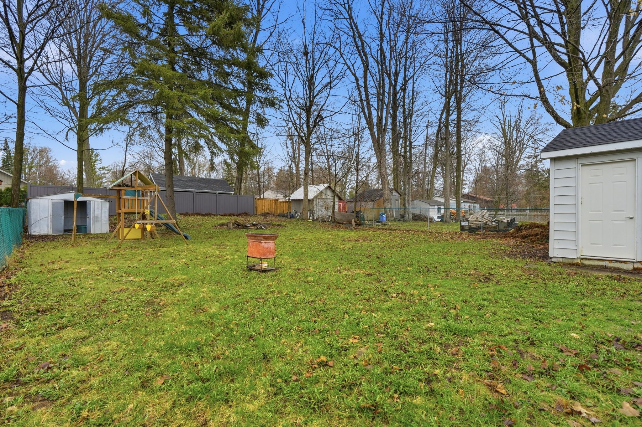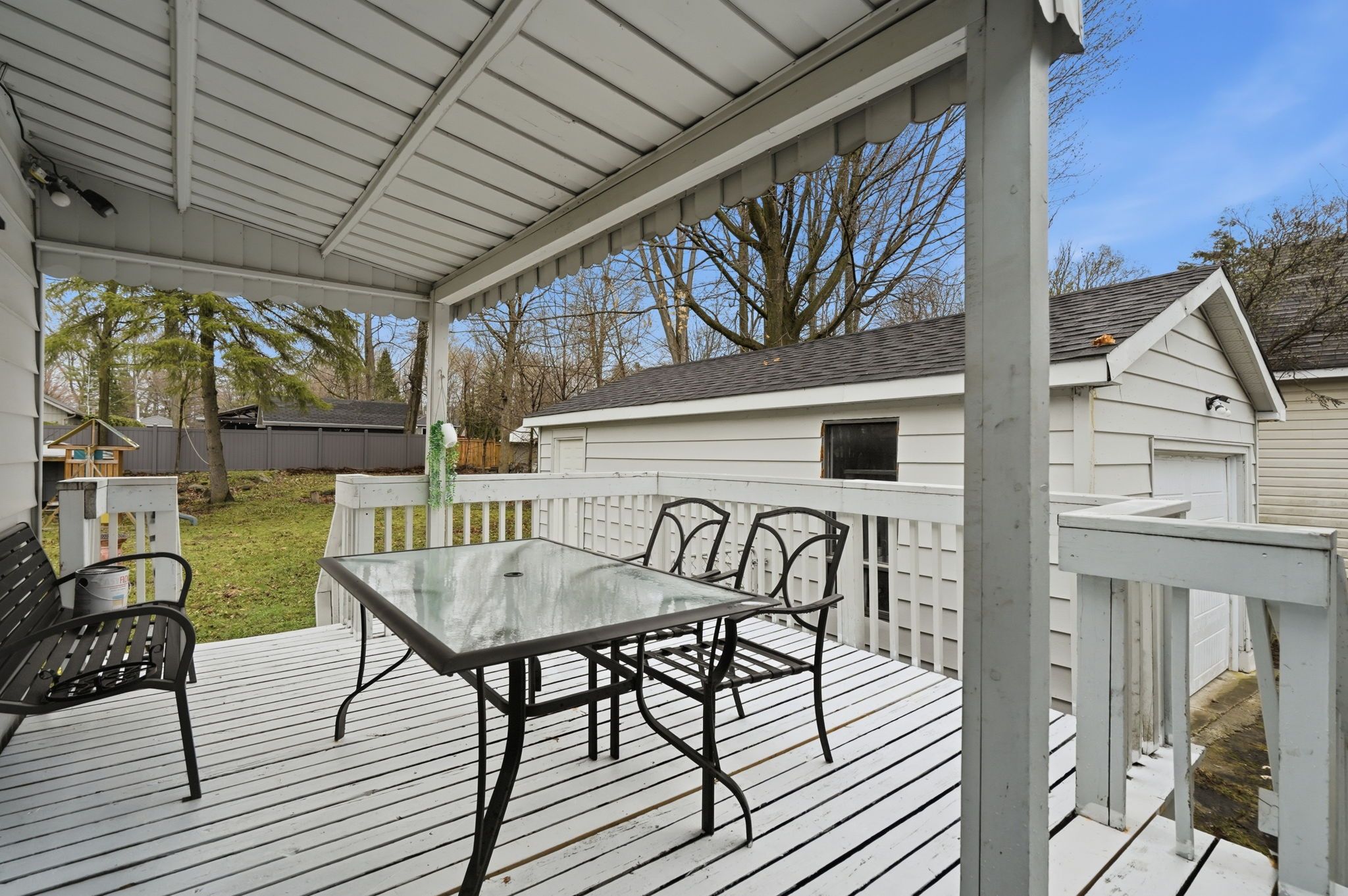 • Private backyard retreat surrounded by mature trees, great for relaxation.