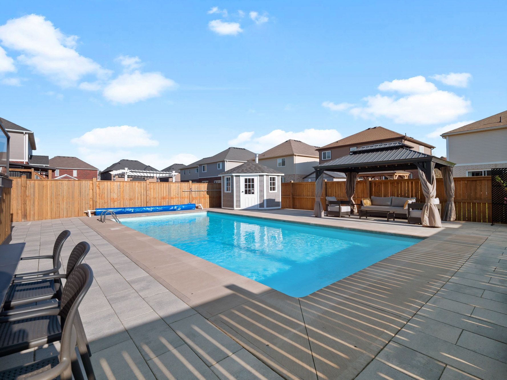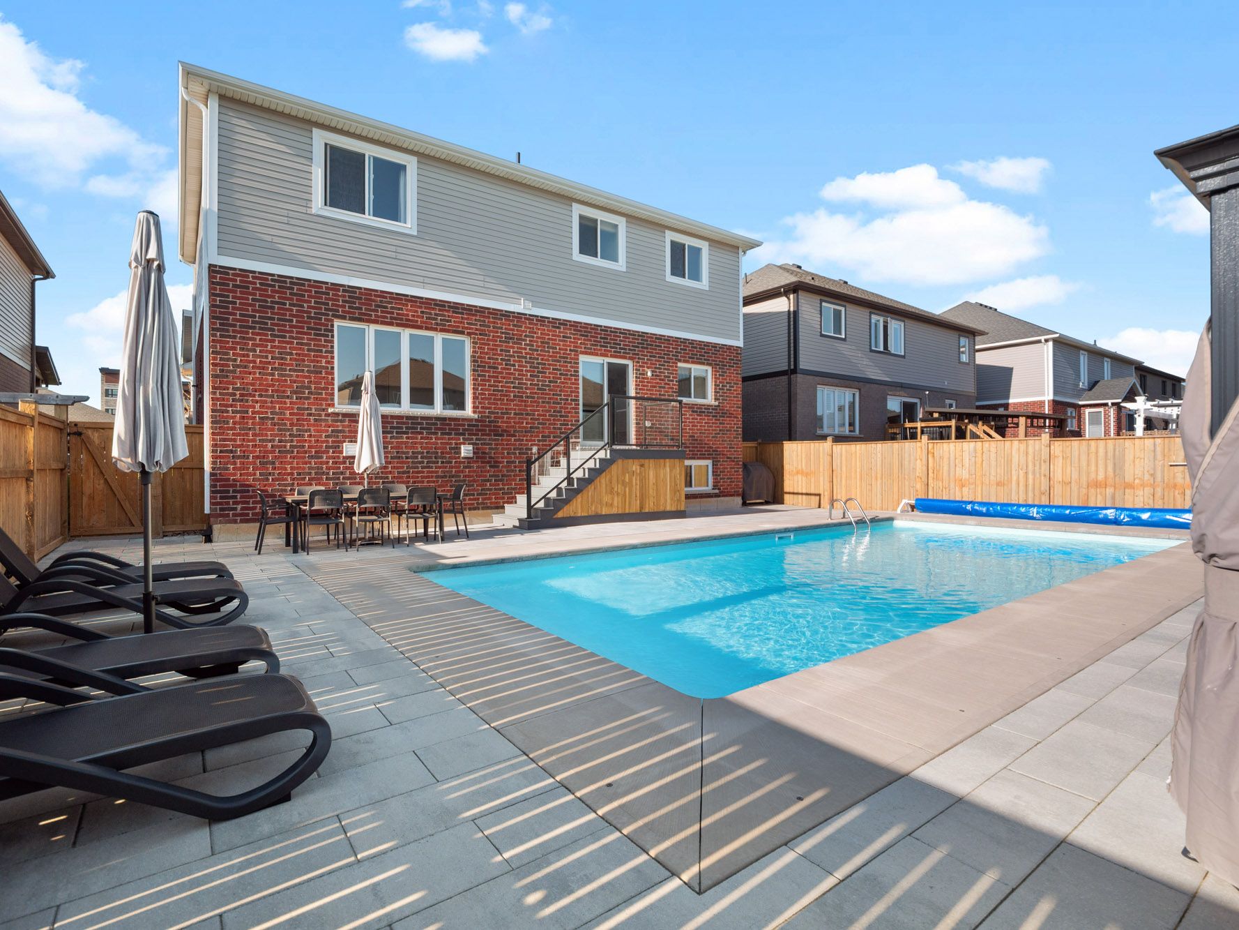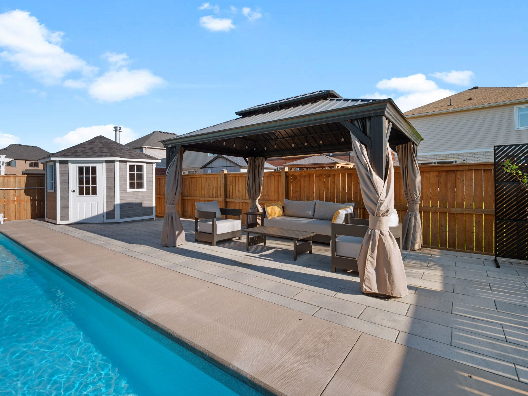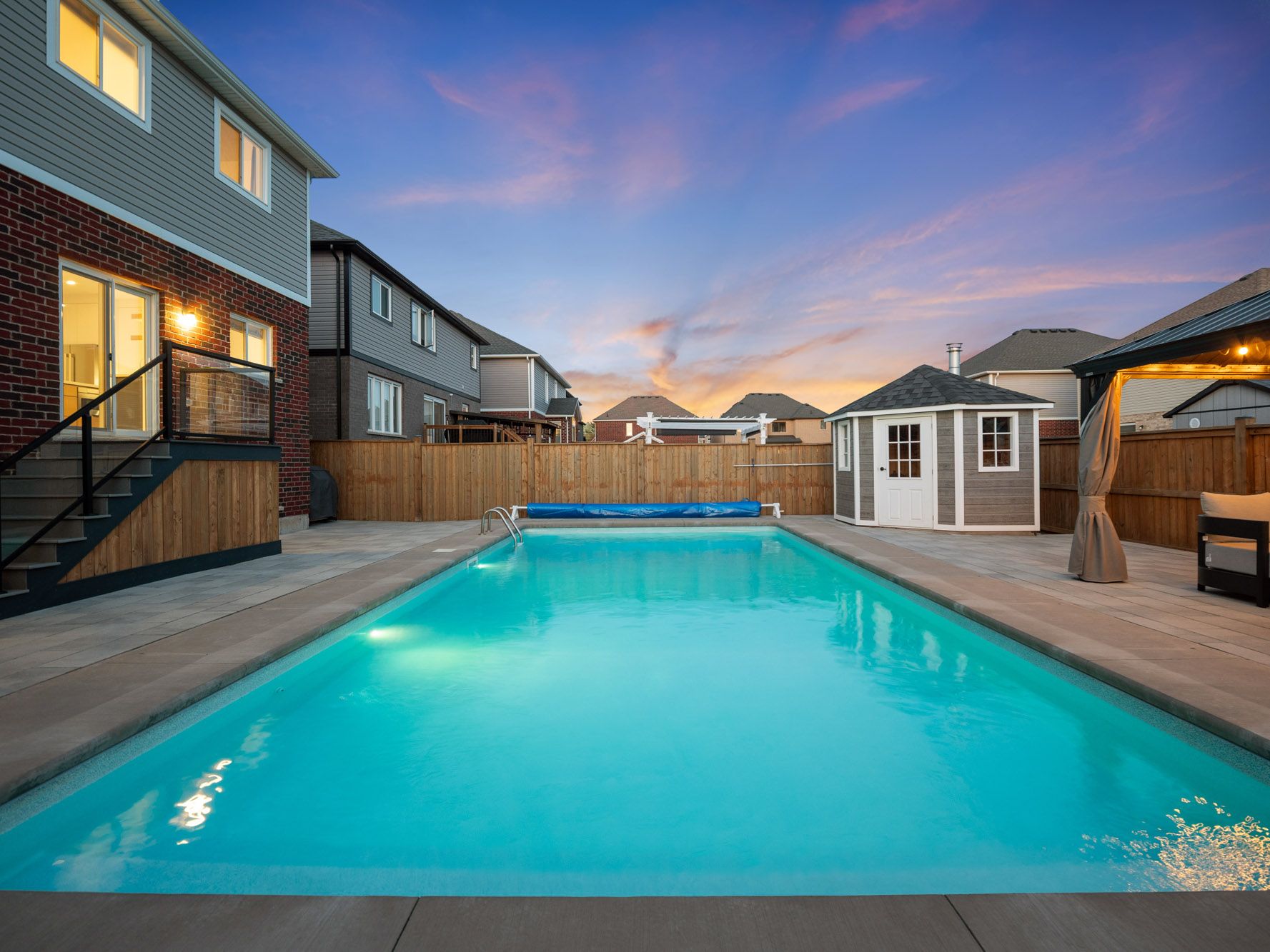Originally built in 2018, this nearly 2,500 sq. Ft., four-bedroom, two-storey home has been thoughtfully and fully renovated in recent years. White oak engineered hardwood flows through the living areas, which, paired with the neutral colour palette, creates a continuity of design that makes this an easy home to move into. The custom kitchen, with quartz counters, a waterfall island, high-end appliances, and quartz backsplash has an adjacent butler's pantry which leads through to the formal dining room. The living room, complete with linear fireplace and built-in shelving, is full of natural light. Directly inside from the double garage, you'll find a laundry room you'll actually look forward to being in! With the aid of a designer, it was completely renovated in 2025 with quartz counters, folding counter, ample storage, and a cubby for coats. A powder room with a custom marble sink rounds out this level. Upstairs, you'll find four bedrooms, each spacious enough for a king-sized suite. The primary suite spans over 400 sq. Ft. And includes double walk-in closets and a sumptuous ensuite with floor-to-ceiling porcelain tiles, quartz-topped vanity, a curbless tiled shower, and a freestanding soaker tub. The other three bedrooms share yet another stylish bathroom, this one a four-piece with tiled tub surround, a tempered glass divider, and a tiled accent wall behind the quart-topped vanity. All of this and we haven't even mentioned the fabulous backyard! Professionally installed hardscape surrounds a 16' x 34' heated, saltwater pool with full-width stairs. You'll find a custom pool shed and a 13' x 10' gazebo, equipped with electrical supply. As you pull up, this home gives off strong curb appeal, with the brick front, soffit accent lighting, and landscaped garden. The pride of ownership is clearly evident throughout. We think you'll love what you see! Be sure to check out the video tour as well.