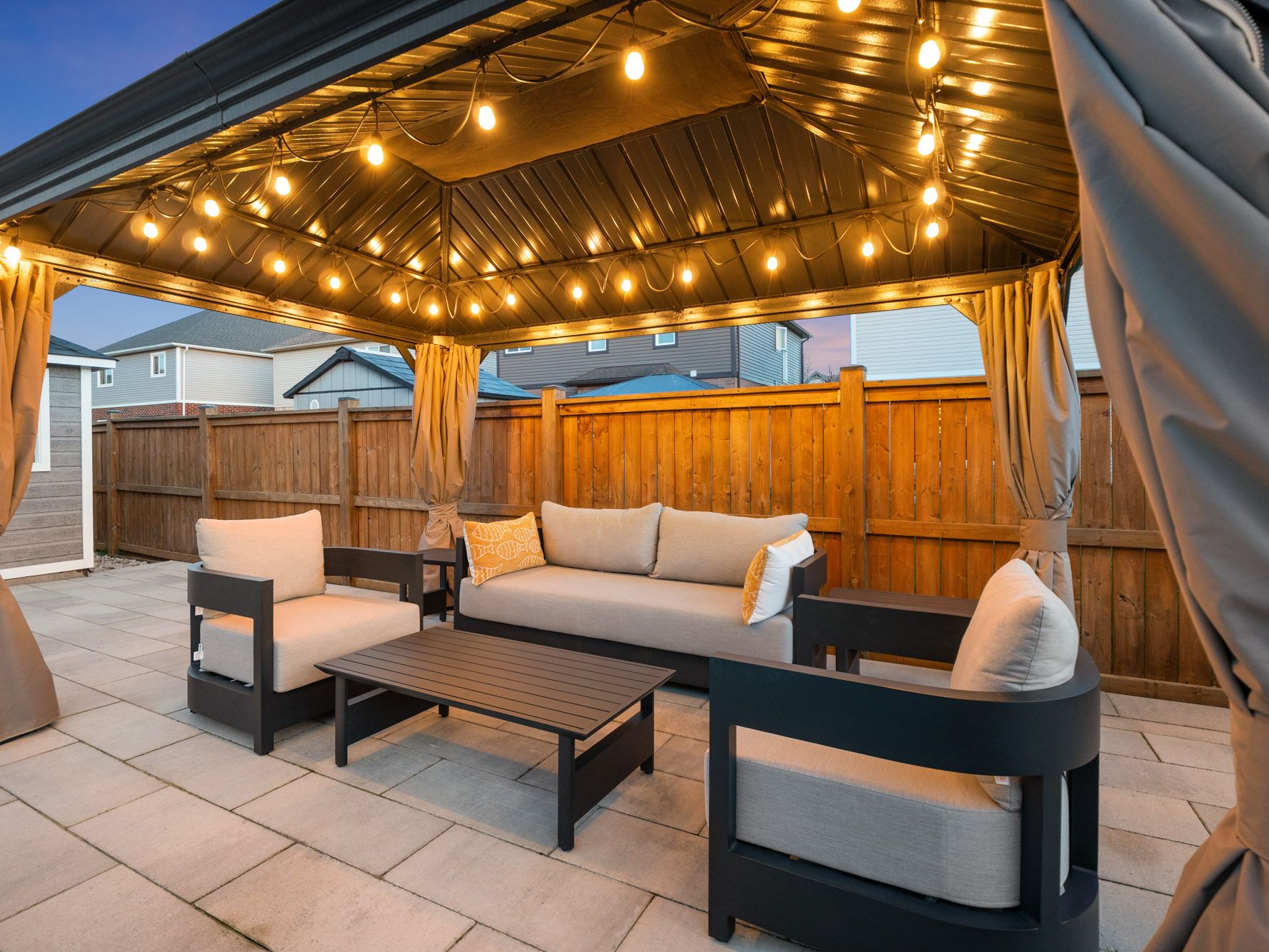 • Backyard oasis with a heated saltwater pool and custom gazebo.
