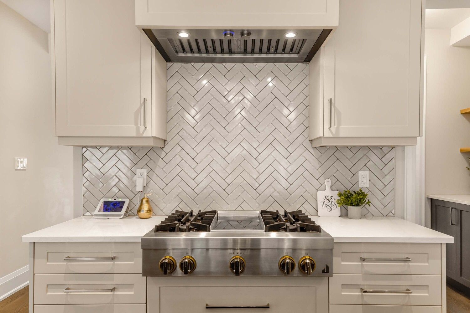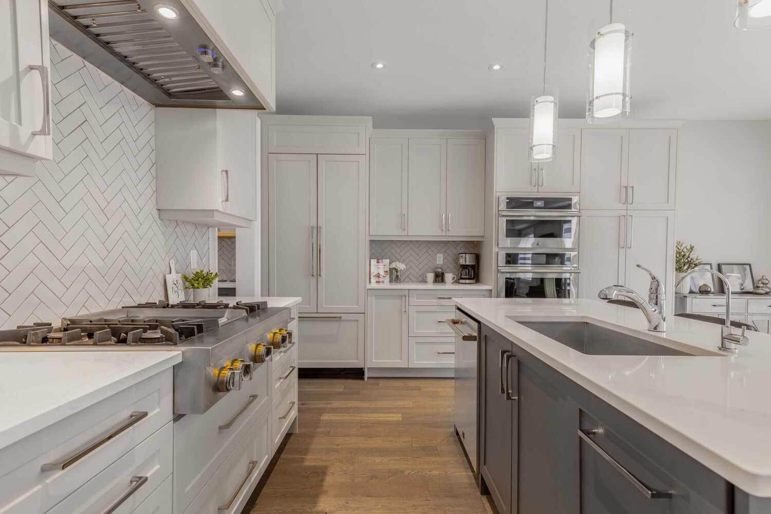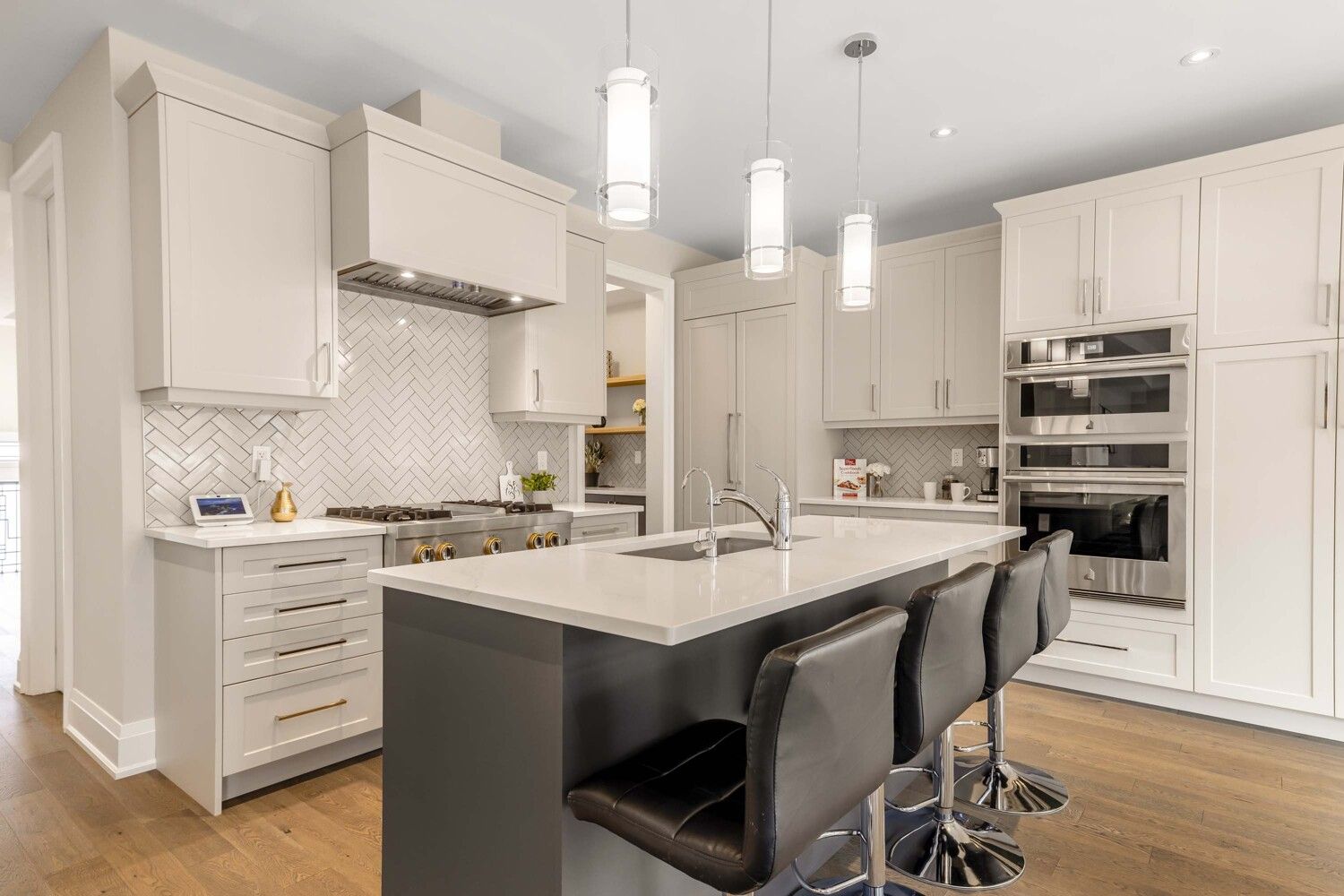 • Custom-designed kitchen with high-end appliances and quartz countertops.