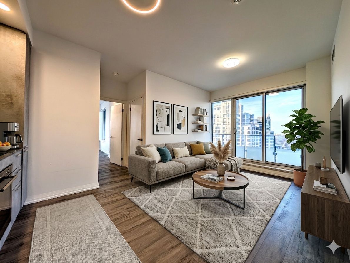 • Bright corner suite with 9ft ceilings and private balcony offering city views.
