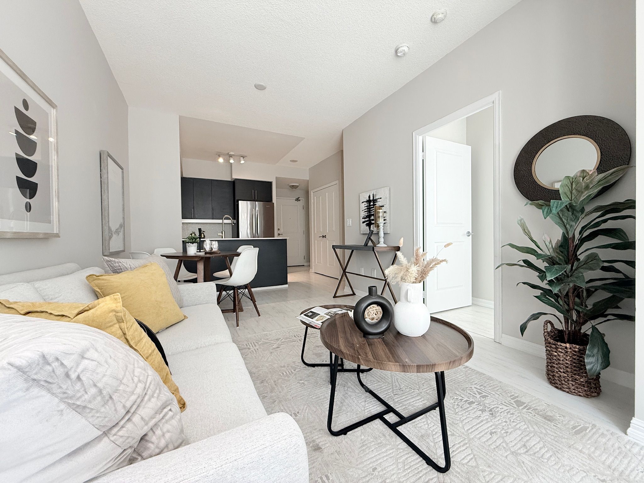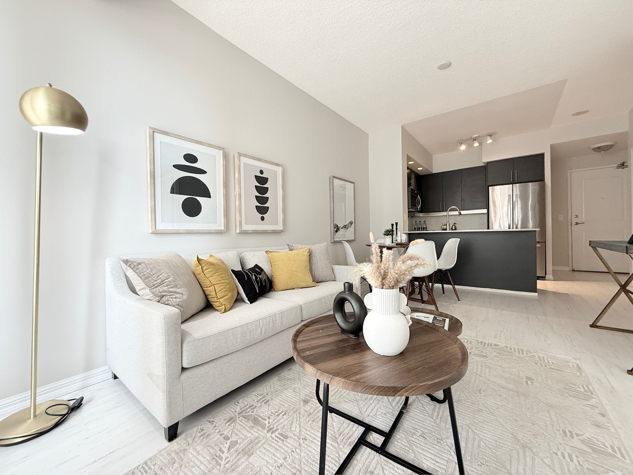 • Open concept kitchen with stainless steel appliances for modern living.