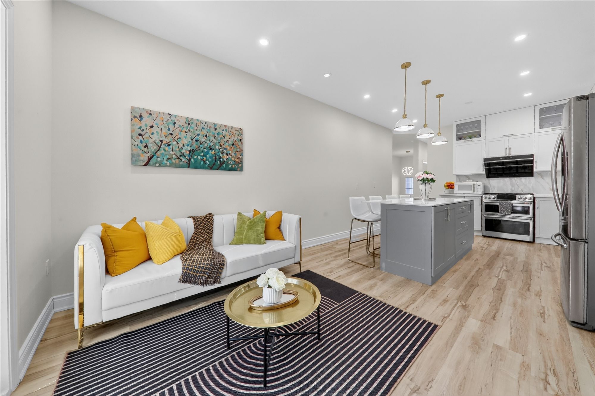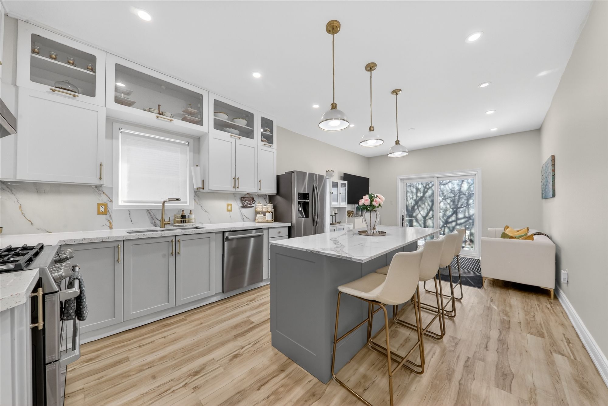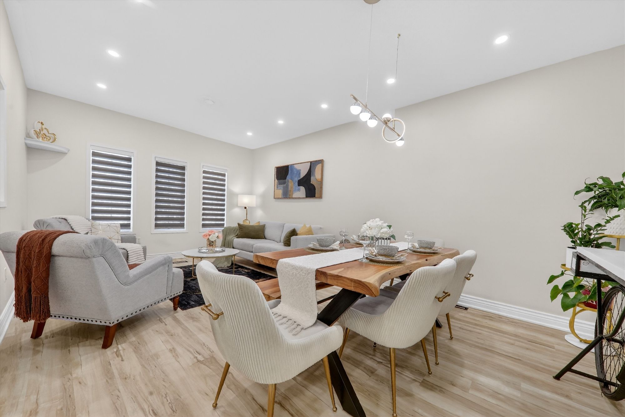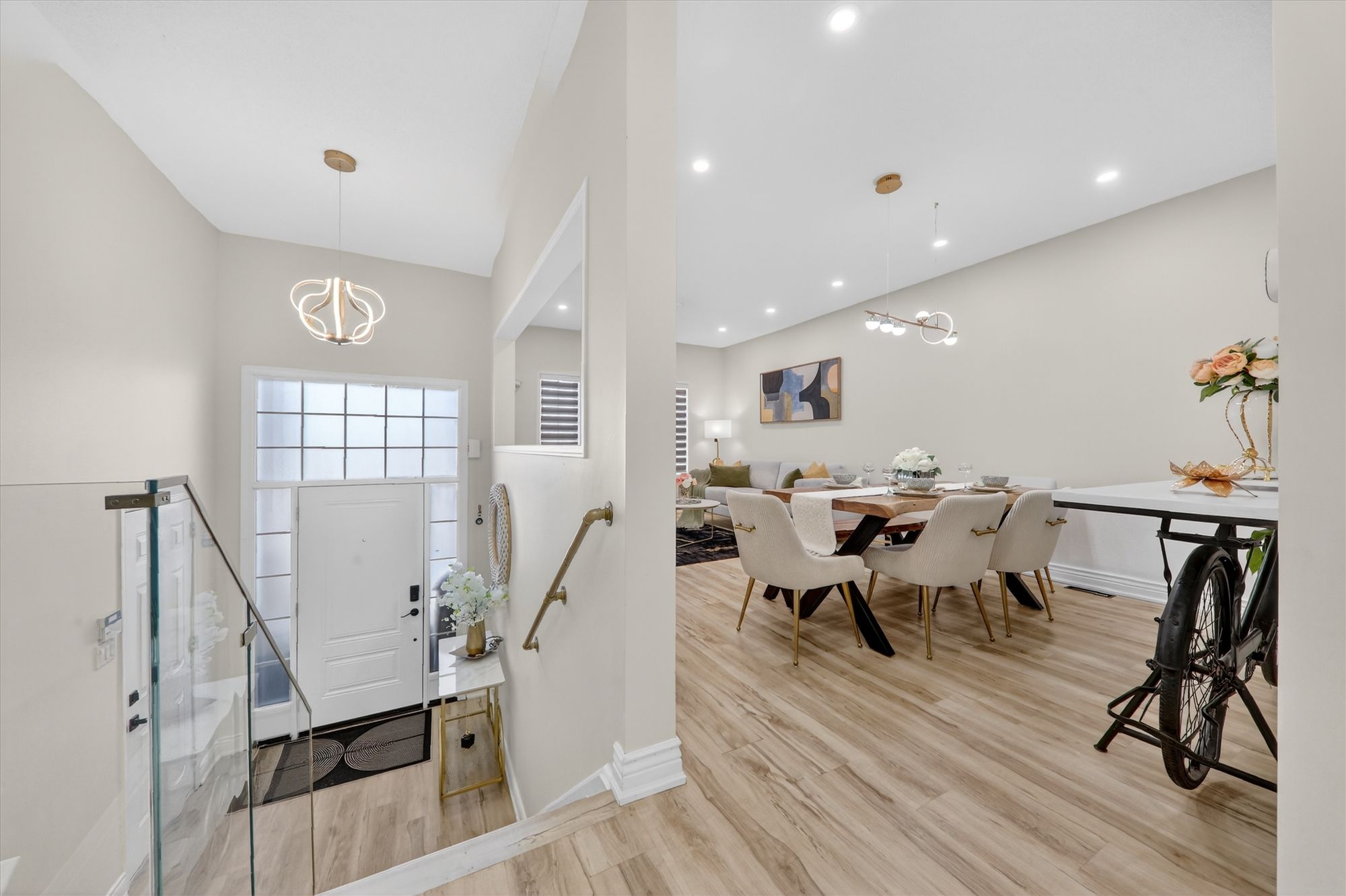 • Sun-filled open-concept main floor with large windows and elegant flooring.