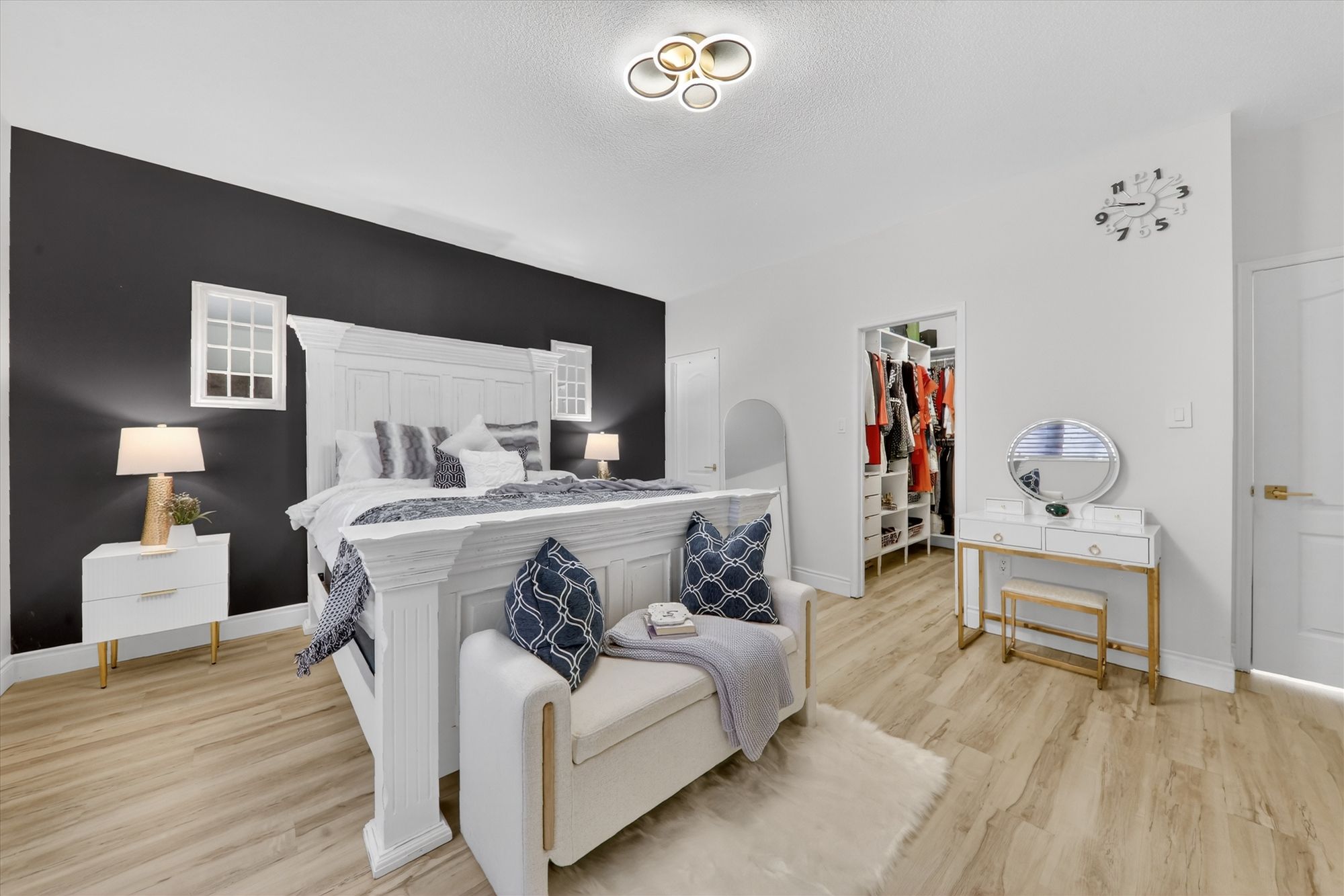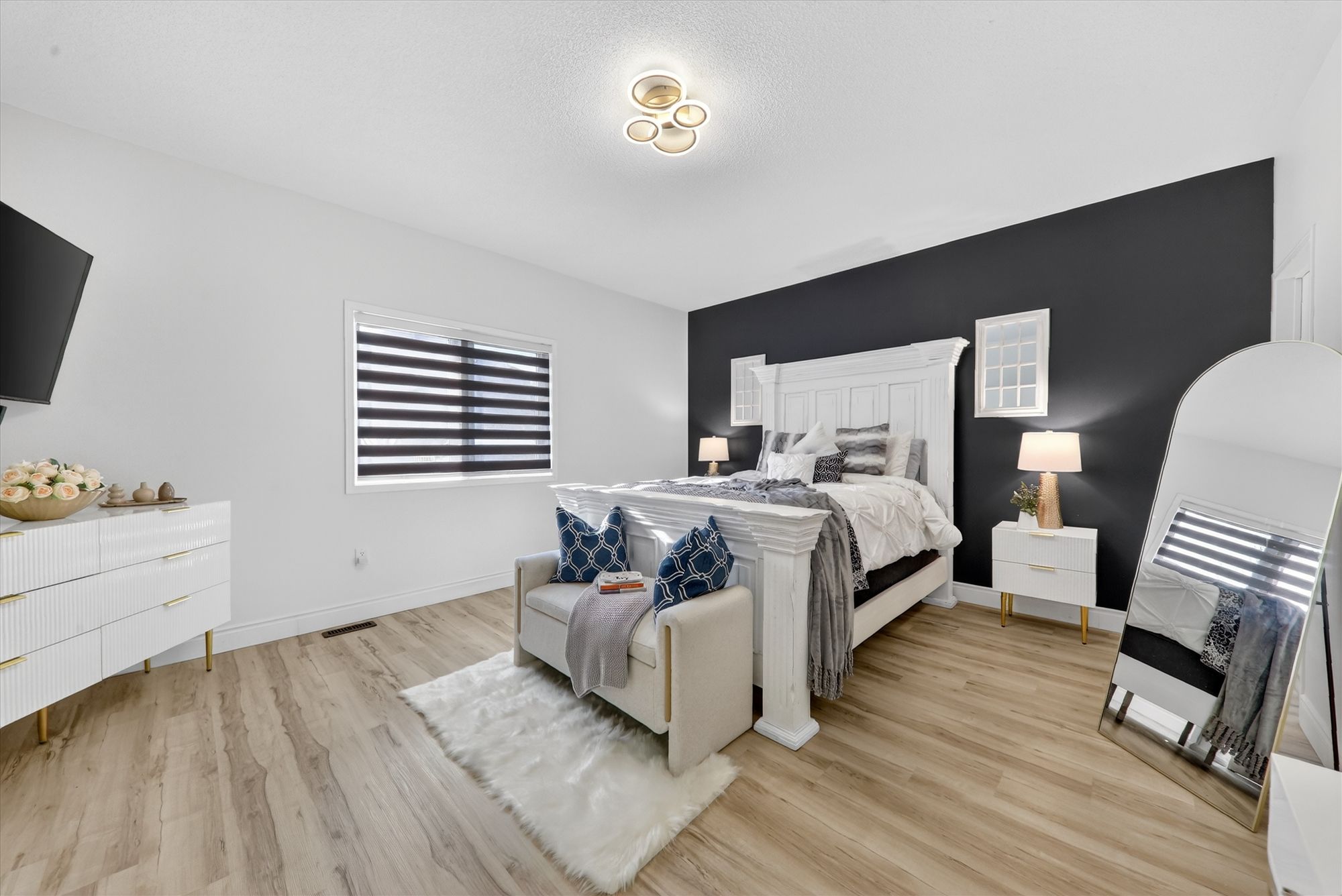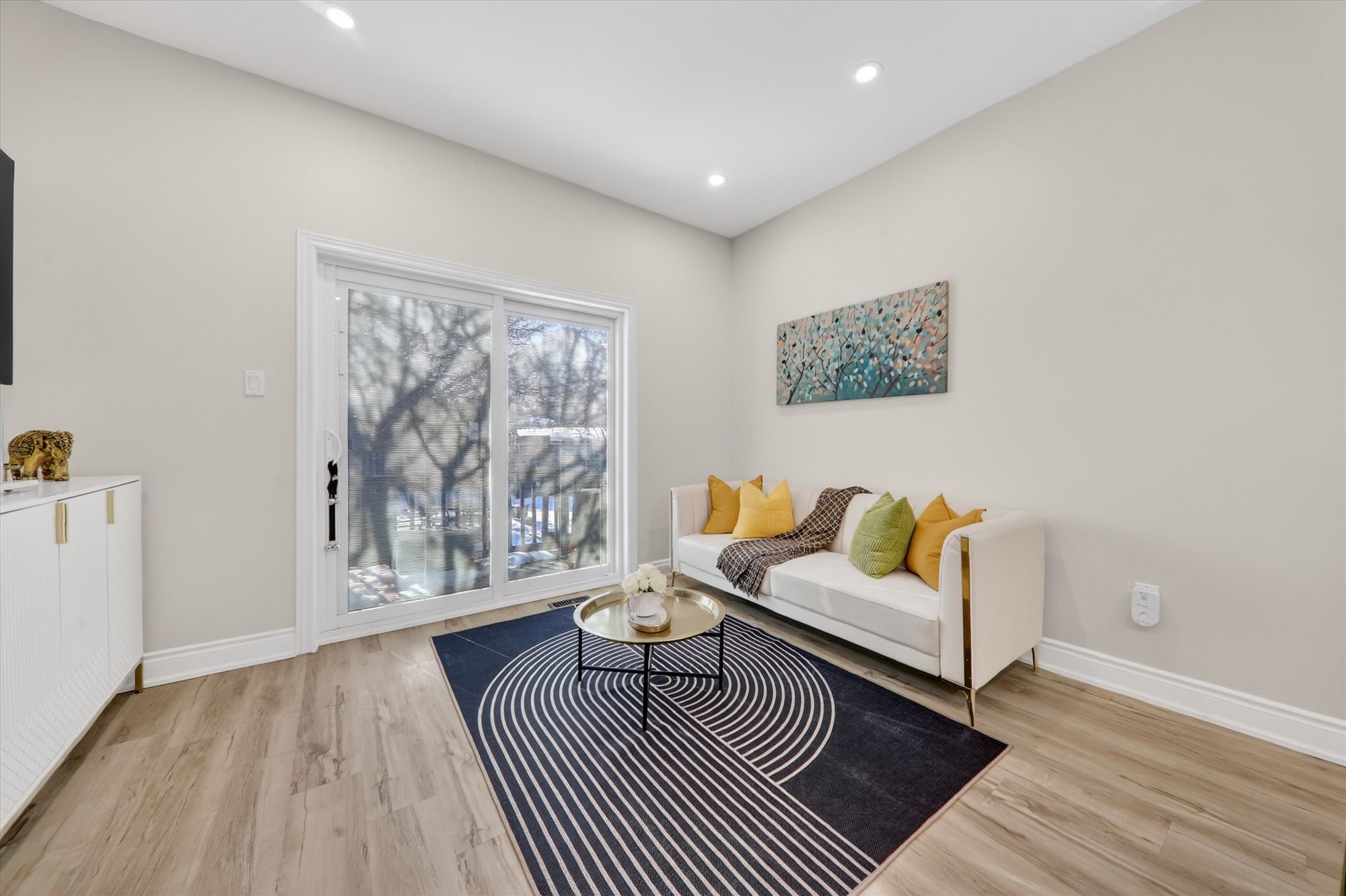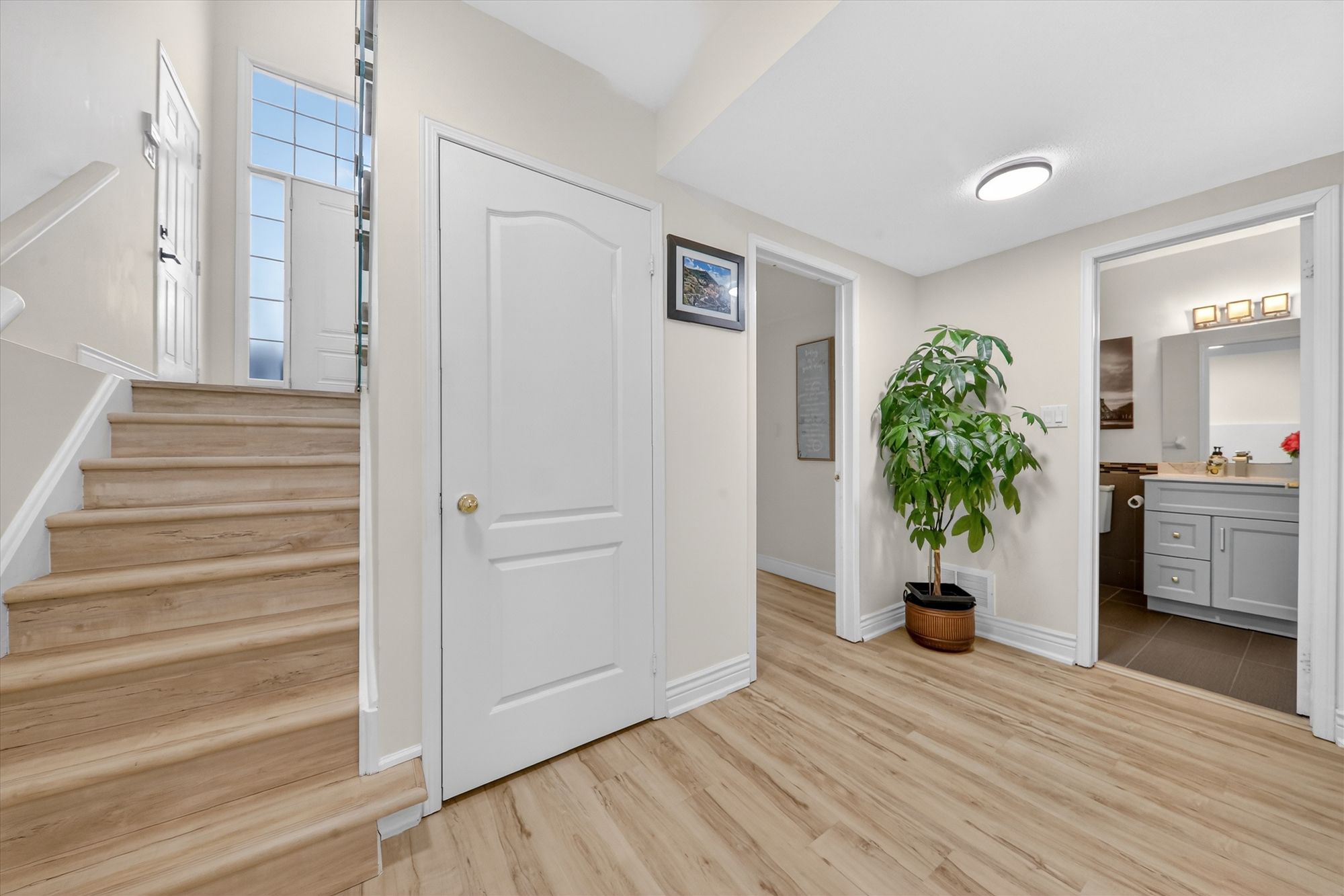 • Sun-filled open-concept main floor with large windows and elegant flooring.