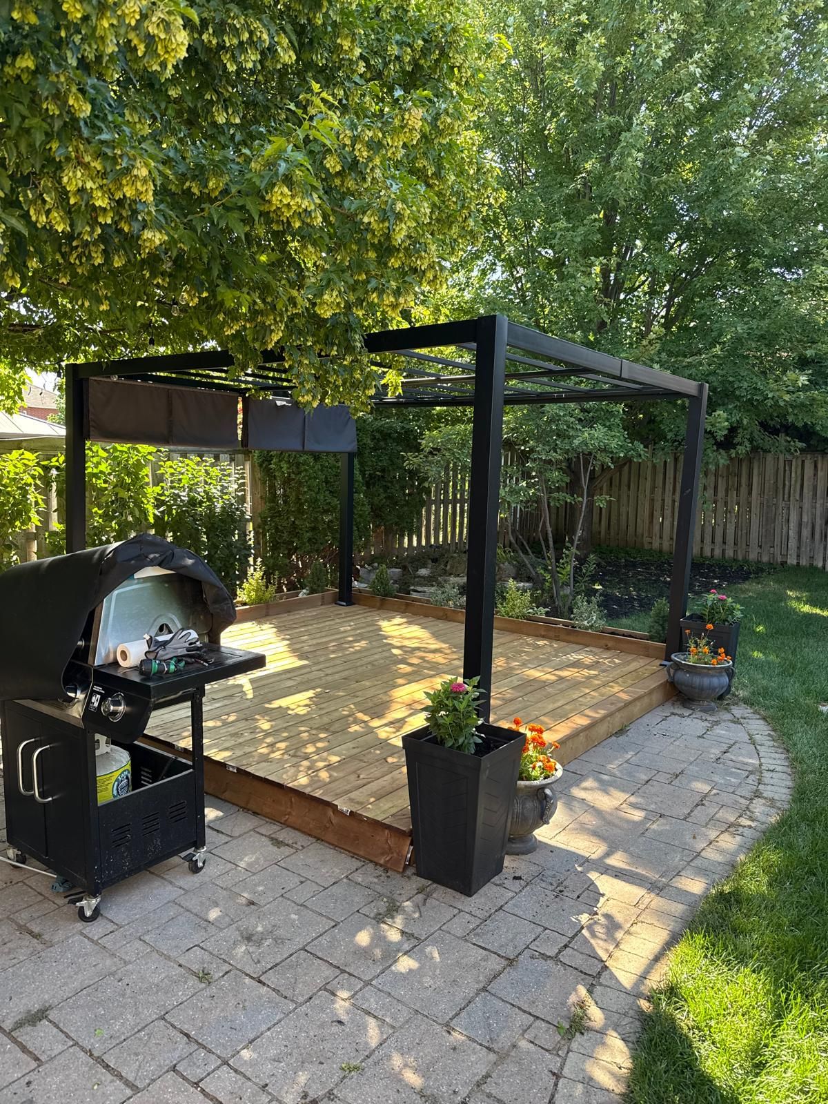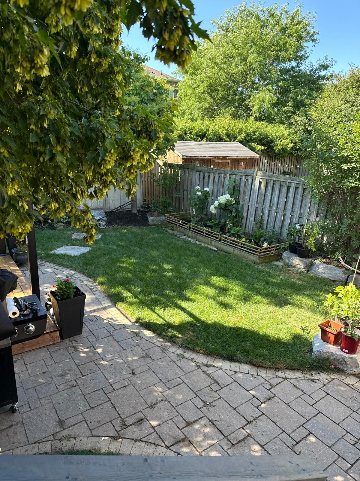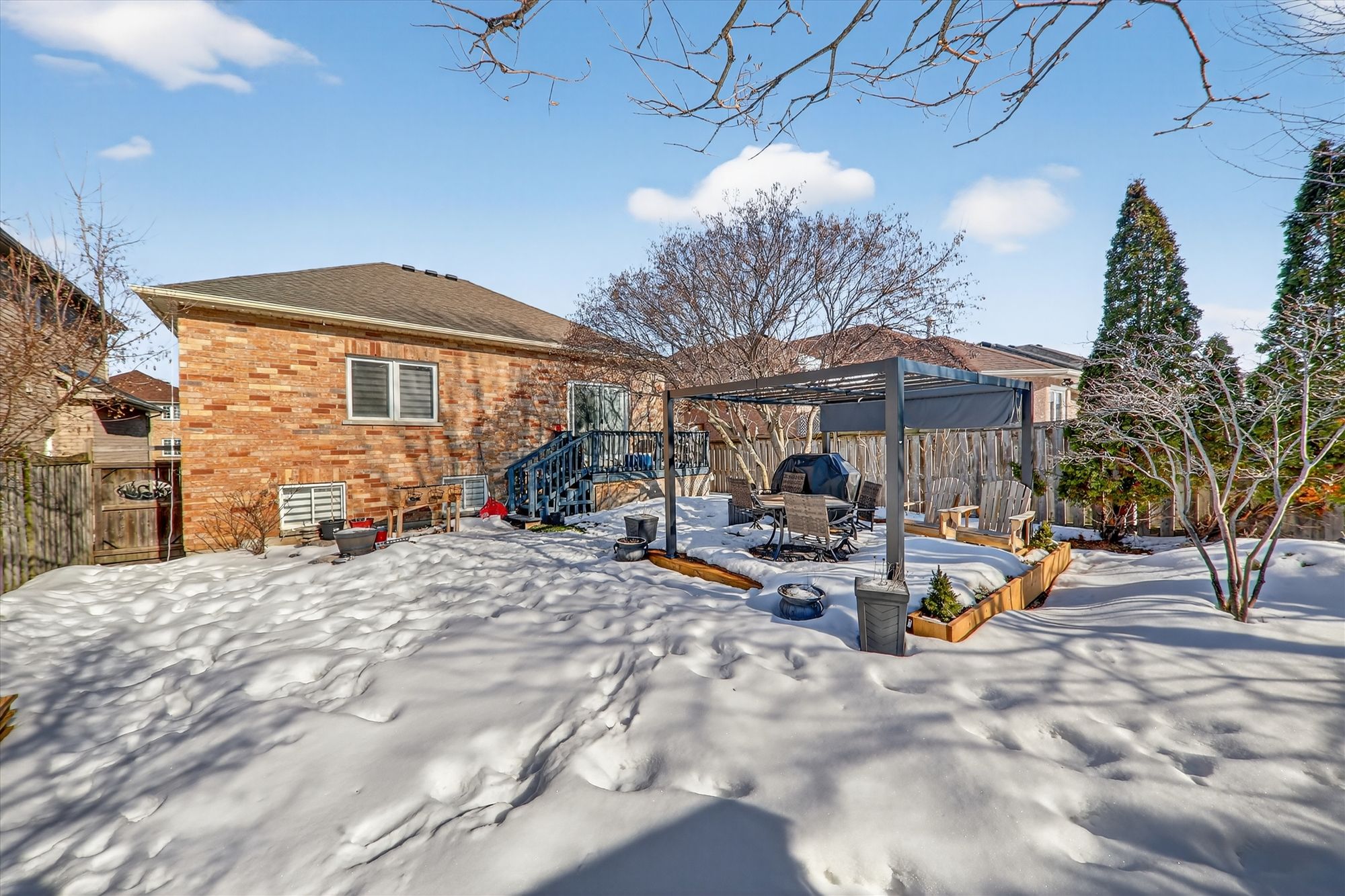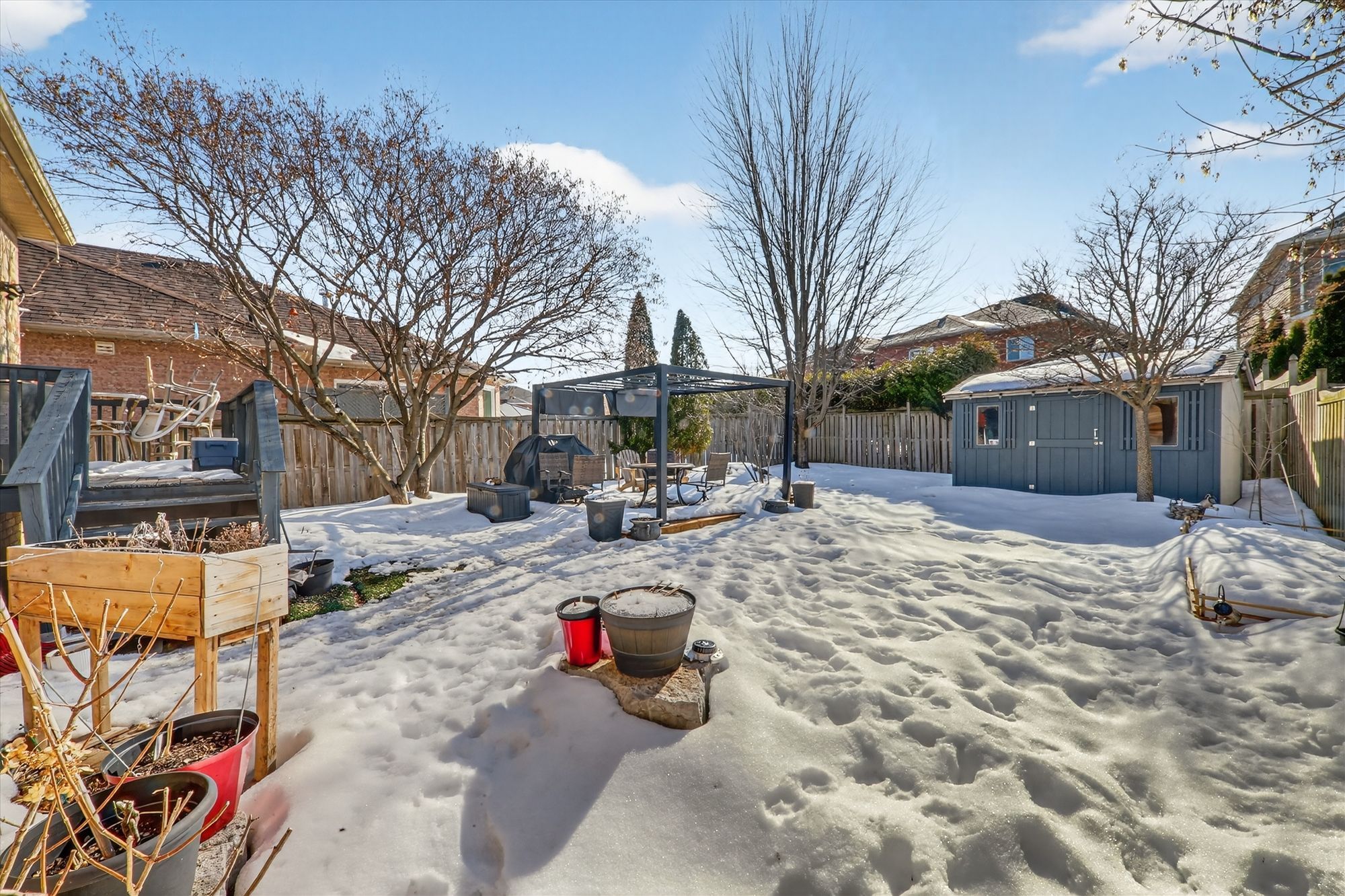 • Large fenced backyard with a deck, gazebo, and relaxation space.