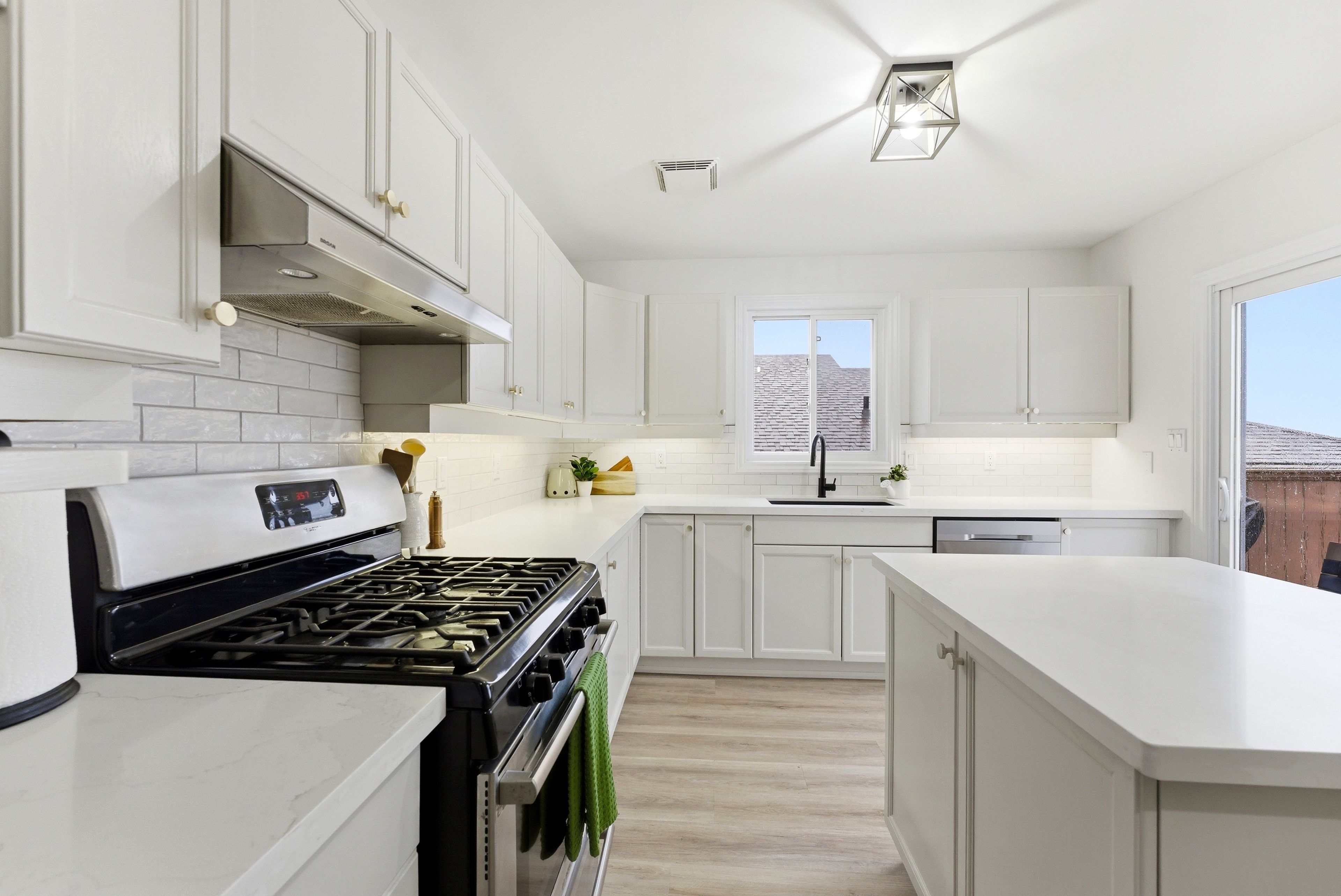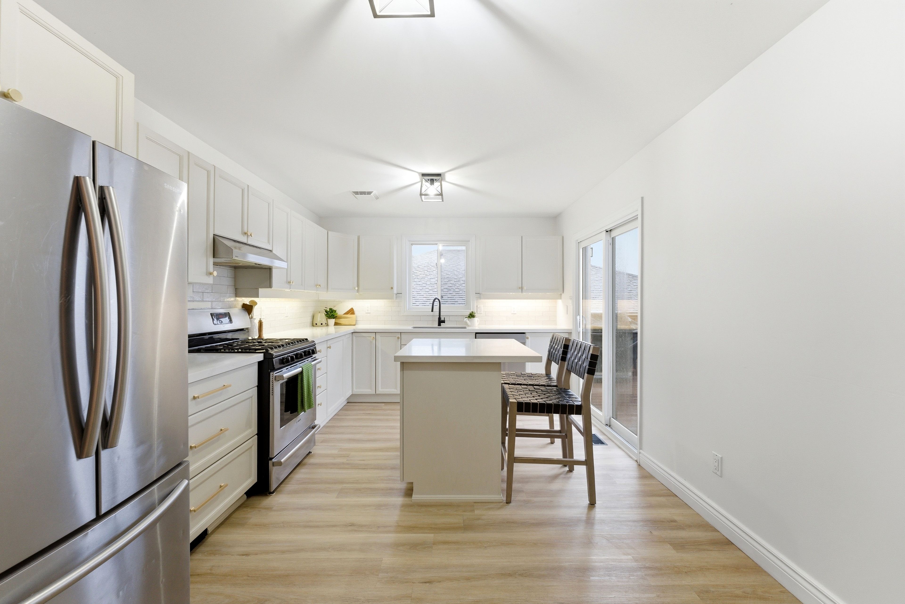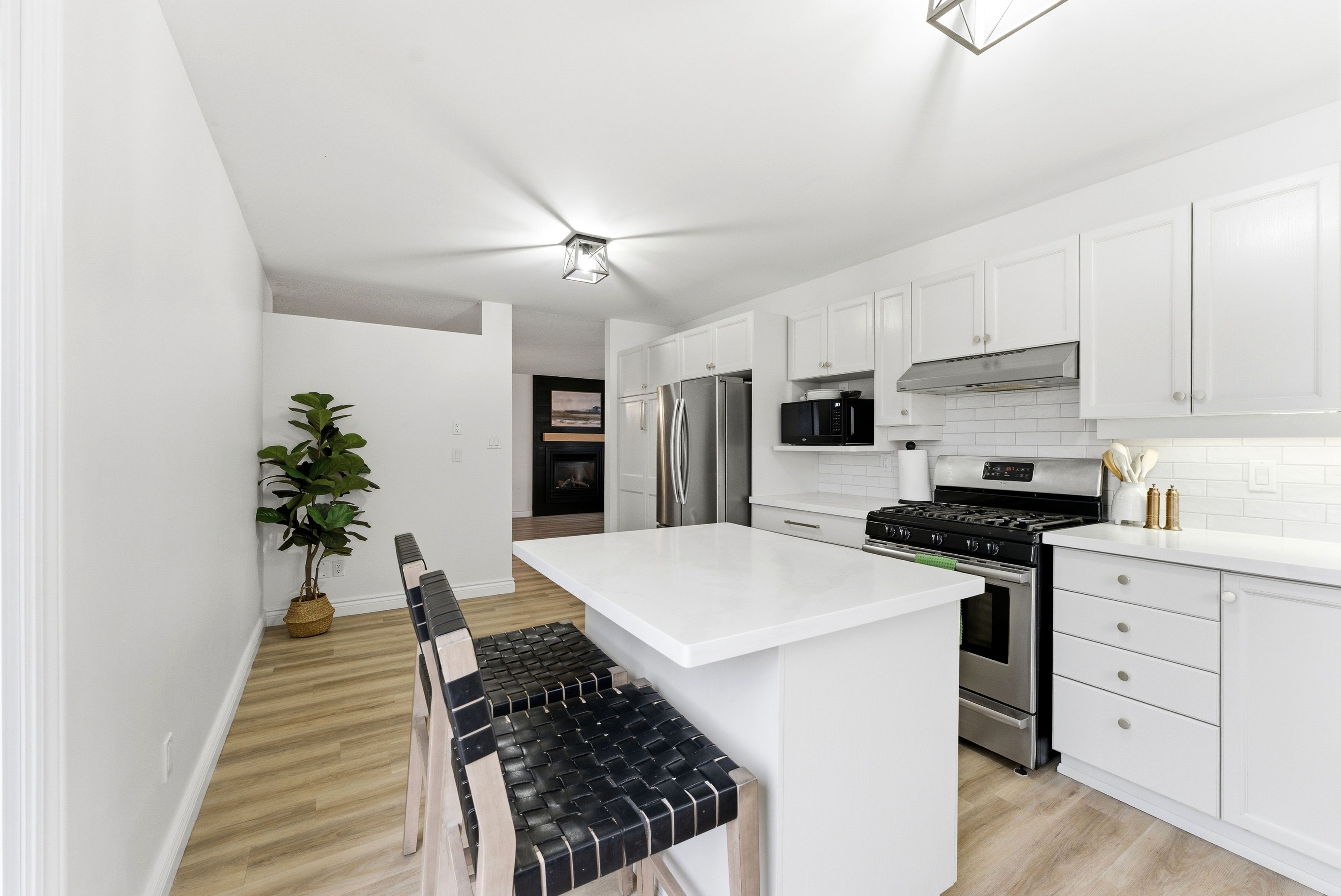 • Modern eat-in kitchen boasts quartz countertops and a gas stove for cooking.