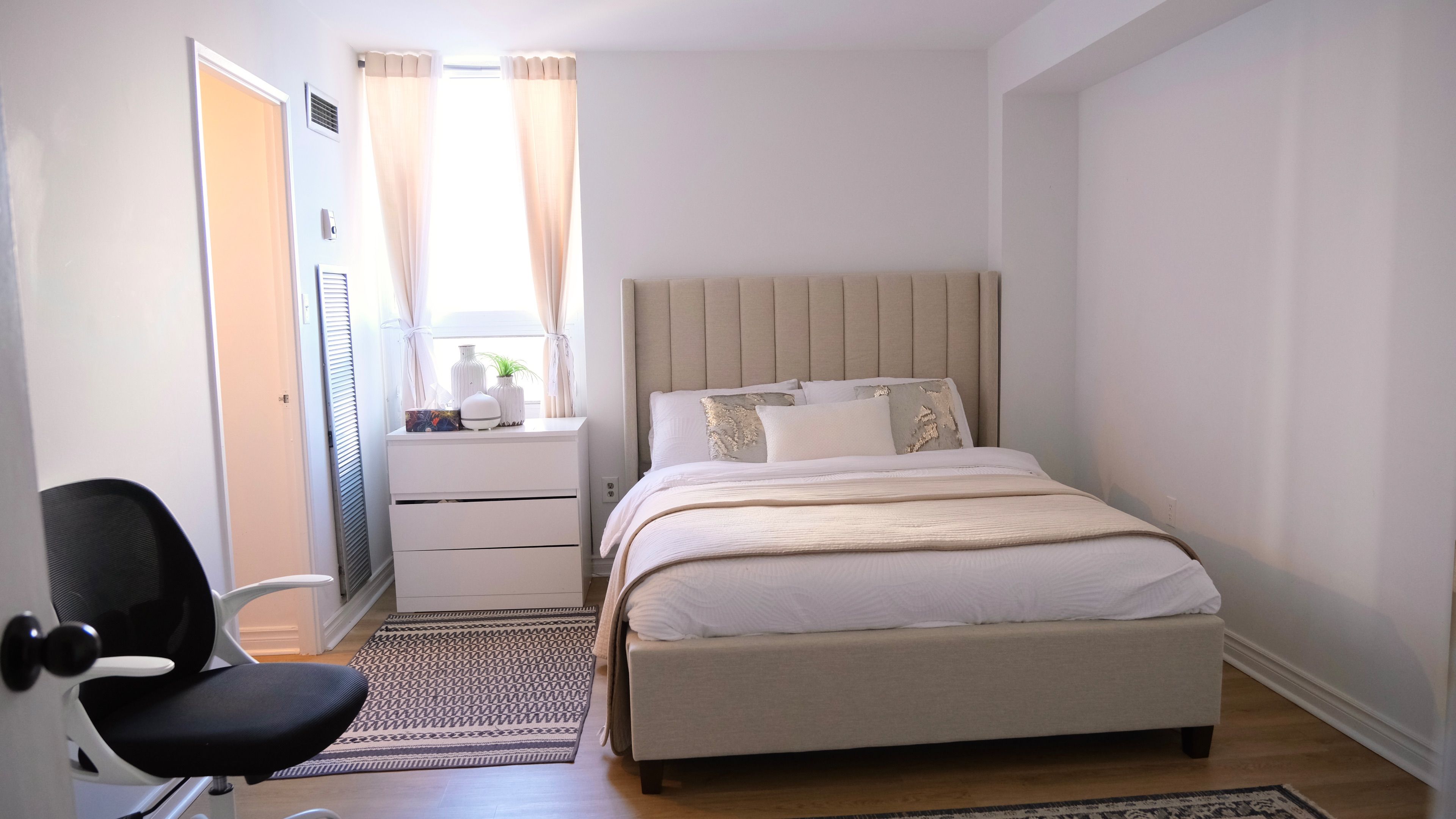 Discover your new home in this spacious three-bedroom apartment all inclusive, offering approximately 1,400 square feet of comfortable living space. Perfectly designed for modern living, this unit combines convenience, style, and practicality. Open concept living & dinning room area with motorized curtains, walk out to extra large balcony for outdoor relaxation, dedicated locker & parking spot with contactless remote entry to the garage, natural sunlight fills the entire unit, newly renovated private kitchen with modern appliances, quartz countertops, and a stylish backsplash, spacious laundry room featuring new washer & dryer, durable and attractive vinyl flooring & freshly paint throughout, each bedroom includes a dedicated closet; two feature walk-in closets, a convenient linen closet in the hallway, a large three-door coat closet at the entryway, master bedroom includes an ensuite powder room. Building amenities includes: spacious dedicated outdoor area with a garden, perfect for hosting events and bbq. Party room: available for hosting events, featuring billiards, concierge and security services available, separate dedicated gym facilities for men and women area walking distance to fairview mall and several other shopping centres, community centres for various activities, close proximity to an elementary school and high school, conveniently close to a grocery store for easy shopping. Tenant agent to verify all measurements & inclusions.