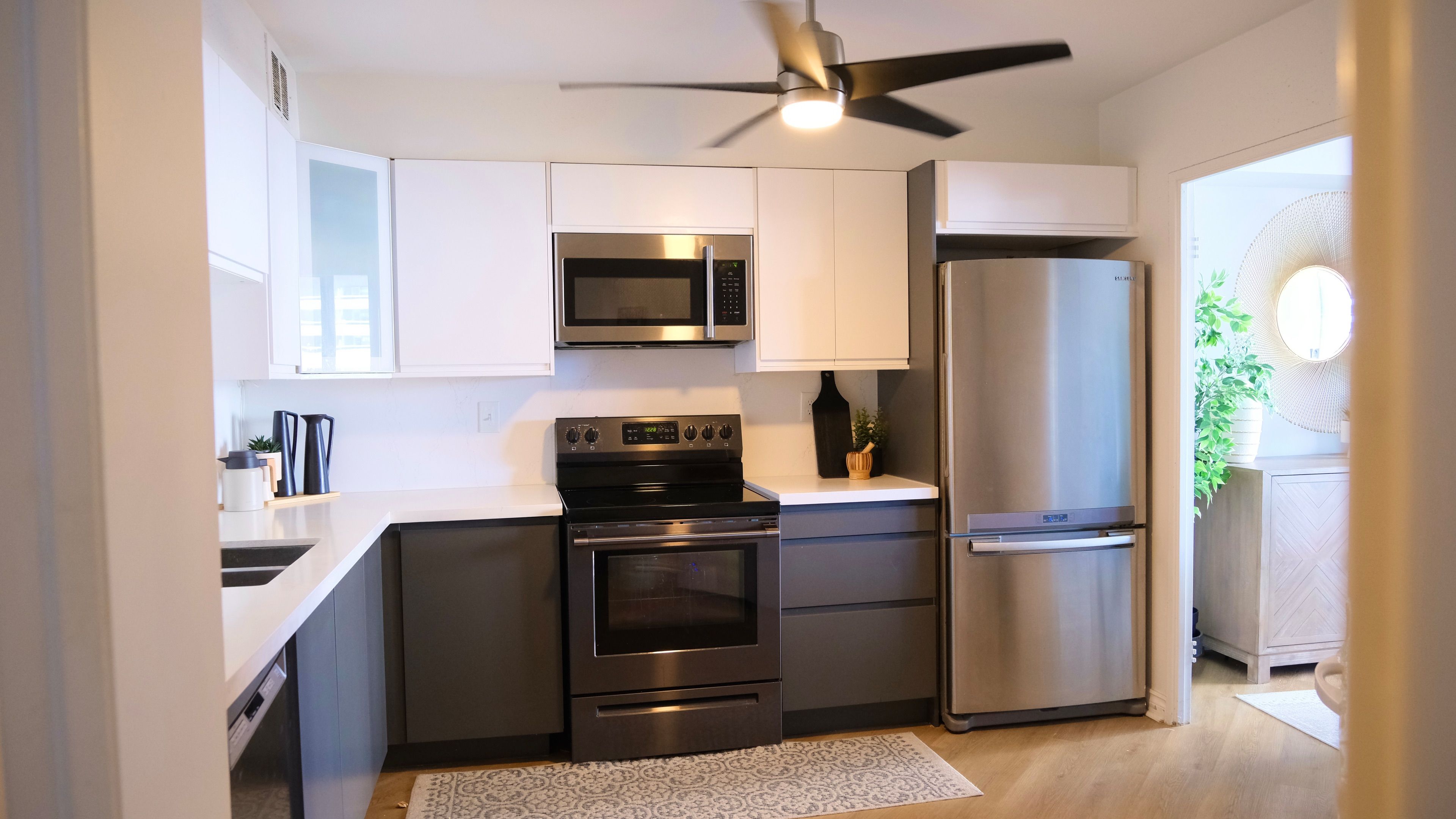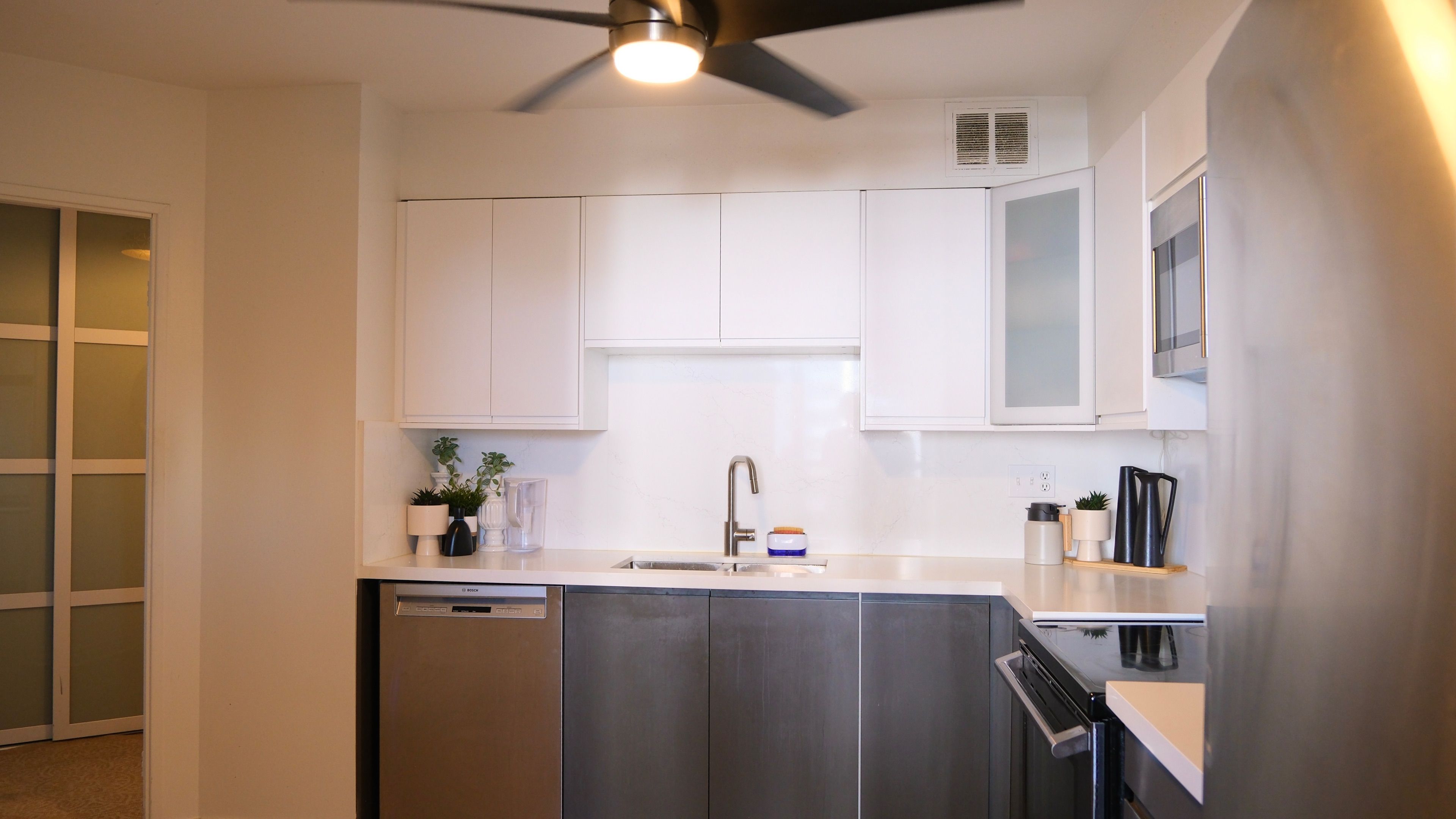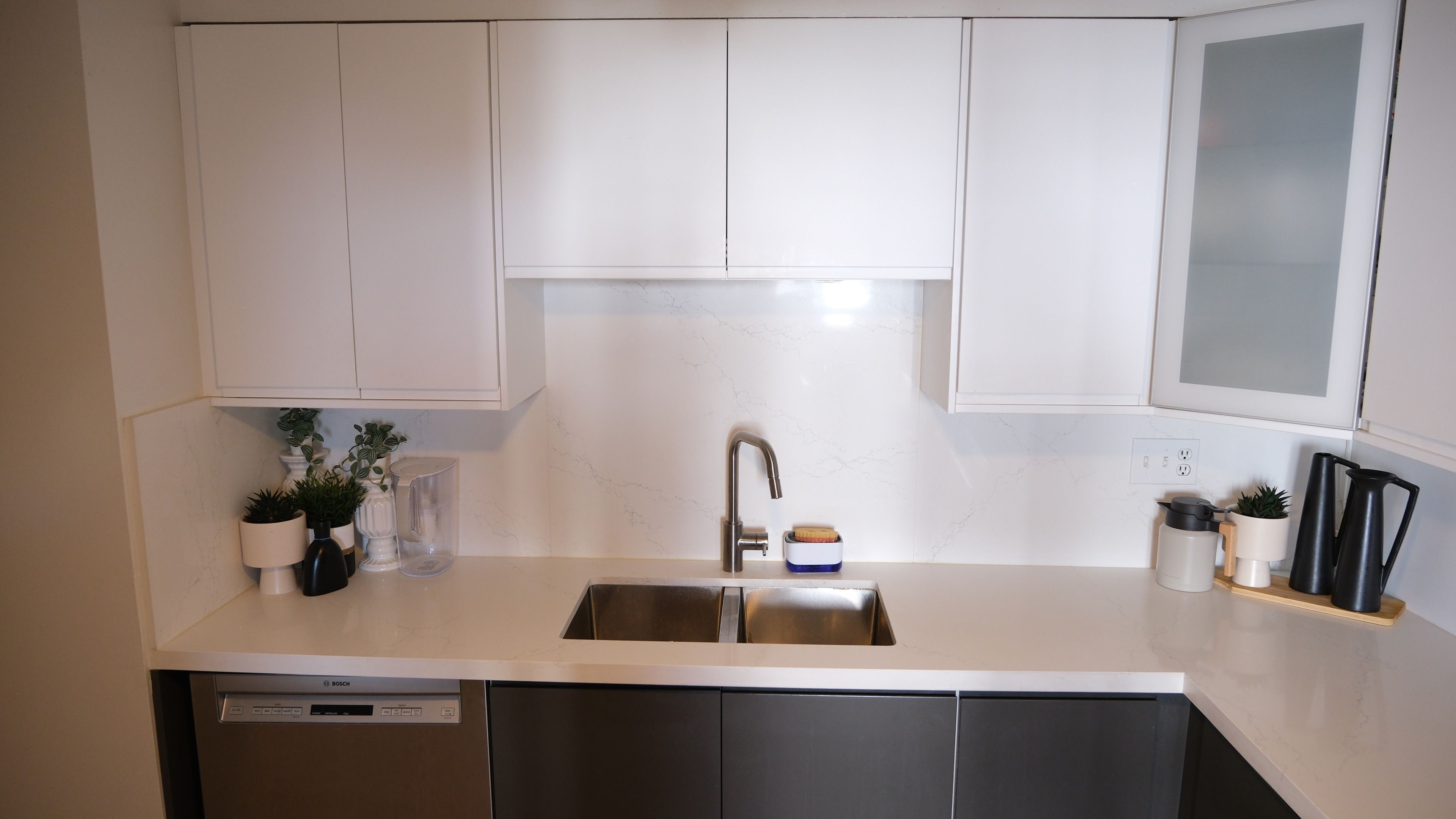 • Modern kitchen with quartz countertops and stylish backsplash.