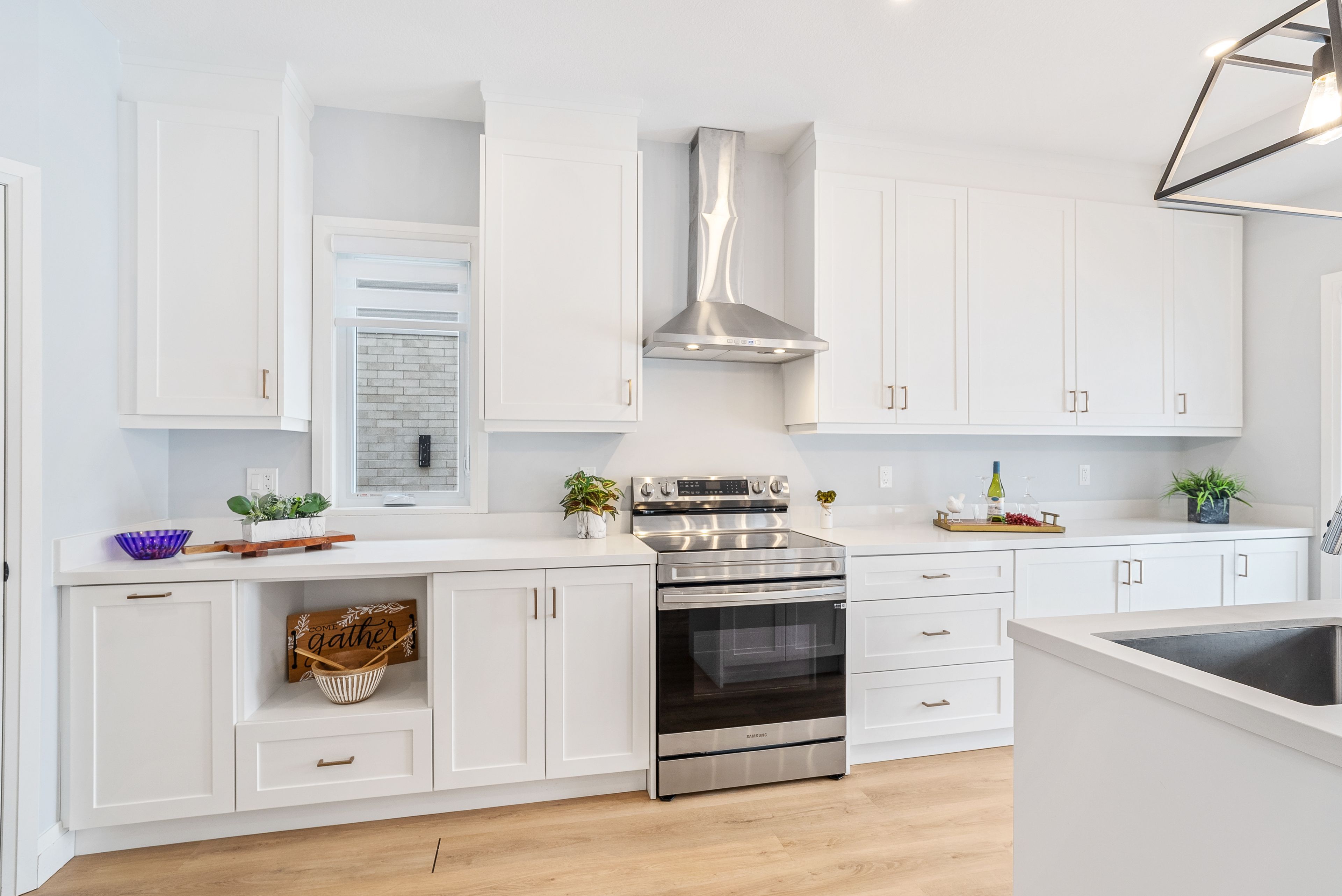 • Modern kitchen features quartz countertops and a walk-in pantry.