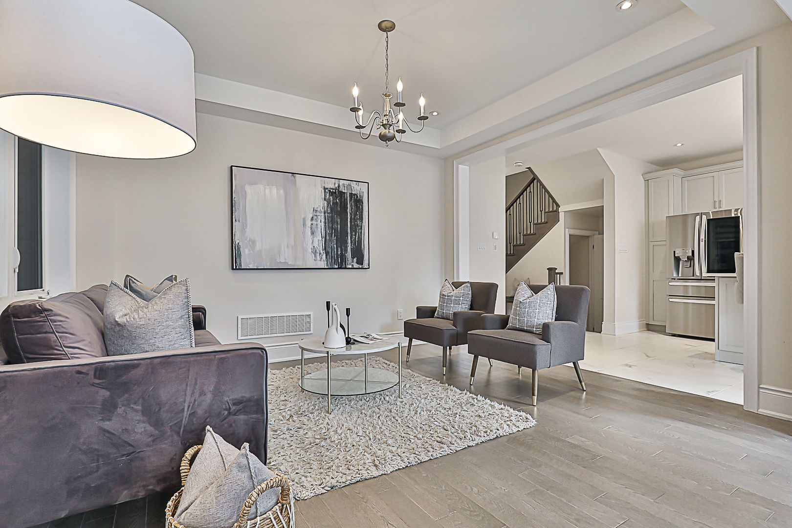 • Upgraded kitchen features quartz counters, island, and modern lighting.