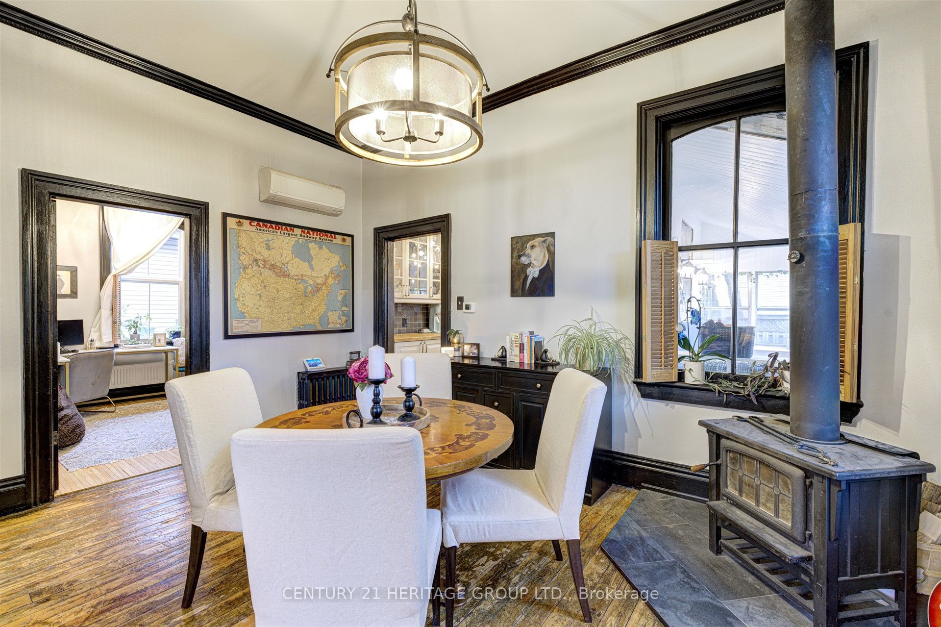 • Cozy dining and living rooms feature hardwood floors and wood stove.