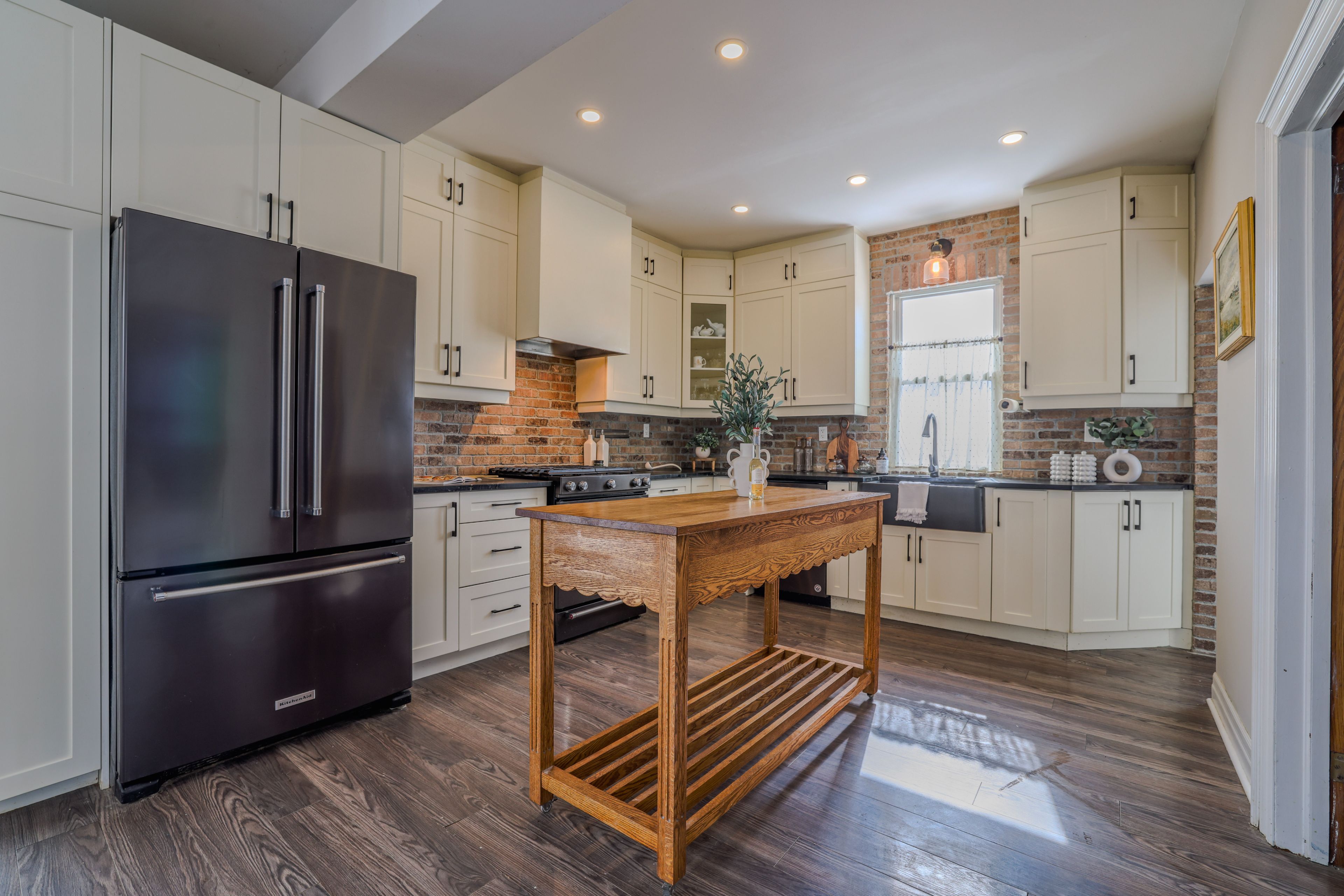 • Spacious gourmet kitchen with ample storage and black stainless steel appliances.
