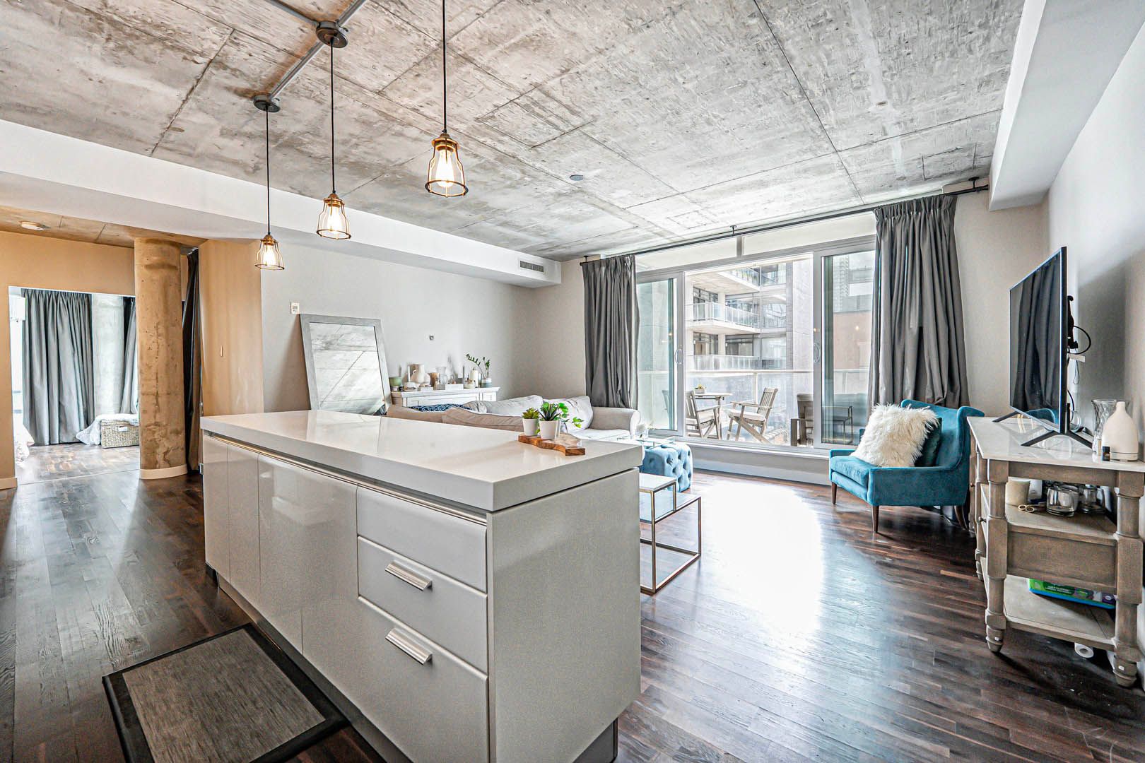 Experience the best of king west loft living at seventy5 portland. This supersized 1-bedroom + den, 2-bathroom corner suite is where bold design meets unbeatable lifestyle. Relax & unwind with almost 1,000 sf of modern, open-concept space curated for both function and flair. Enjoy soaring 9-ft exposed concrete ceilings, and south-facing floor-to-ceiling windows that flood the home with natural light. White modern cabinetry, hardwood floors, quartz countertops & full-sized stainless steel appliances accent an oversized kitchen island that creates a stylish hub perfect for everyday living or effortless entertaining. Retreat to your king-sized primary bedroom, complete with a large walk-in closet and a luxurious 4-piece ensuite featuring a soaker tub and separate glass-enclosed shower. The versatile 11. 28 ft x 10 ft den with a full window offers the ideal flex space for a home office, second bedroom or guest suite, gym or creative studio. Step out through the double glass sliding doors to your private south-facing terrace with a gas bbq hookup with city & sunset views. This is the ultimate urban oasis where you can relax, entertain, and soak in the city skyline. Perfectly positioned in toronto's thriving fashion district, you're steps to king street west, victoria memorial square park, shops & restaurants at the well, queen west, world-class dining, and even billy bishop airport & the waterfront trails. A perfect 100/100 walk & transit score! Parking, locker, and bicycle rack included... Because true downtown living shouldn't mean making any compromises. Ready to elevate your lifestyle? Suite 424 isn't just a condo, it's your next great chapter in refined urban living. Dare to compare.... Exceptional value and location.... See video tour for more!
