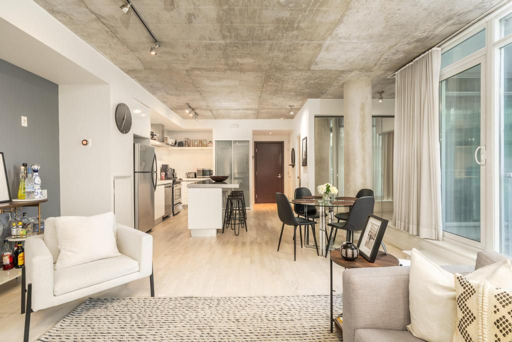 This stunning open-concept loft-style condo is located in one of king west's most sought-after buildings and offers an exceptional layout with hardwood floors throughout, concrete ceilings, and an abundance of natural light. The spacious living and dining areas both provide access to the balcony, making it ideal for entertaining. The gourmet kitchen is truly one of a kind, featuring an oversized centre island exclusive to this unit, complete with a stainless steel countertop, extensive counter space, and exceptional storage. The primary bedroom offers generous space, floor-to-ceiling windows, a large walk-in closet, and a four-piece ensuite. Enjoy 24-hour concierge service with a friendly and attentive staff, all in a prime downtown location just steps from restaurants, nightlife, public transit, and everything the city has to offer. Welcome to your next home.