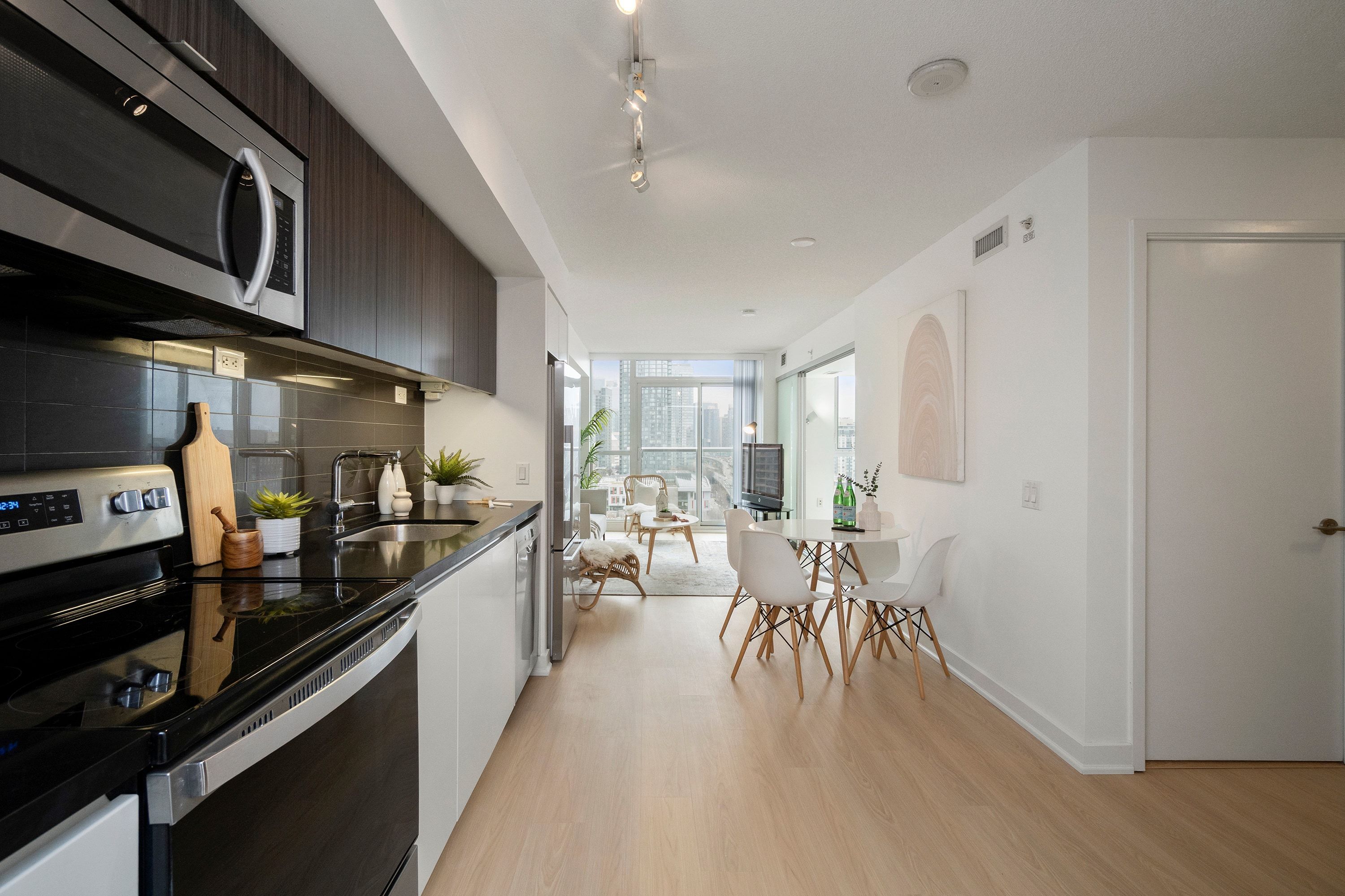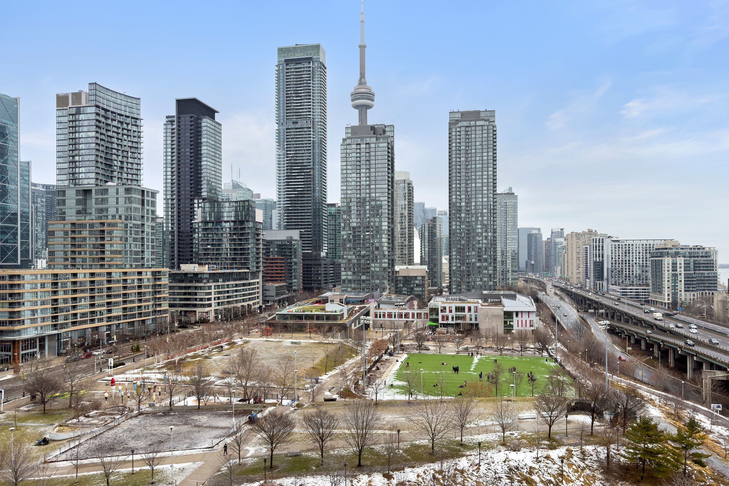 **please click the video tour** this spacious recently renovated 1 bedroom + den unit features an open concept functional layout with no wasted space. 9-foot ceilings and floor to ceiling windows bring in a ton of natural sunlight. Modern kitchen features quartz counters and stainless steel appliances. Large primary bedroom with lots of closet space overlooking the cn tower and city skyline. Oversized den is perfect for a home office. The foyer features a double closet and area to place an entryway bench. Unobstructed east views that can also see the lake. 1 parking space included. Amazing building amenities - indoor pool, sauna, hot tub, basketball court, gym, theatre room, dog washing station, car wash & more. Steps to queens quay, waterfront walking & bike trails, groceries, banks, restaurants, financial district. Very transit friendly and easy access to dvp & gardiner. Recent renovations include new vinyl floors with underlayment, repainting all walls, and replacing 1 set of blinds.