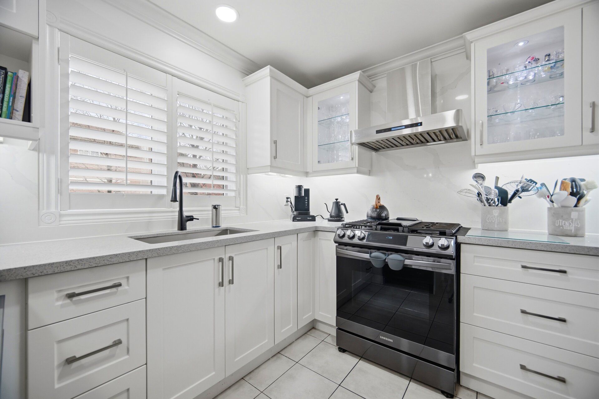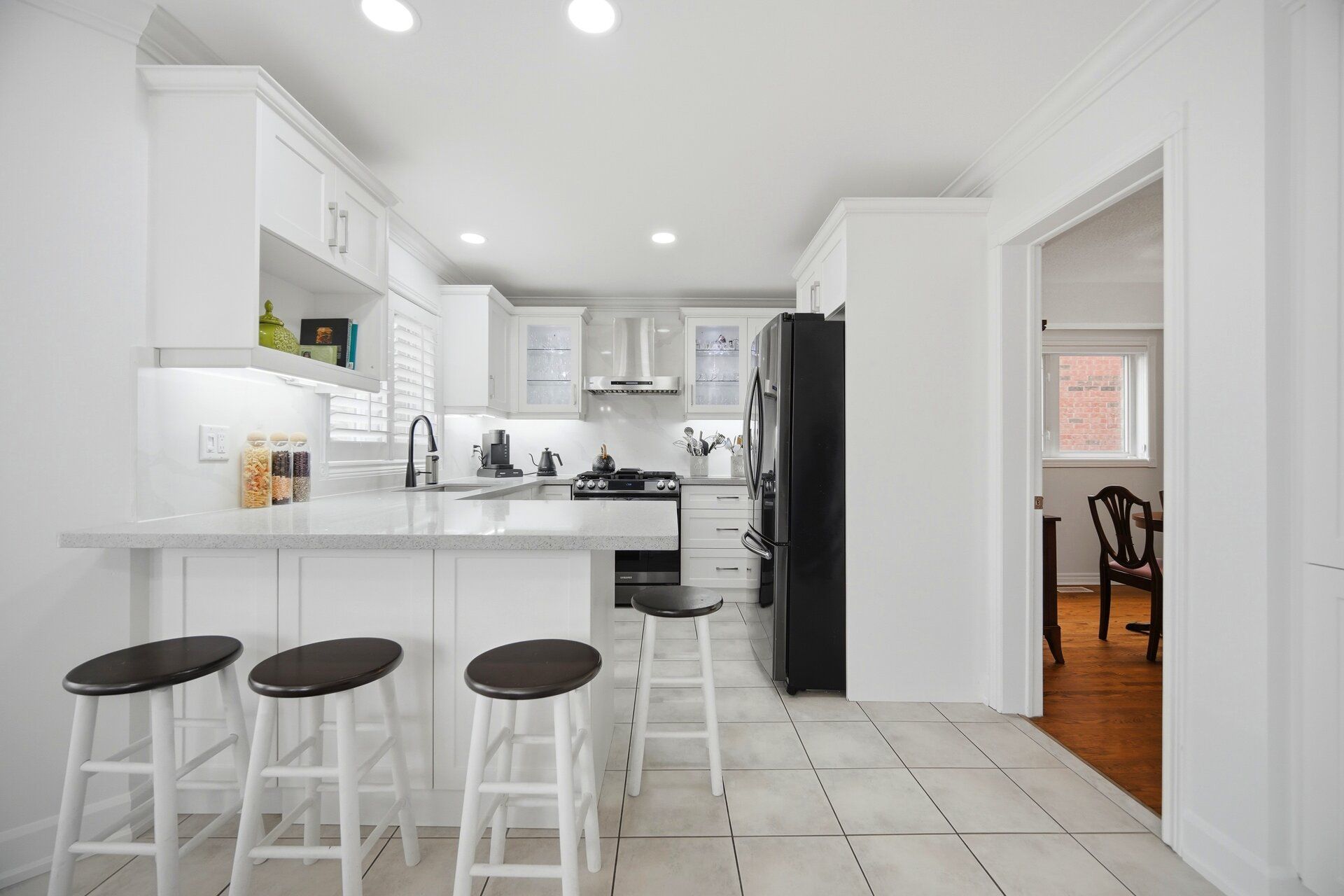 • Renovated kitchen with modern cabinetry, quartz countertops, and breakfast bar.