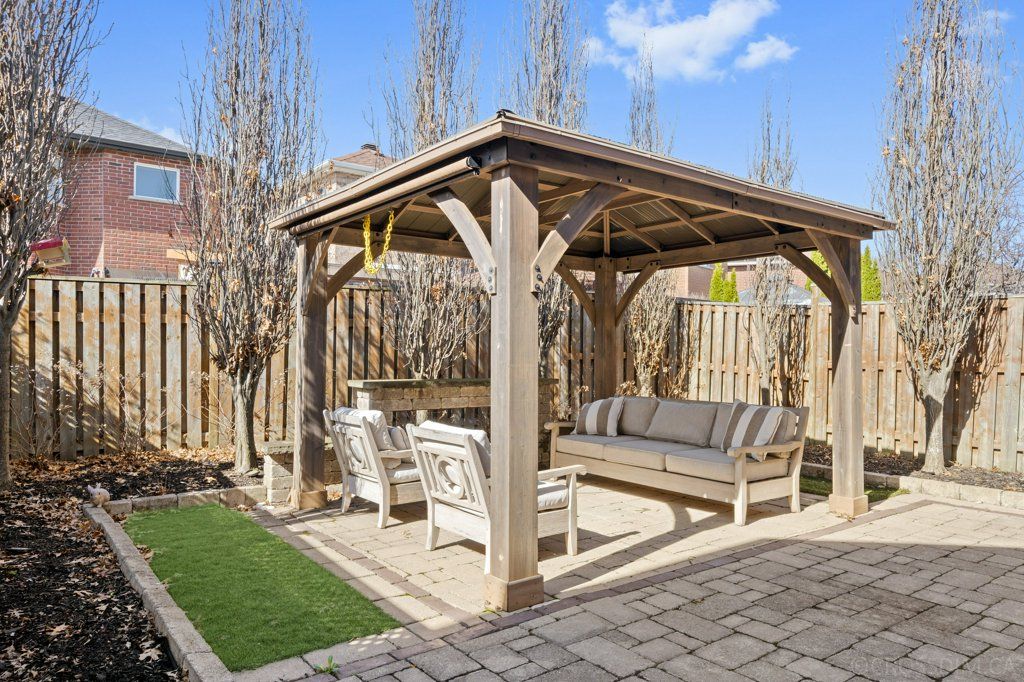 • Private backyard oasis with gazebo, patio, and gardens.