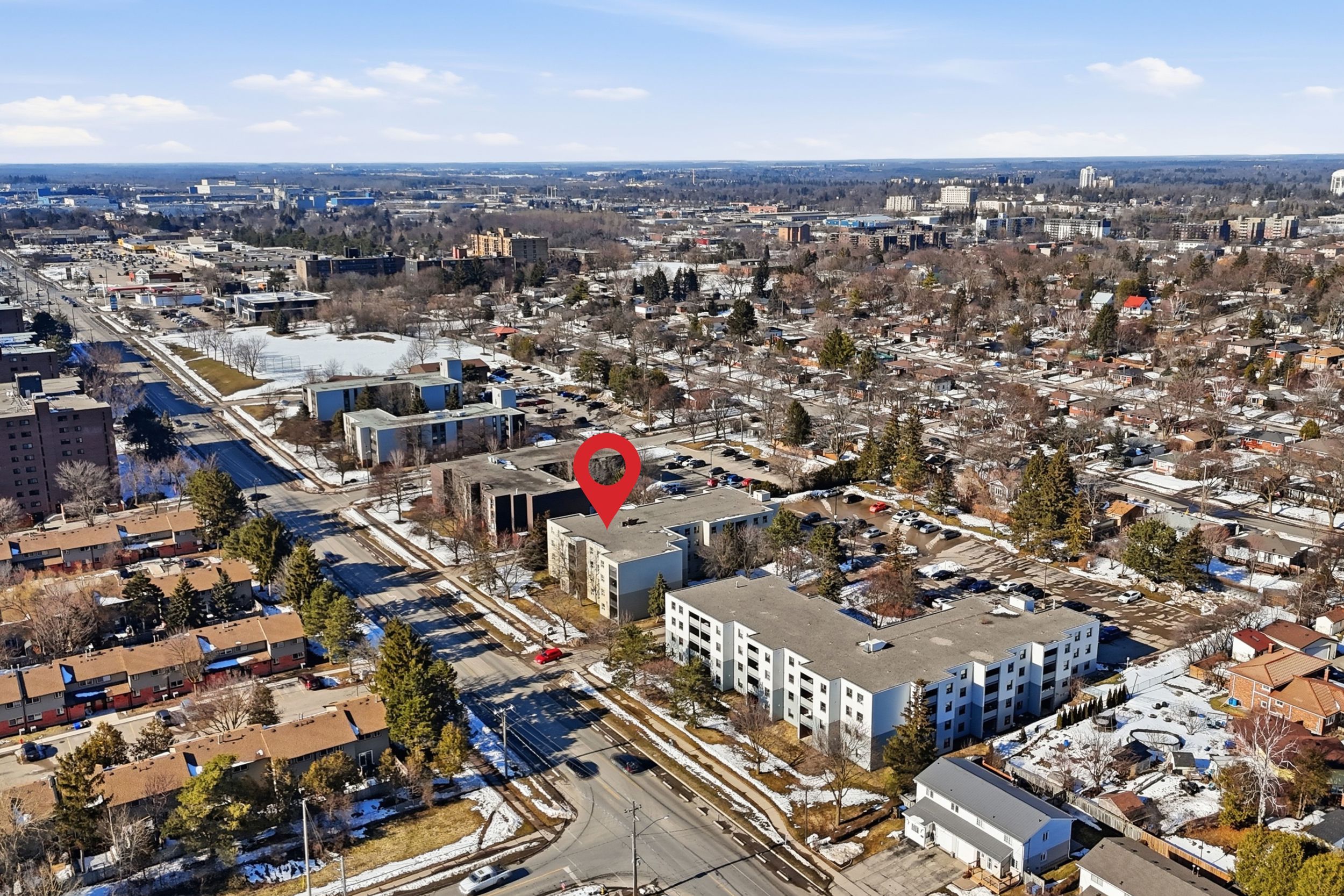 Welcome to 75 silvercreek parkway north, unit 308, located in guelph's west end. This bright, spacious, and updated corner unit is move-in ready. The two-bedroom, one-bathroom home features a fresh neutral paint palette and carpet-free living with luxurious vinyl plank and tile flooring throughout. The large living room leads to a private covered balcony with sliding doors, and large windows in every room provide ample natural light. The kitchen offers a sleek, contemporary design with pot lights, abundant cabinetry, a beautiful tile backsplash, and recently updated appliances (2024/2025). The kitchen flows seamlessly into the dining room, perfect for family dinners and entertaining. The primary bedroom includes a walk-in closet, and this unit offers plenty of storage throughout. For added convenience, the unit is located near the elevator and includes a dedicated parking spot close to the building entrance, along with ample visitor parking. Ideally situated near schools, parks, restaurants, the hanlon parkway, and the university of guelph, this property is an excellent opportunity for first-time buyers, young families, investors or those looking to downsize. This is one unit not to be missed!