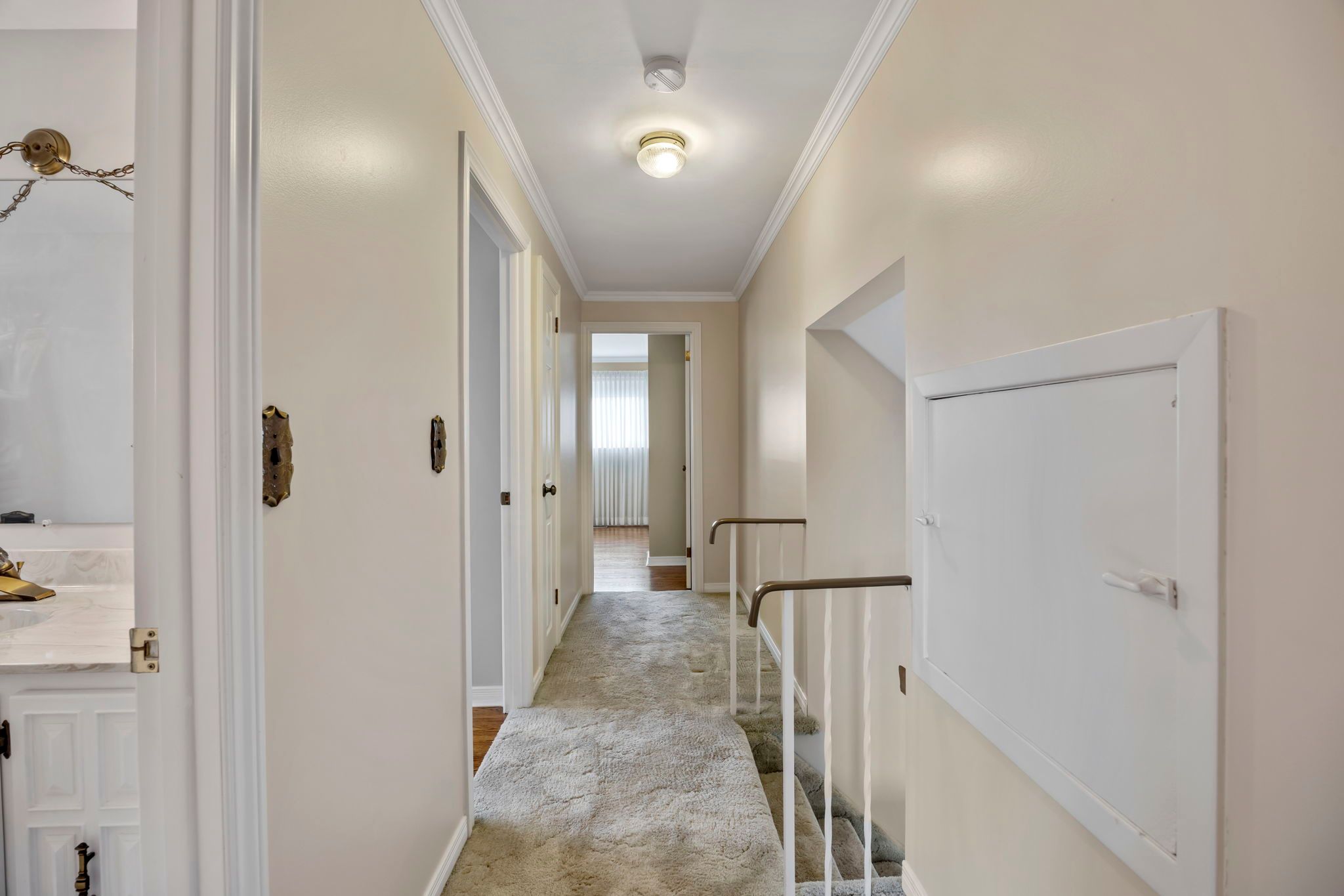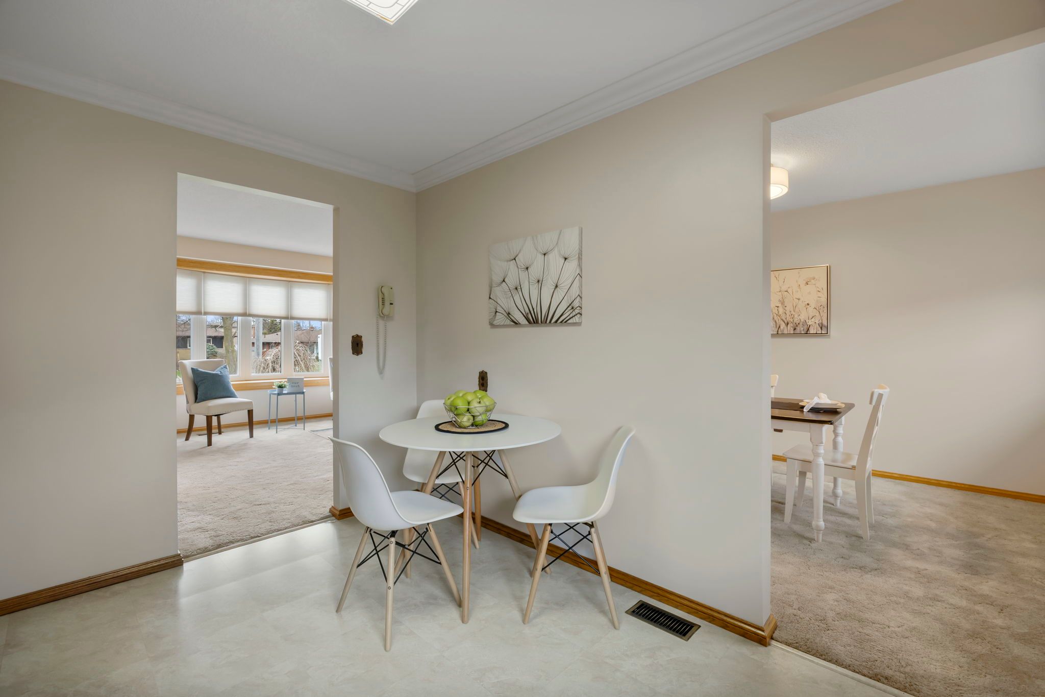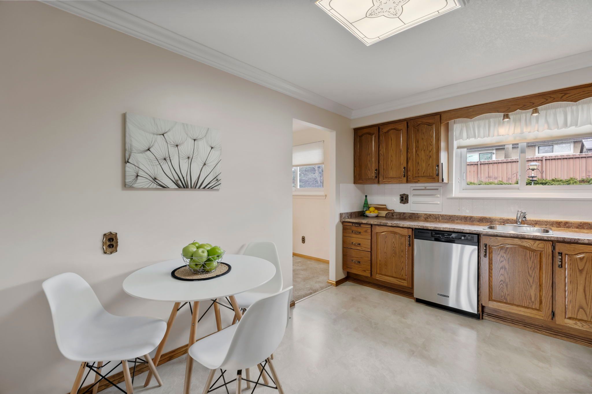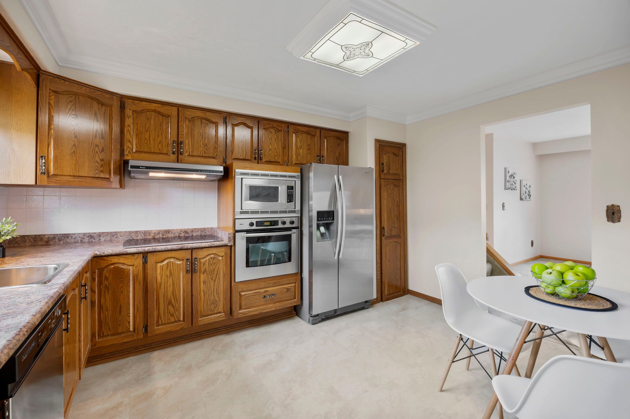 • Eat-in kitchen featuring stainless-steel appliances and crown mouldings.