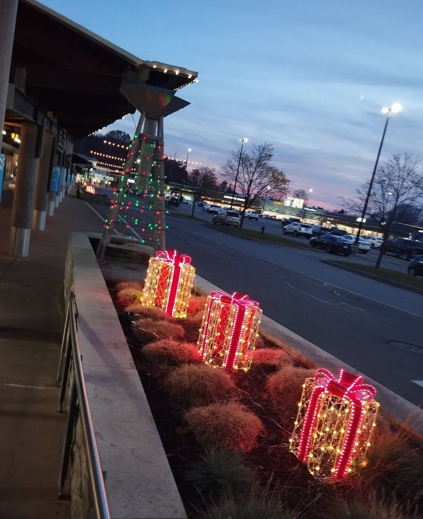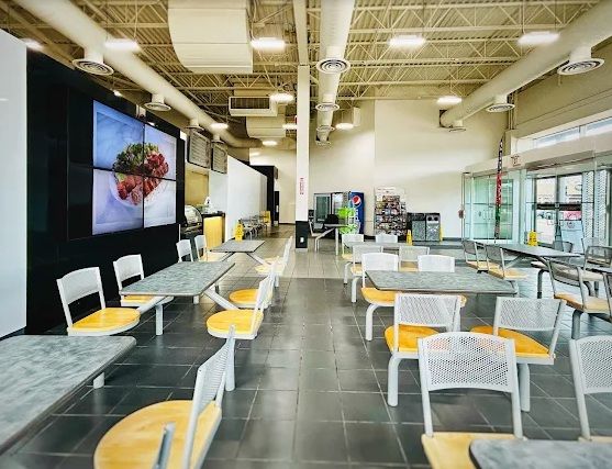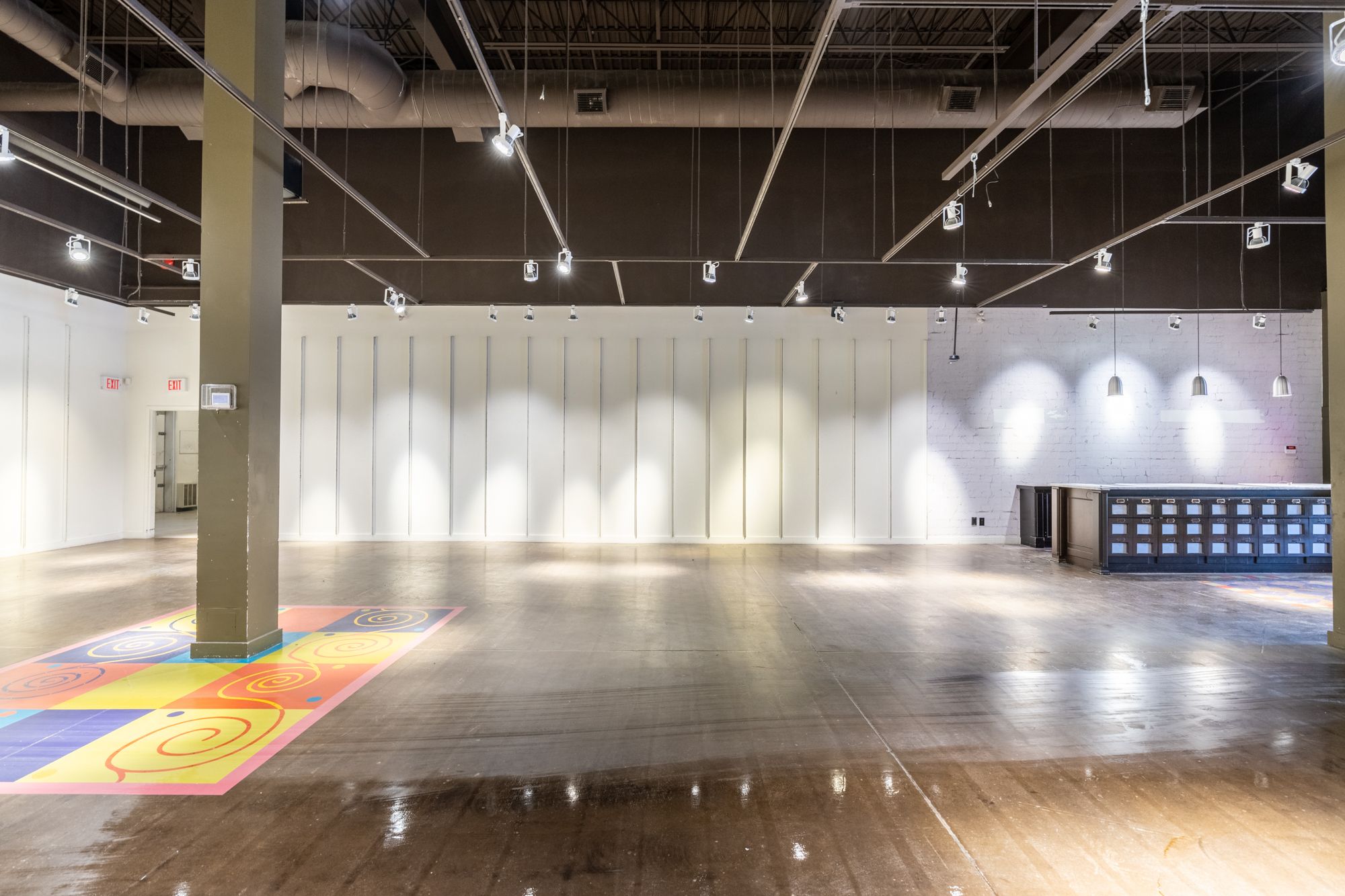 • High ceilings and vibrant atmosphere near popular retail businesses.