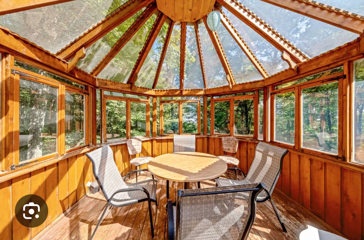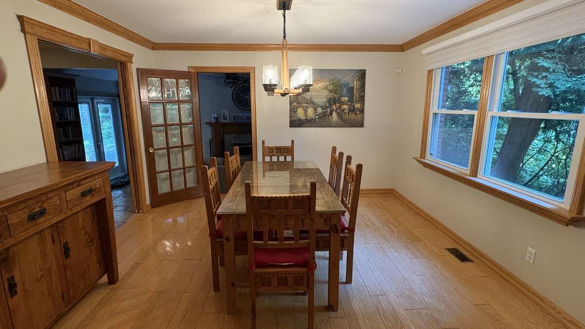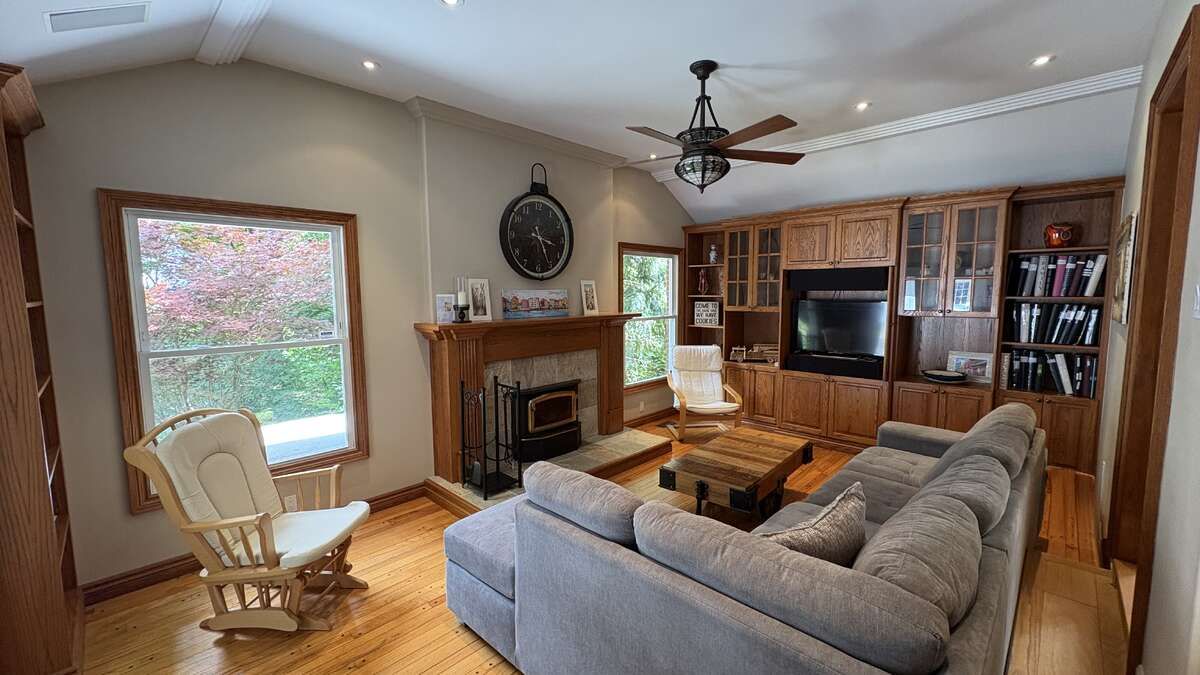 • Cozy den with built-in bookshelves and a wood burning fireplace.