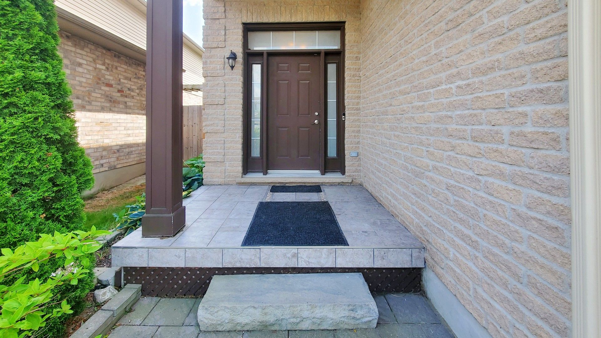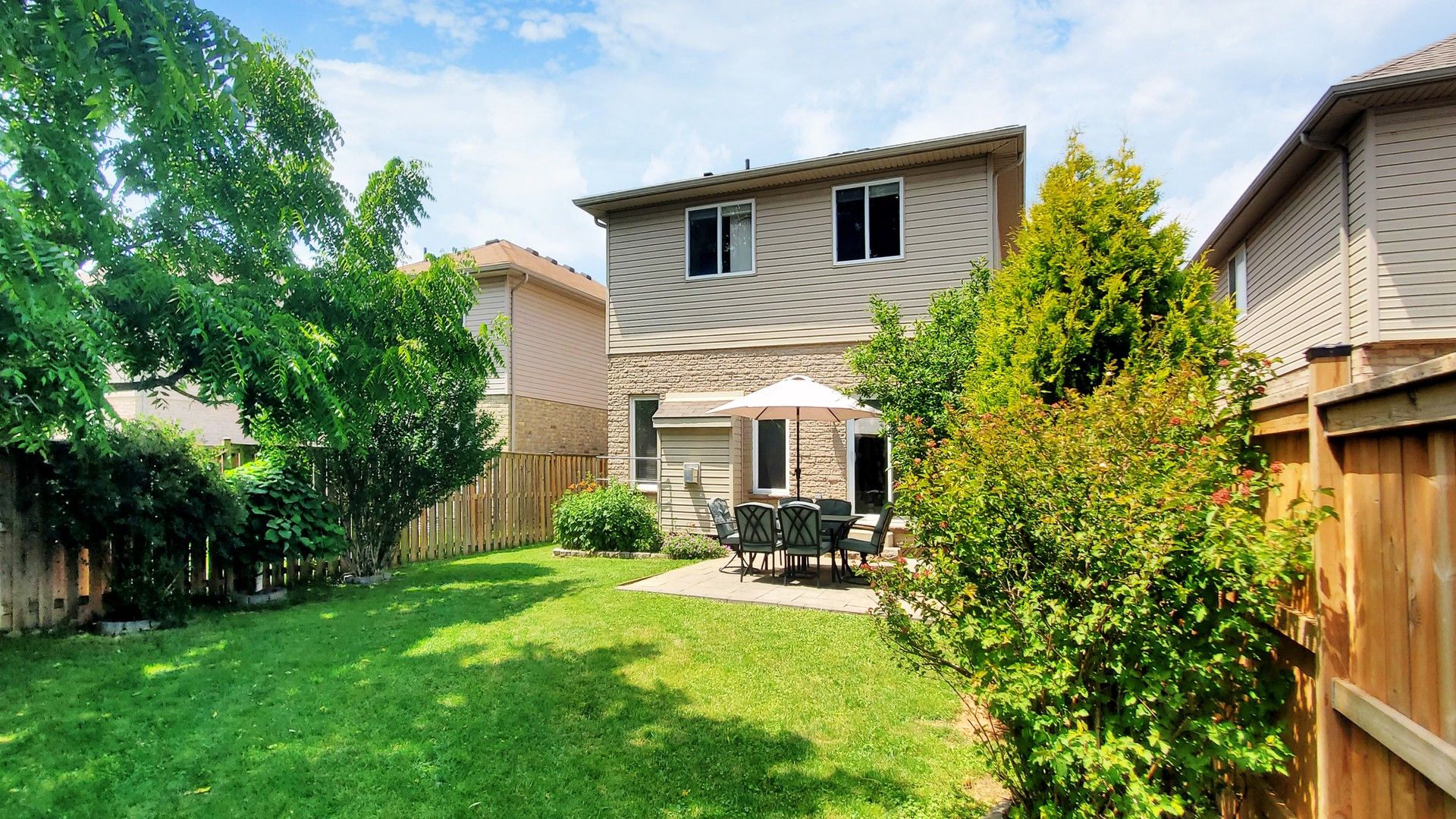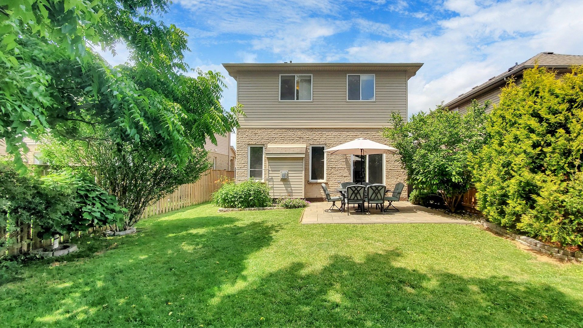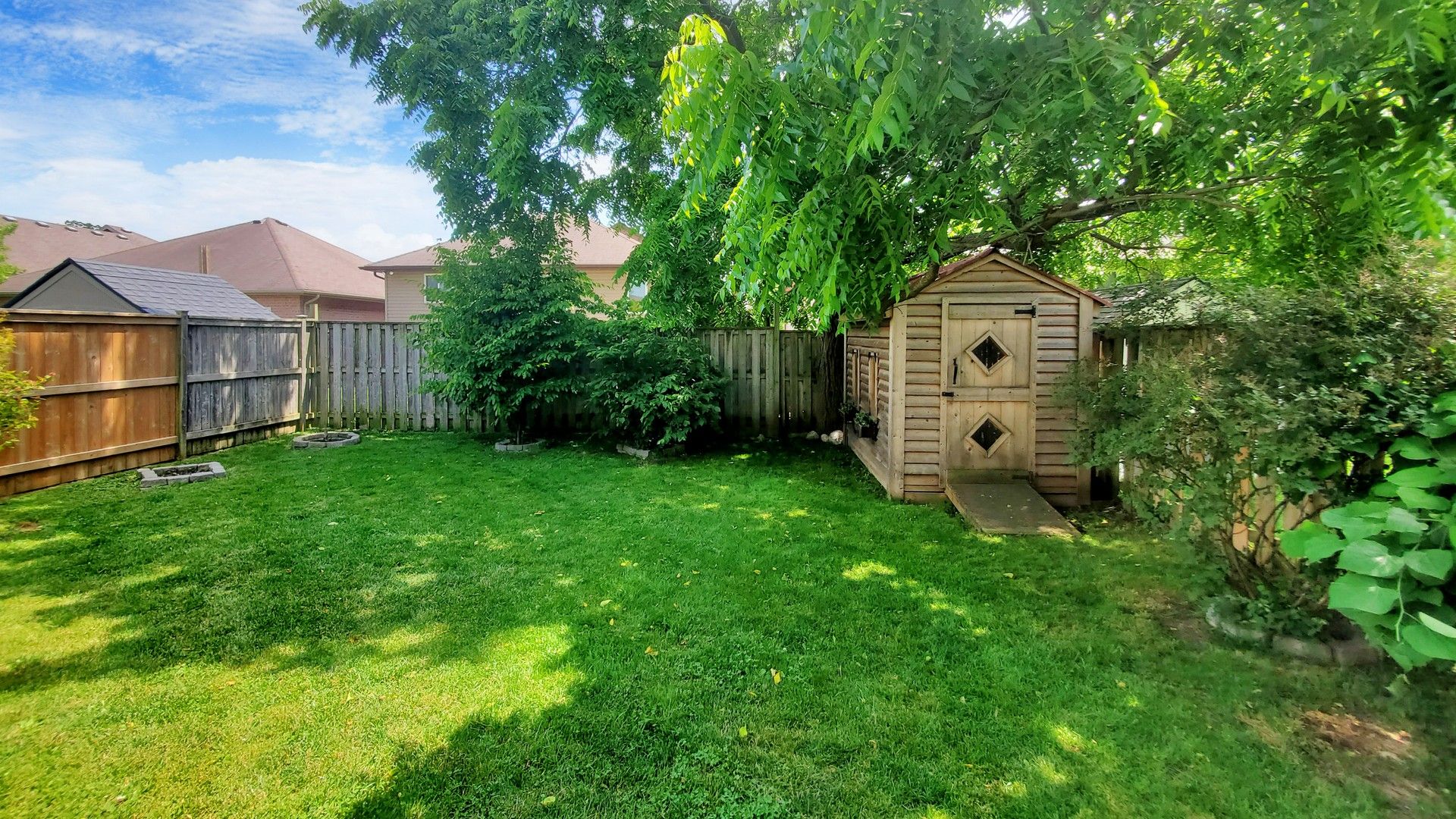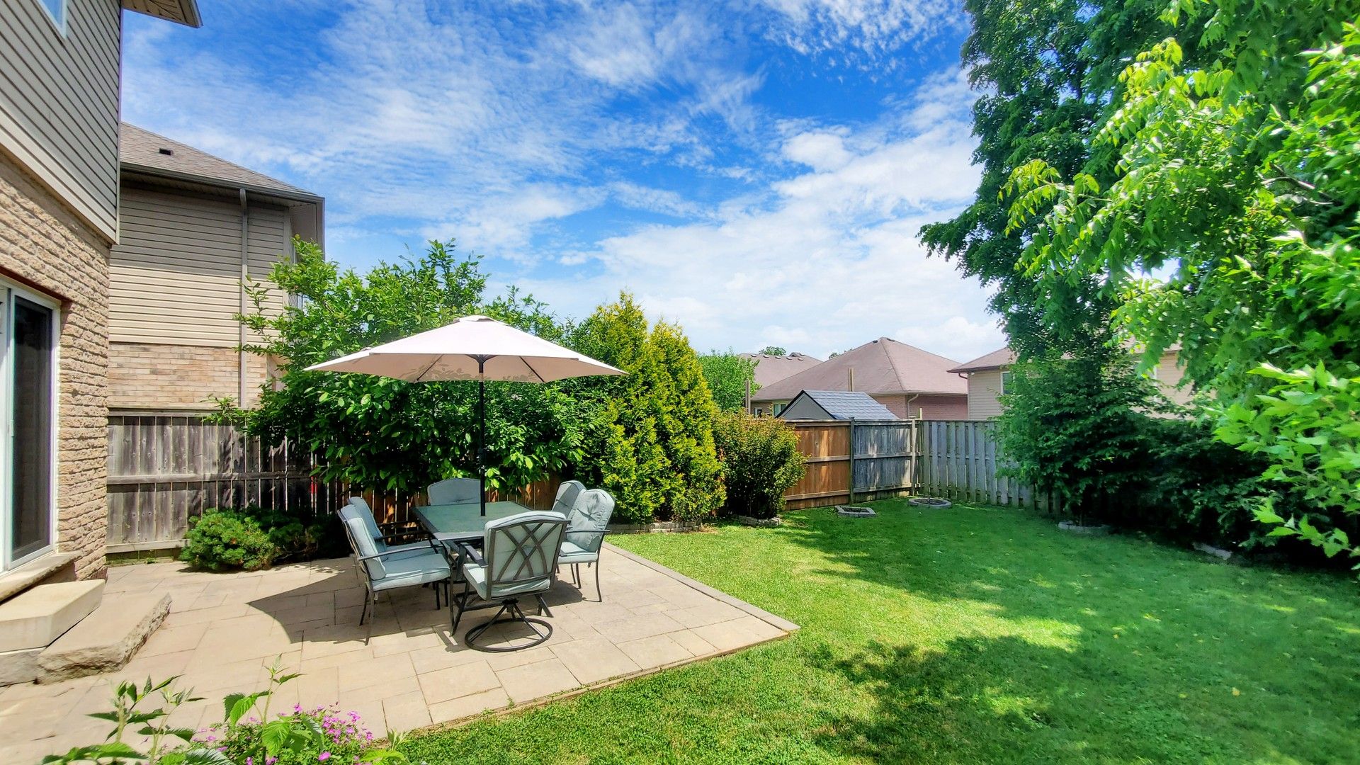 • Beautifully landscaped backyard with a stone patio and custom shed.