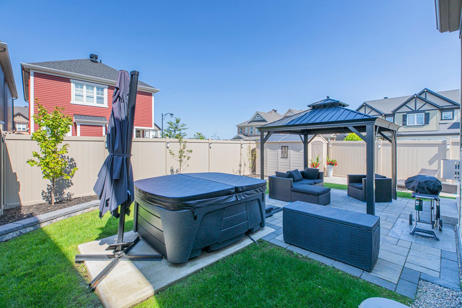 • Large fenced corner lot with gazebo, hot tub, and garage workshop.