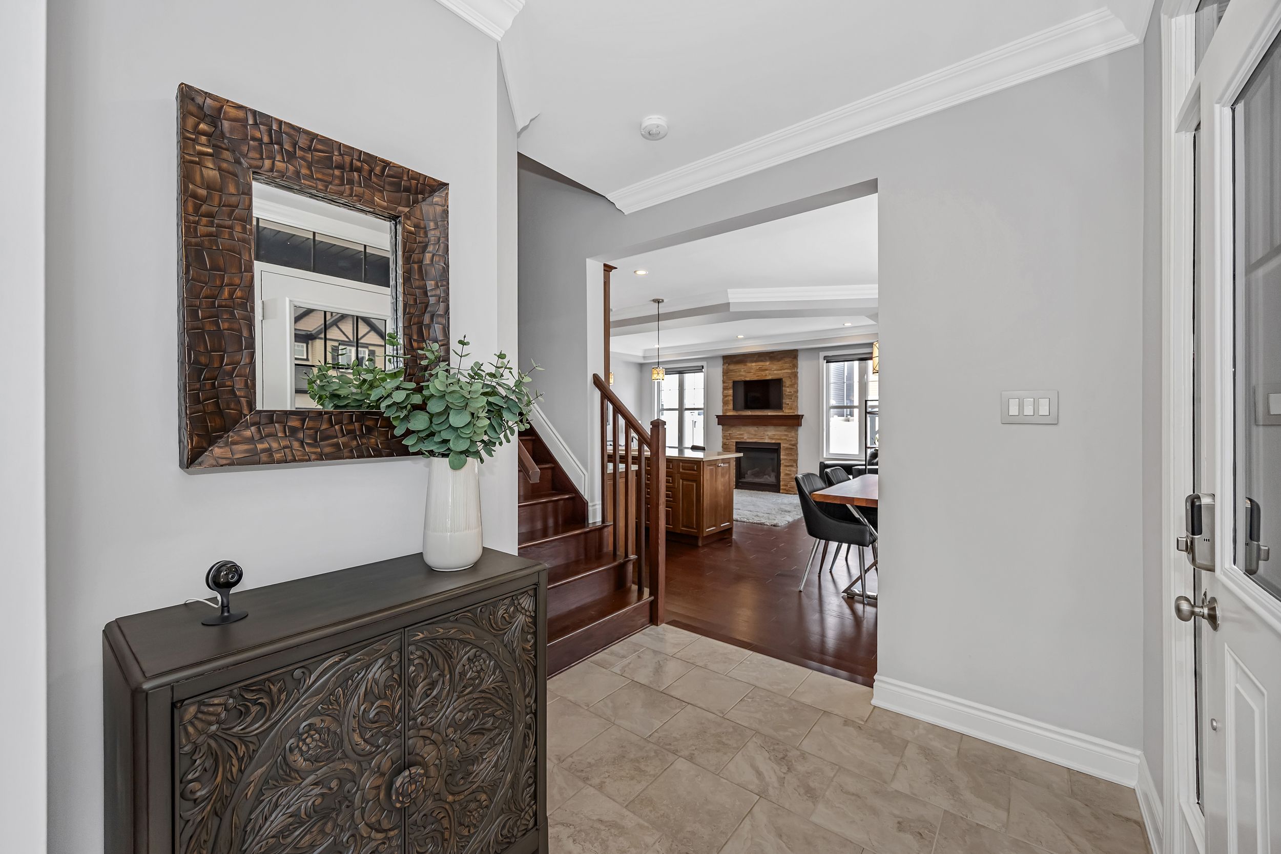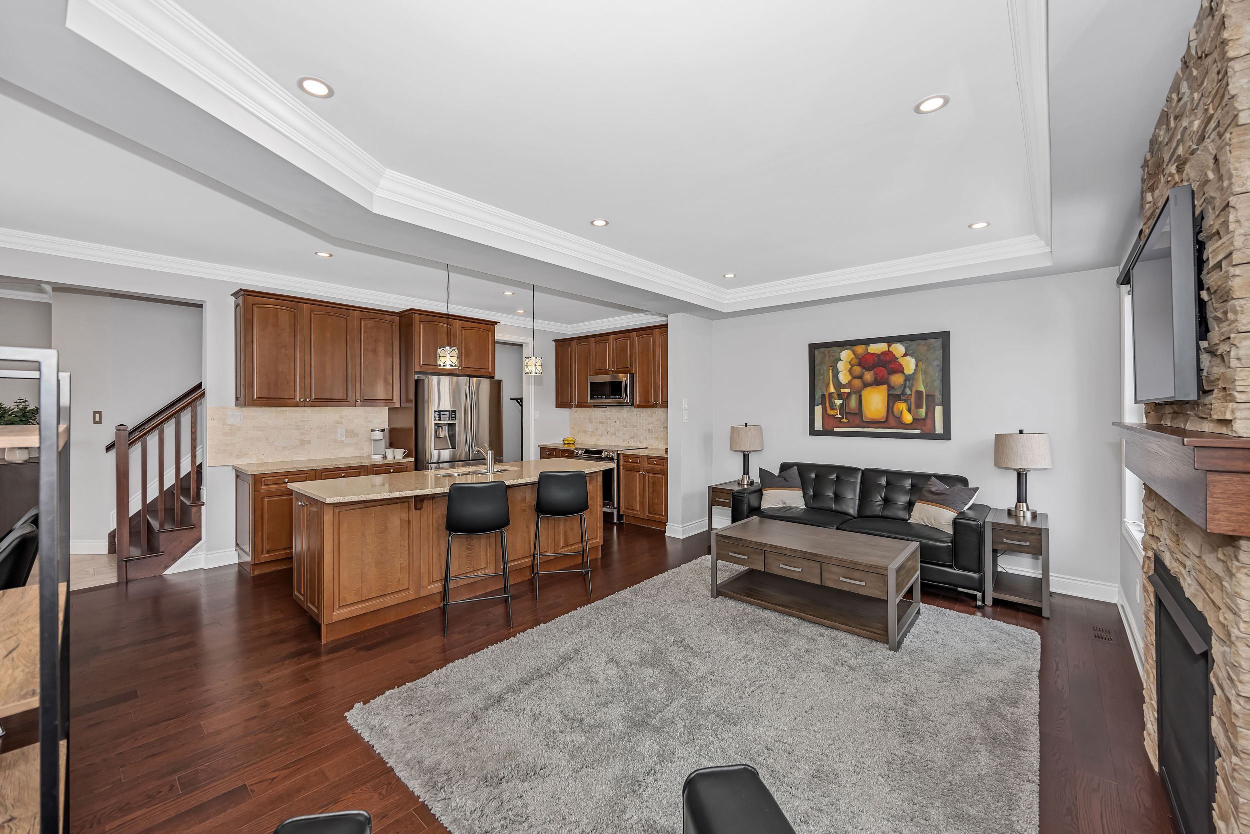 • Generous living space with cultured-stone gas fireplace for entertaining.