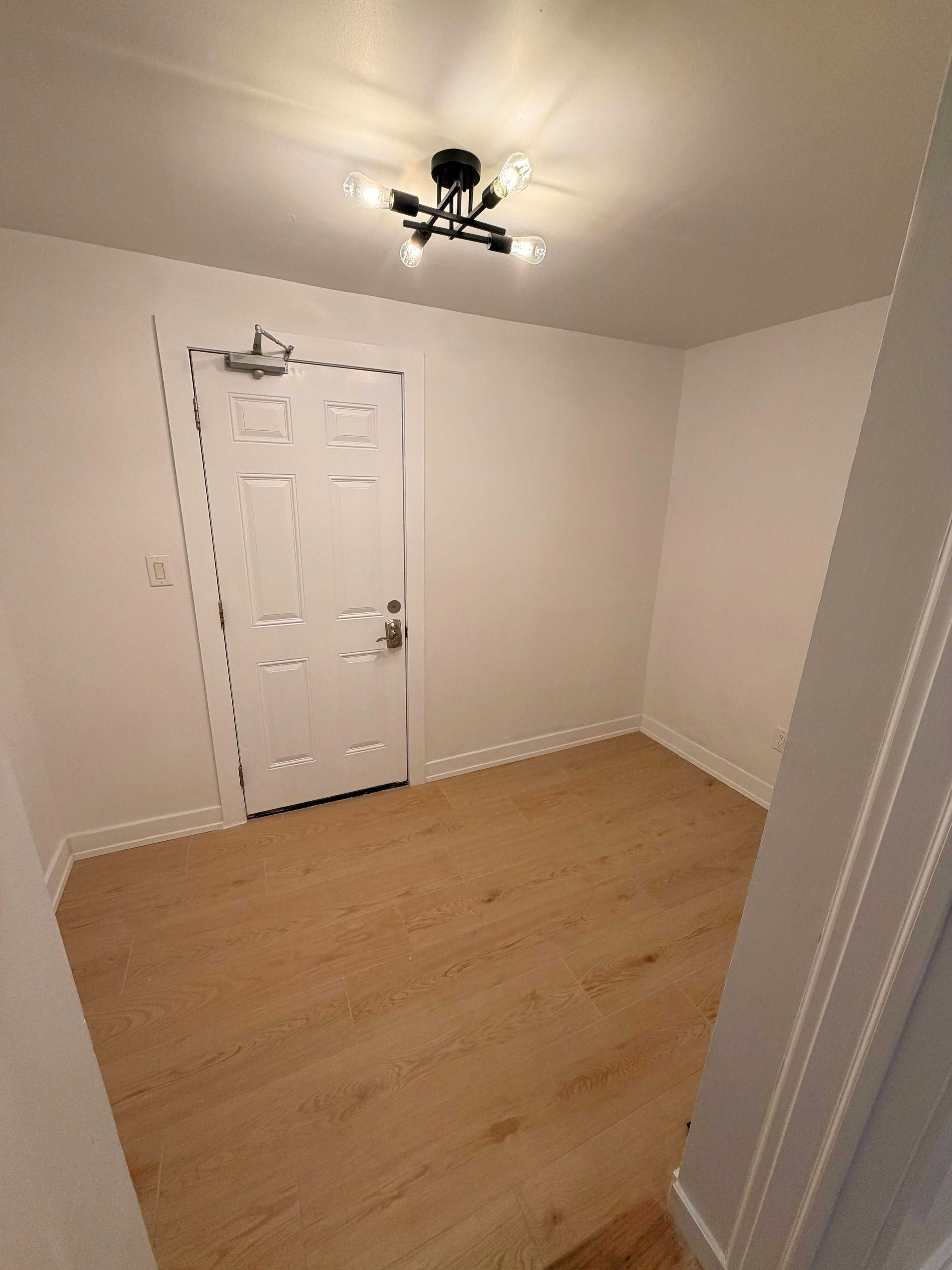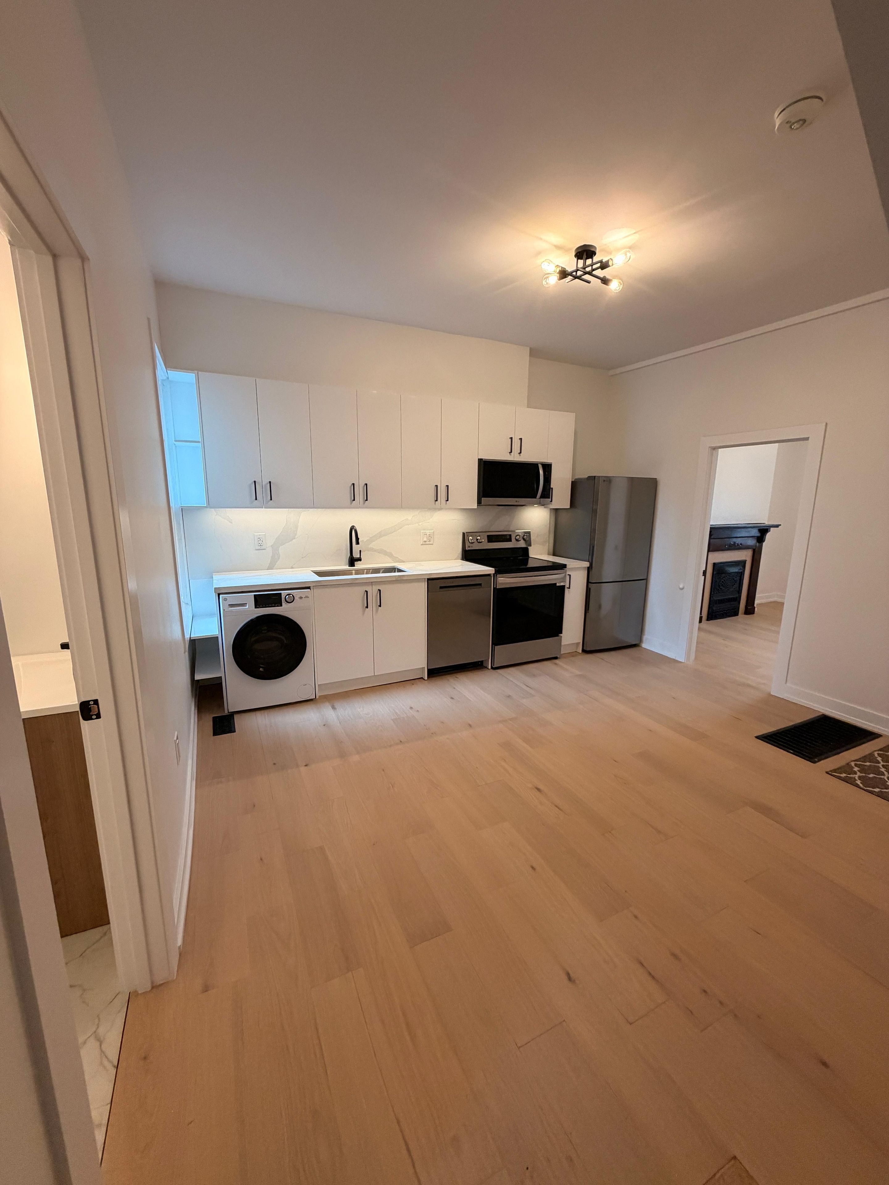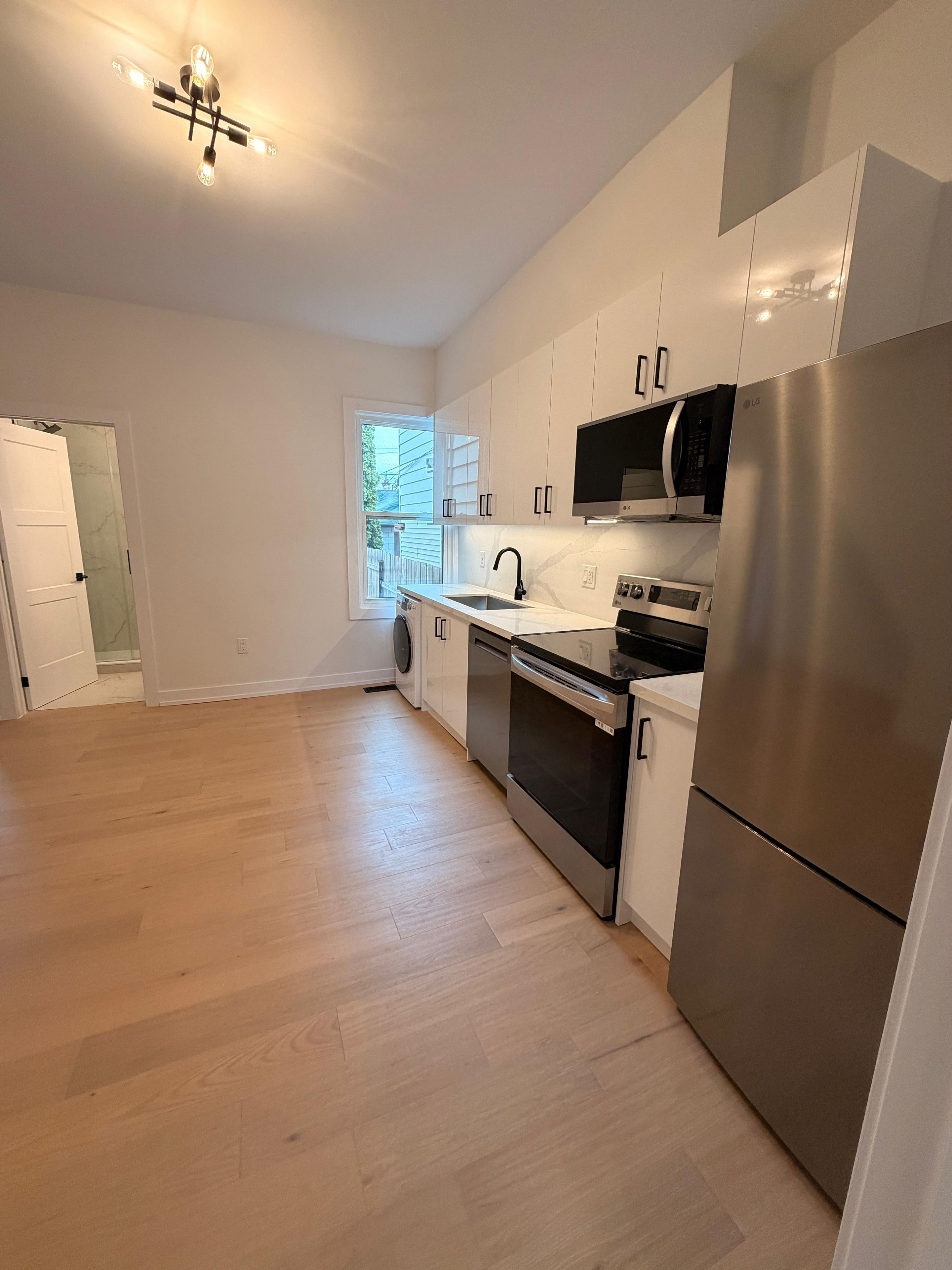 Renovated 2 bedroom apartment, modern kitchen with stainless steel appliances, quartz countertops and backsplash, hardwood floor, and ac. Shared backyard and in unit laundry, walking distance to supermarkets and restaurants, 20 min walk to george brown college.