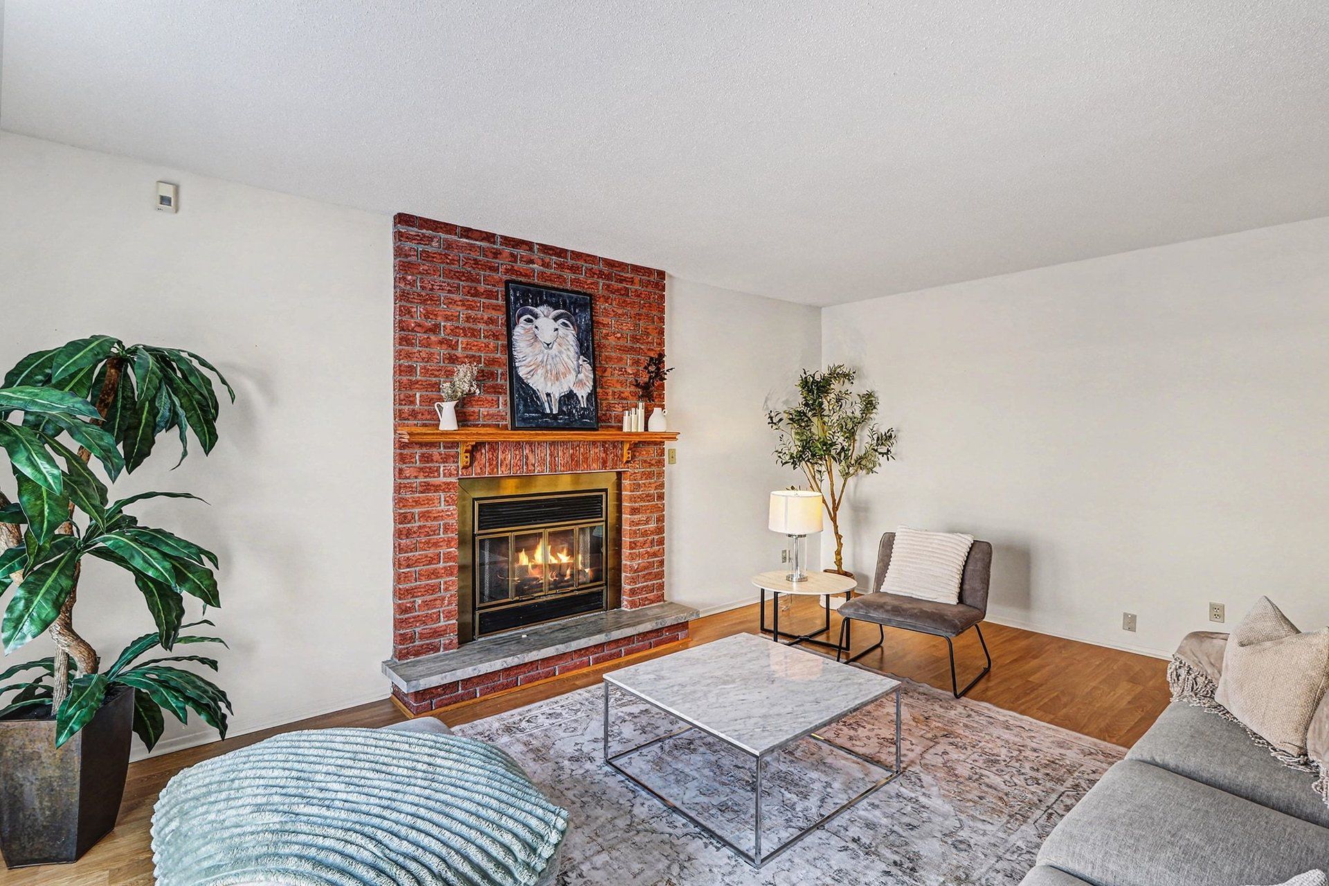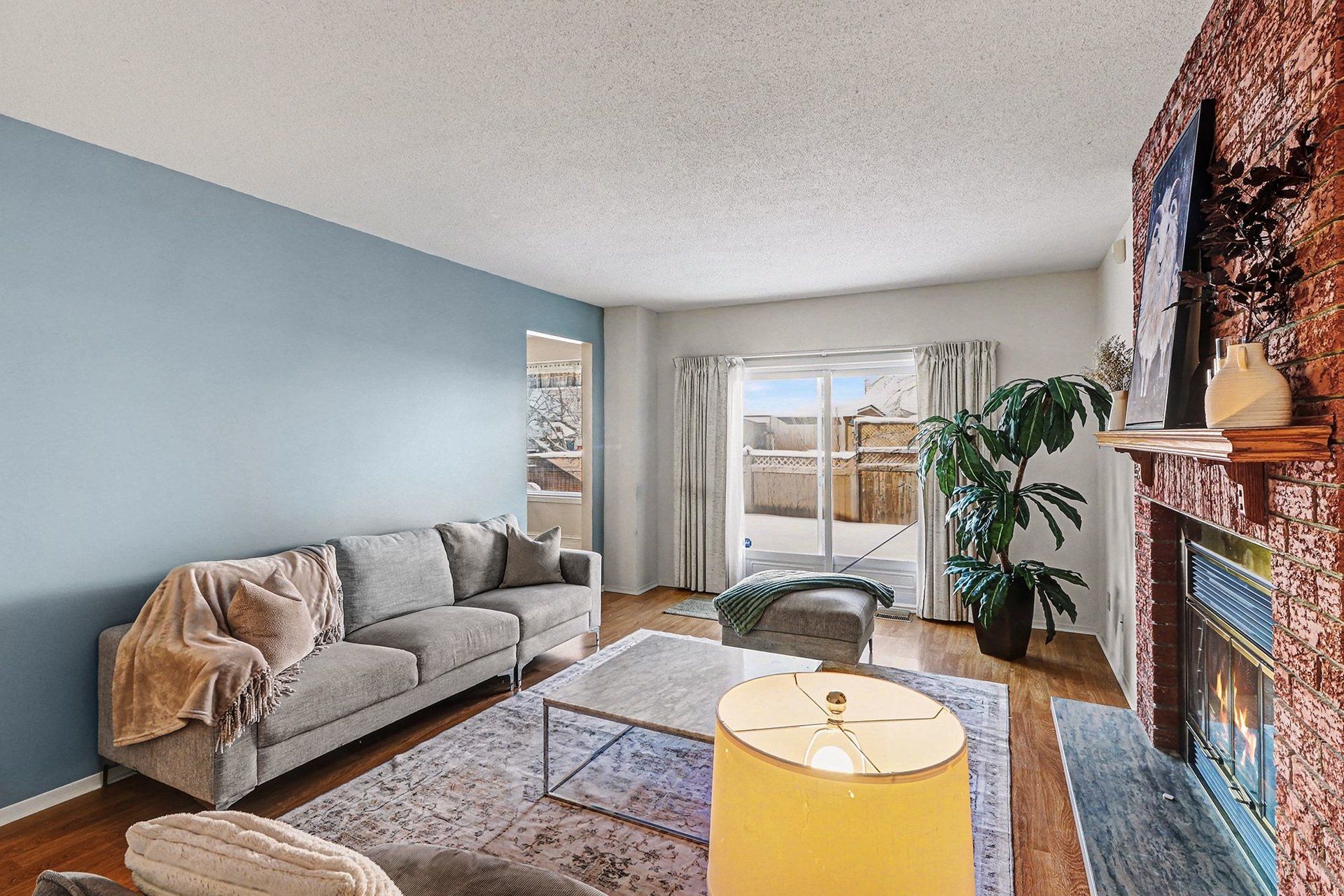 • Family room features a cozy brick fireplace for gatherings.