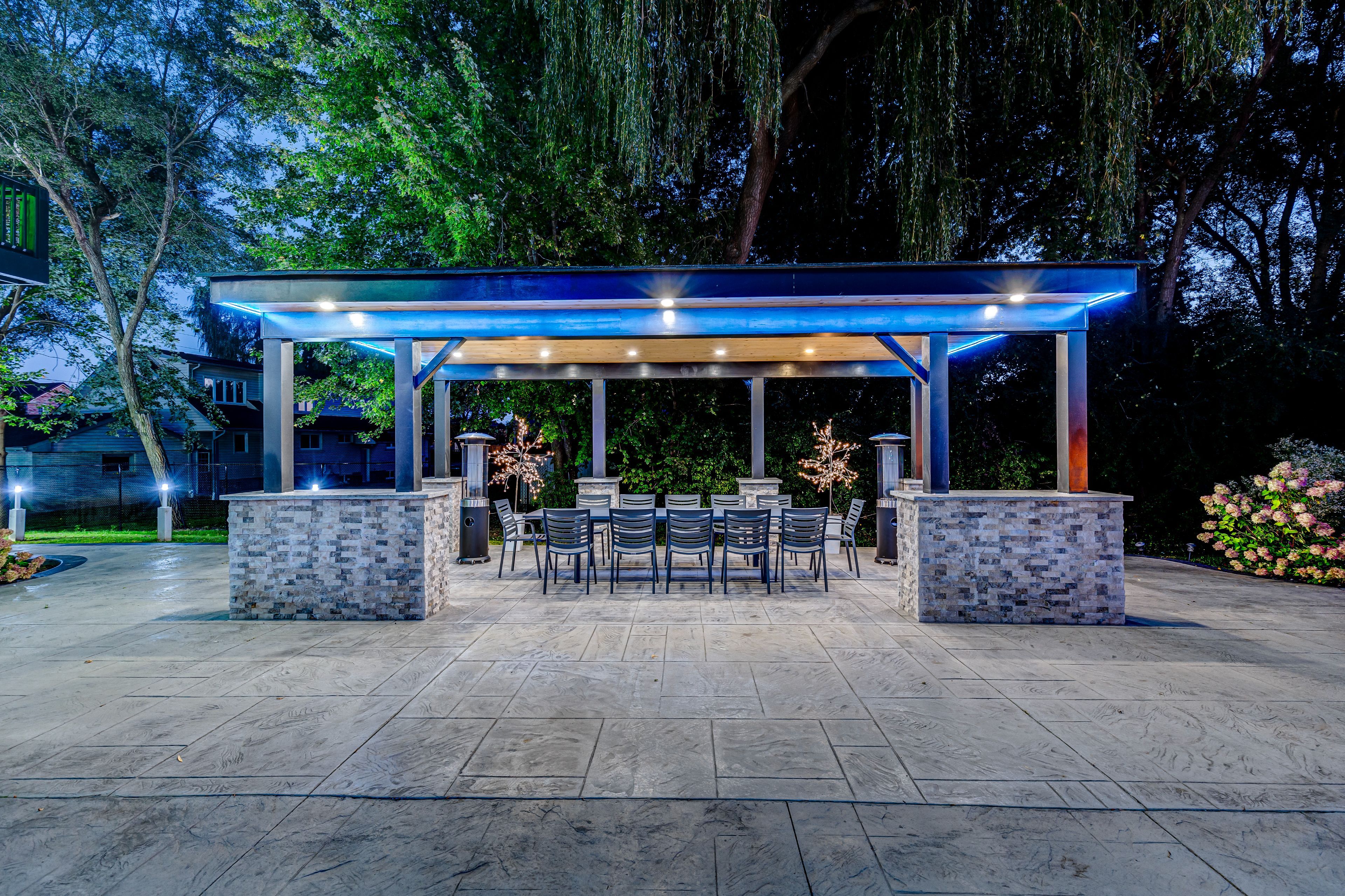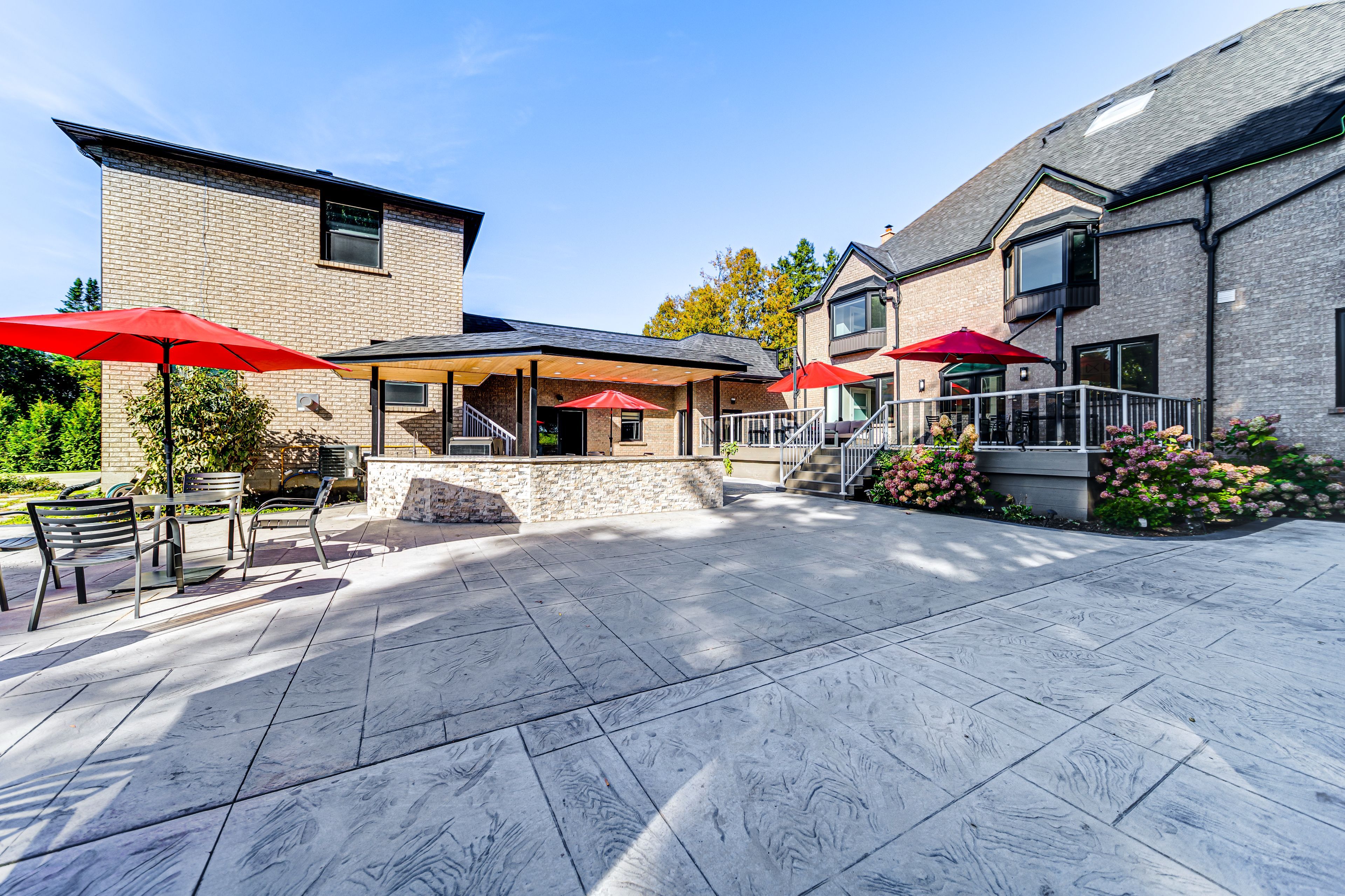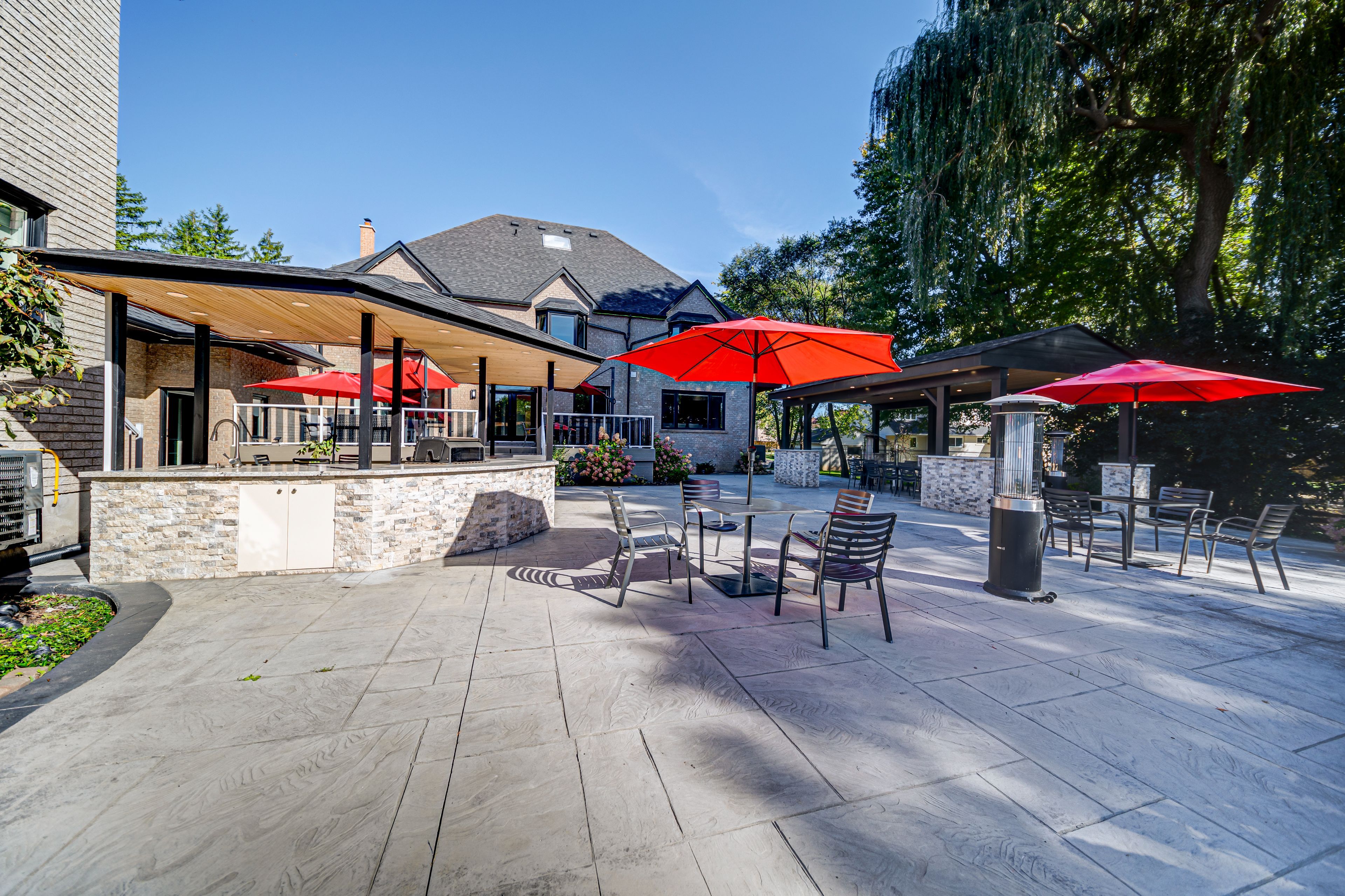 • Large outdoor space with gazebo, bar, and beautifully landscaped areas.