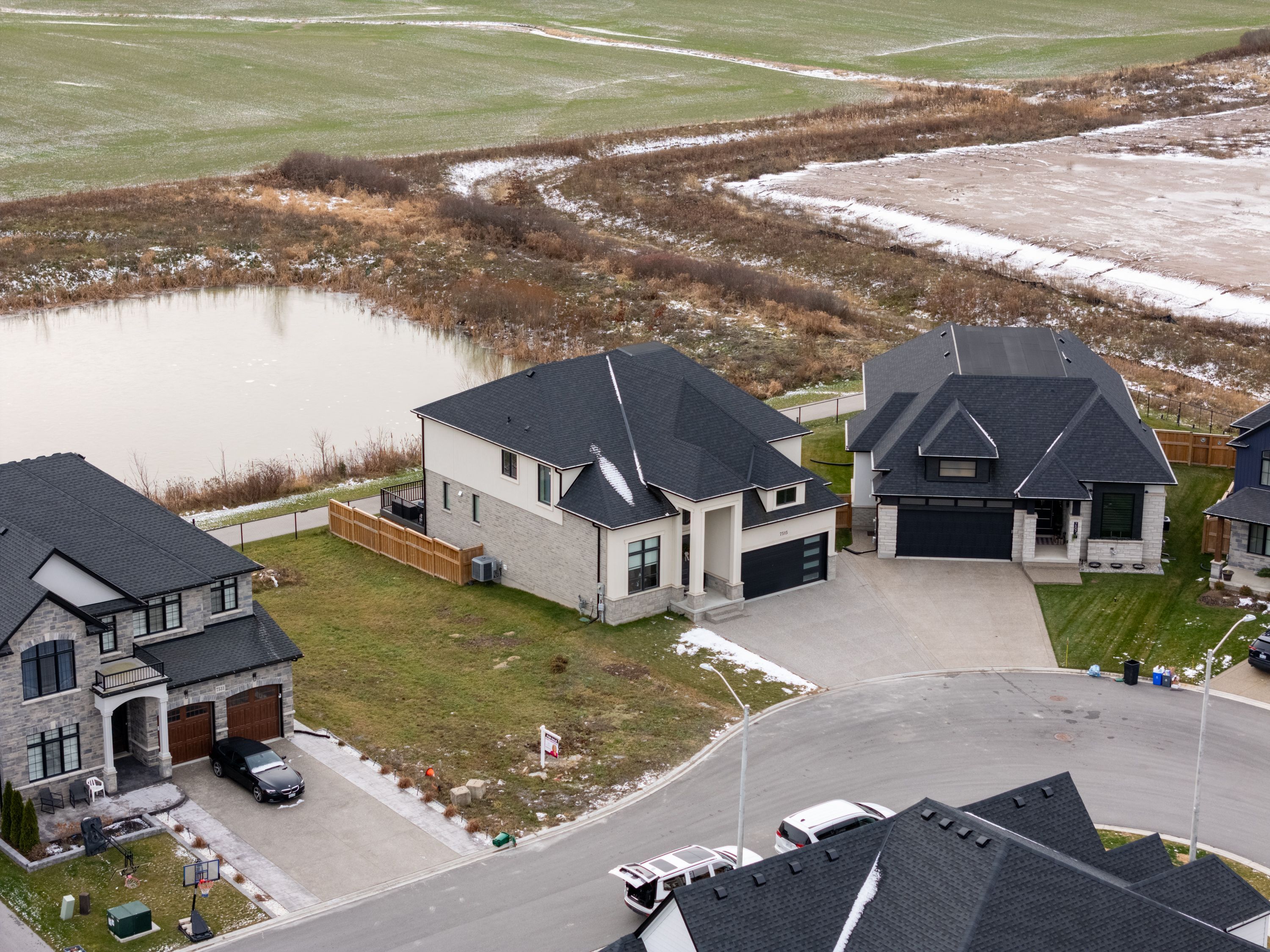 Luxury, style, and modern convenience define this stunning 2-storey stone & stucco home, built in 2022 and backing onto a tranquil retention pond. Thoughtfully designed with high-end finishes, this home boasts engineered hardwood flooring on the main and second floors, soaring ceilings, and oversized windows that flood the space with natural light. The open-concept main floor is perfect for both everyday living and entertaining. The spacious living room features an electric fireplace, while the chefs kitchen is a showstopper with extensive cabinetry, an oversized island with additional storage and seating, built-in appliances, and a striking herringbone backsplash. A butlers pantry with a prep sink adds functionality. A private office, 2-piece bath, and a mudroom with rear yard access complete this level. Upstairs, the primary suite offers dual walk-in closets and a spa-like 5-piece ensuite with a soaker tub and glass shower. Three additional bedrooms provide ample spaceone with a private 3-piece ensuite and walk-in closet, while the other two share a jack & jill 5-piece bath. A second-floor laundry room adds convenience. The finished basement (awaiting ceiling completion) features heated floors, a large rec room, oversized windows, and a 3-piece bath. This home is fully equipped with a built-in speaker system inside and out, a security camera system, and a sprinkler system for effortless lawn care. Outside, enjoy the fully fenced pie-shaped lot with a raised composite deck, perfect for entertaining. A oversized 2. 5 car garage and a prime location in a growing niagara falls subdivision, close to shopping, amenities, and major highways make this home an exceptional opportunity.