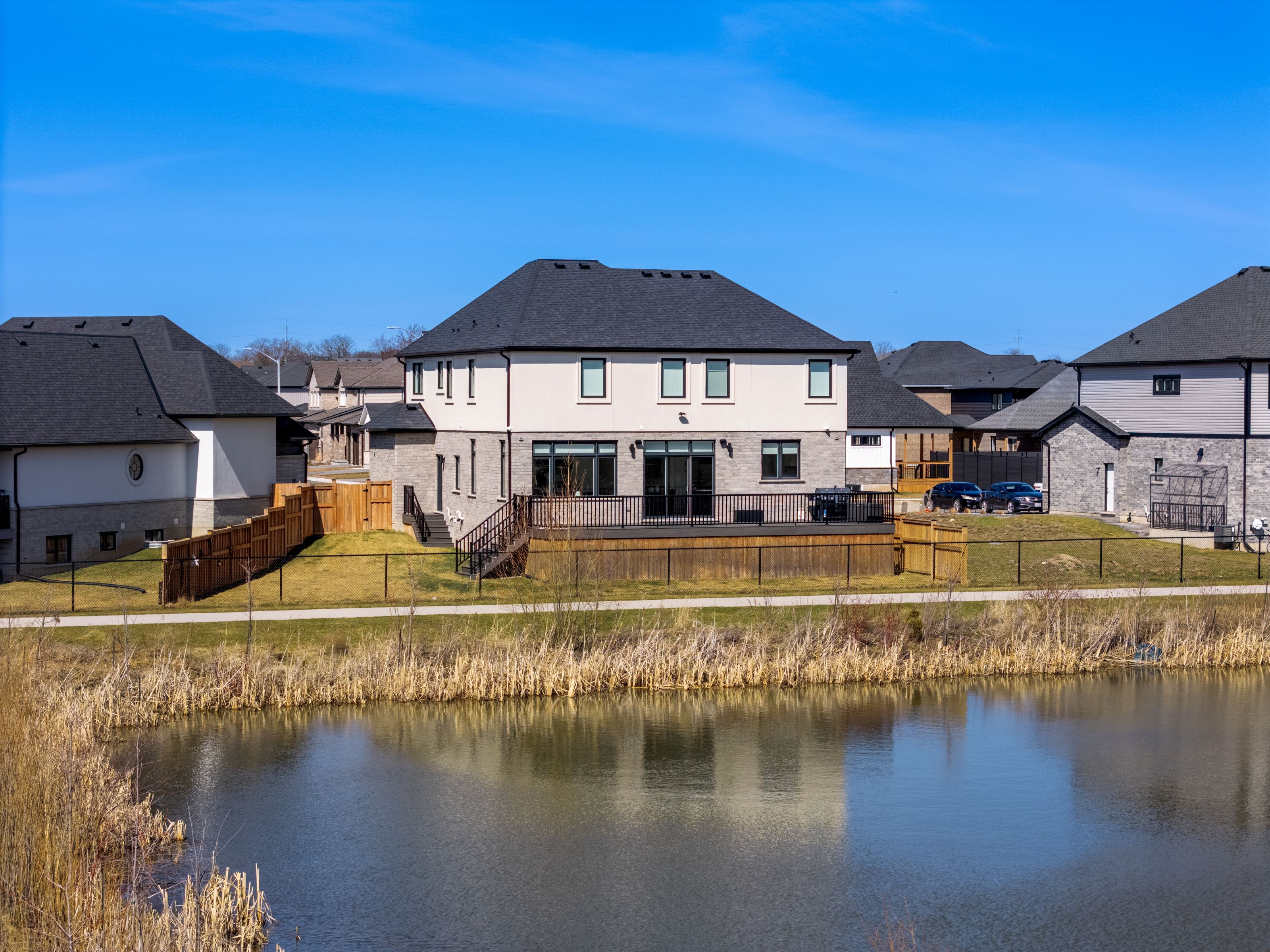 Luxury, style, and modern convenience define this stunning 2-storey stone & stucco home, built in 2022 and backing onto a tranquil retention pond. Thoughtfully designed with high-end finishes, this home boasts engineered hardwood flooring on the main and second floors, soaring ceilings, and oversized windows that flood the space with natural light. The open-concept main floor is perfect for both everyday living and entertaining. The spacious living room features an electric fireplace, while the chefs kitchen is a showstopper with extensive cabinetry, an oversized island with additional storage and seating, built-in appliances, and a striking herringbone backsplash. A butlers pantry with a prep sink adds functionality. A private office, 2-piece bath, and a mudroom with rear yard access complete this level. Upstairs, the primary suite offers dual walk-in closets and a spa-like 5-piece ensuite with a soaker tub and glass shower. Three additional bedrooms provide ample spaceone with a private 3-piece ensuite and walk-in closet, while the other two share a jack & jill 5-piece bath. A second-floor laundry room adds convenience. The finished basement (awaiting ceiling completion) features heated floors, a large rec room, oversized windows, and a 3-piece bath. This home is fully equipped with a built-in speaker system inside and out, a security camera system, and a sprinkler system for effortless lawn care. Outside, enjoy the fully fenced pie-shaped lot with a raised composite deck, perfect for entertaining. A oversized 2. 5 car garage and a prime location in a growing niagara falls subdivision, close to shopping, amenities, and major highways make this home an exceptional opportunity.