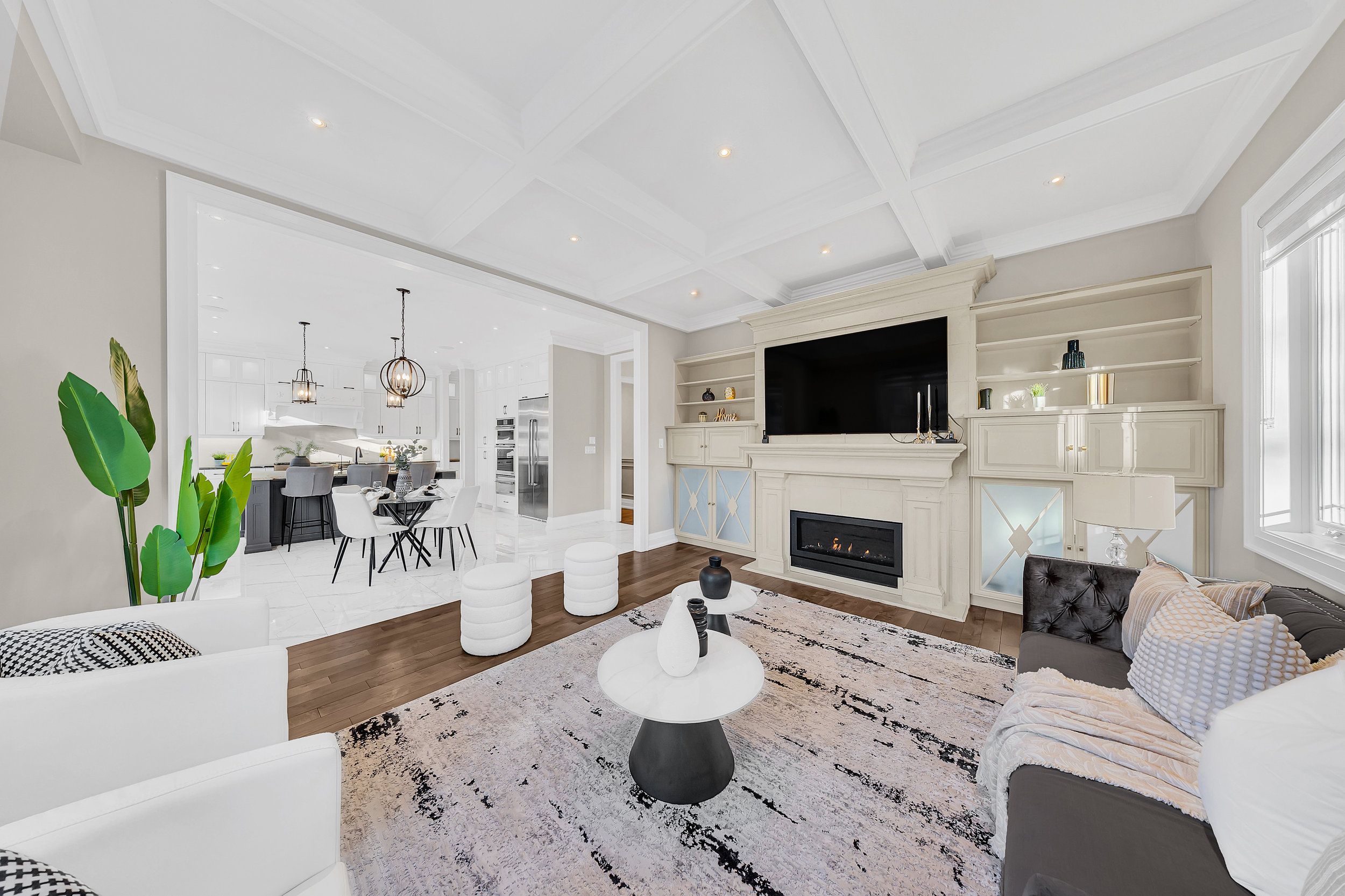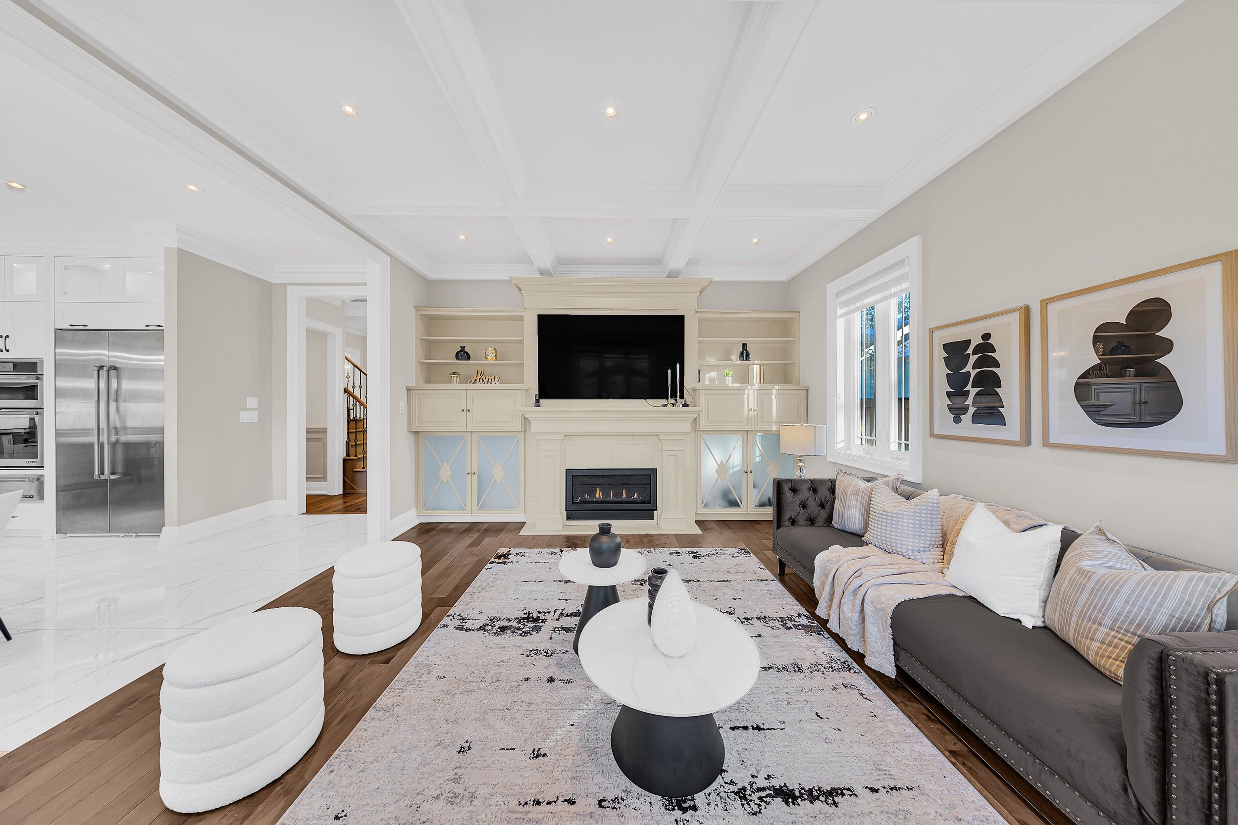• Cozy living area featuring a gas fireplace and custom shelving.