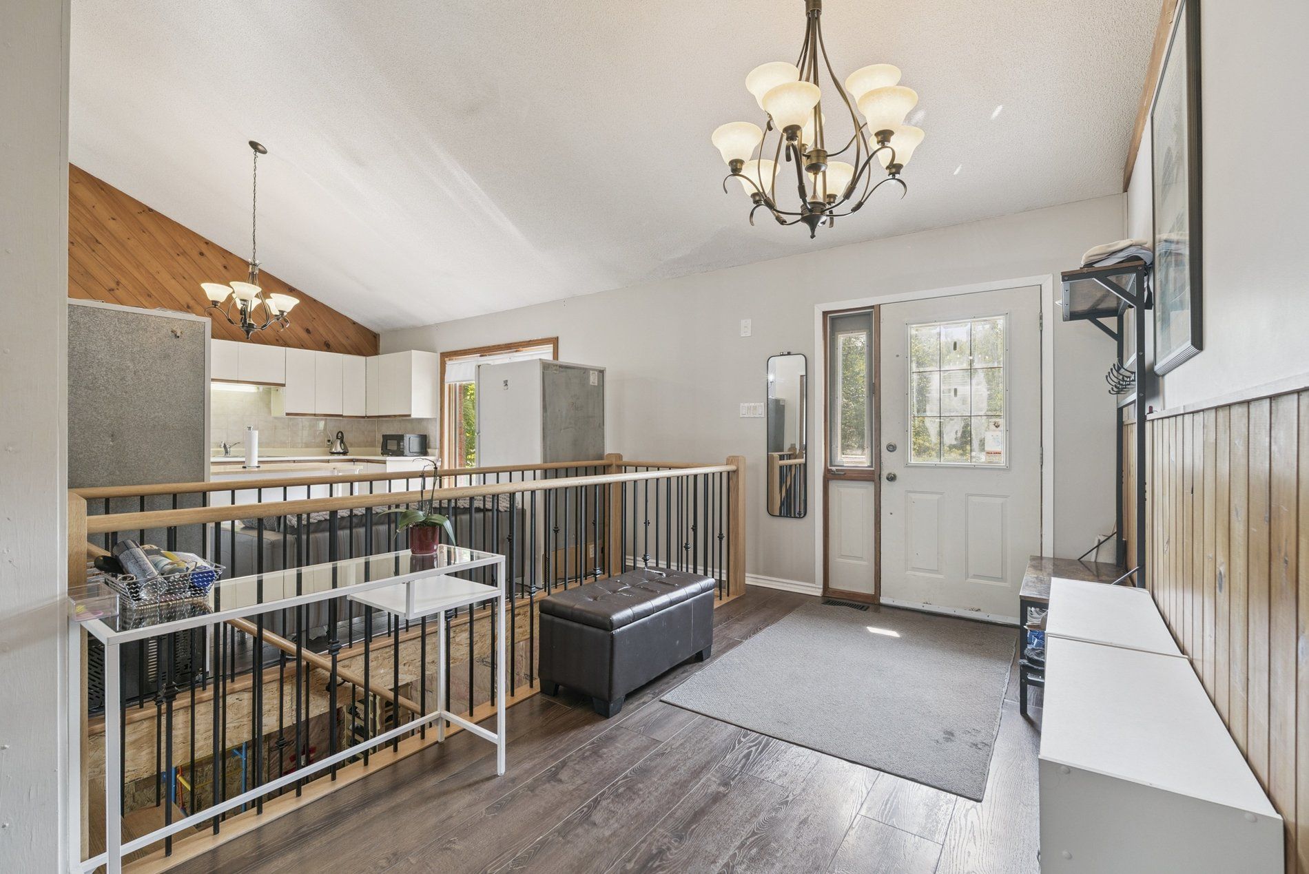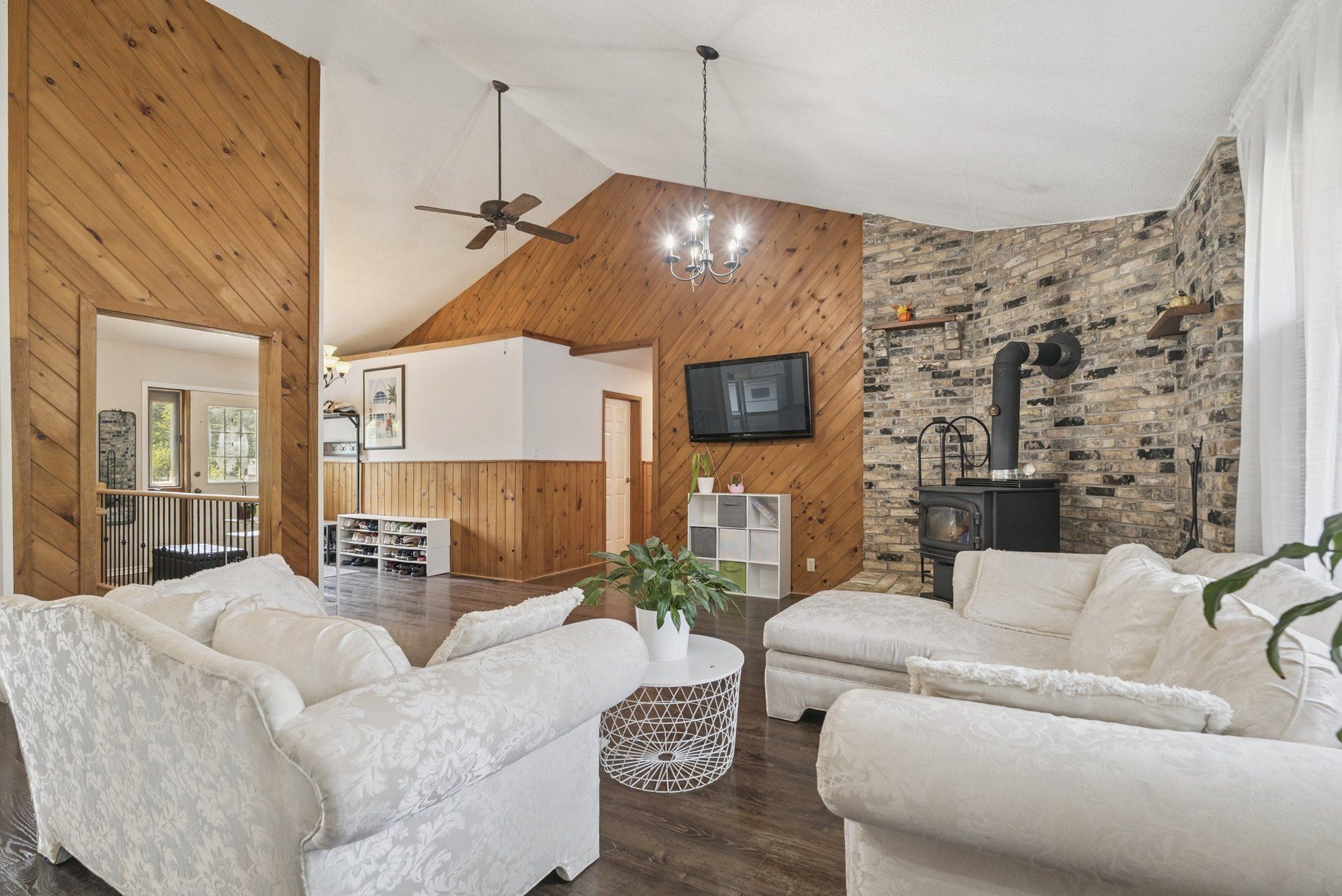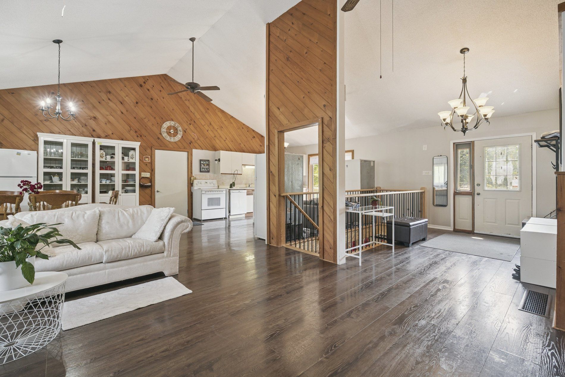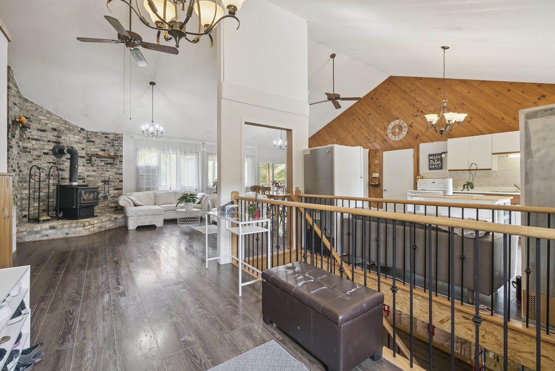 Rare 1. 84-acre bungalow offering space, privacy, and outstanding future potentialset on a sprawling 200 x 400 ft lot in the heart of peaceful essa township, this exceptional property delivers the kind of space and opportunity that is increasingly hard to find. Enjoy the freedom of nearly two acres of land while remaining just minutes to schools, hospital, shopping, golf, and the scenic nottawasaga river trail. Surrounded by mature trees, the home offers a private, estate-like setting with an expansive wrap-around deck ideal for entertaining, family gatherings, or quiet evenings outdoors. An extra-wide driveway, metal roof, and oversized two-car garage with loft or lift potential provide practicality and room to grow. Inside, the open-concept main floor features vaulted ceilings, warm wood accents, laminate flooring, and a cozy wood-burning fireplace that anchors the living space. The bright kitchen with eat-in area and enclosed porch walkout seamlessly connects indoor and outdoor living. The primary suite offers a walk-in closet, five-piece semi-ensuite, and a private deck walkout overlooking the grounds. Three additional bedrooms-including one with laundry and walkout-complete the level. The partially finished basement boasts approximately 10-foot ceilings, three separate entrances, and direct garage access-an ideal layout for an in-law suite, rental opportunity, or multi-generational living. With essa zoning allowing up to two additional residential units (arus), subject to municipal approvals, this property presents exceptional upside for those seeking to create value, expand living options, or invest in a versatile rural holding. A truly unique opportunity offering land, lifestyle, and long-term potential-all within easy reach of everyday amenities.