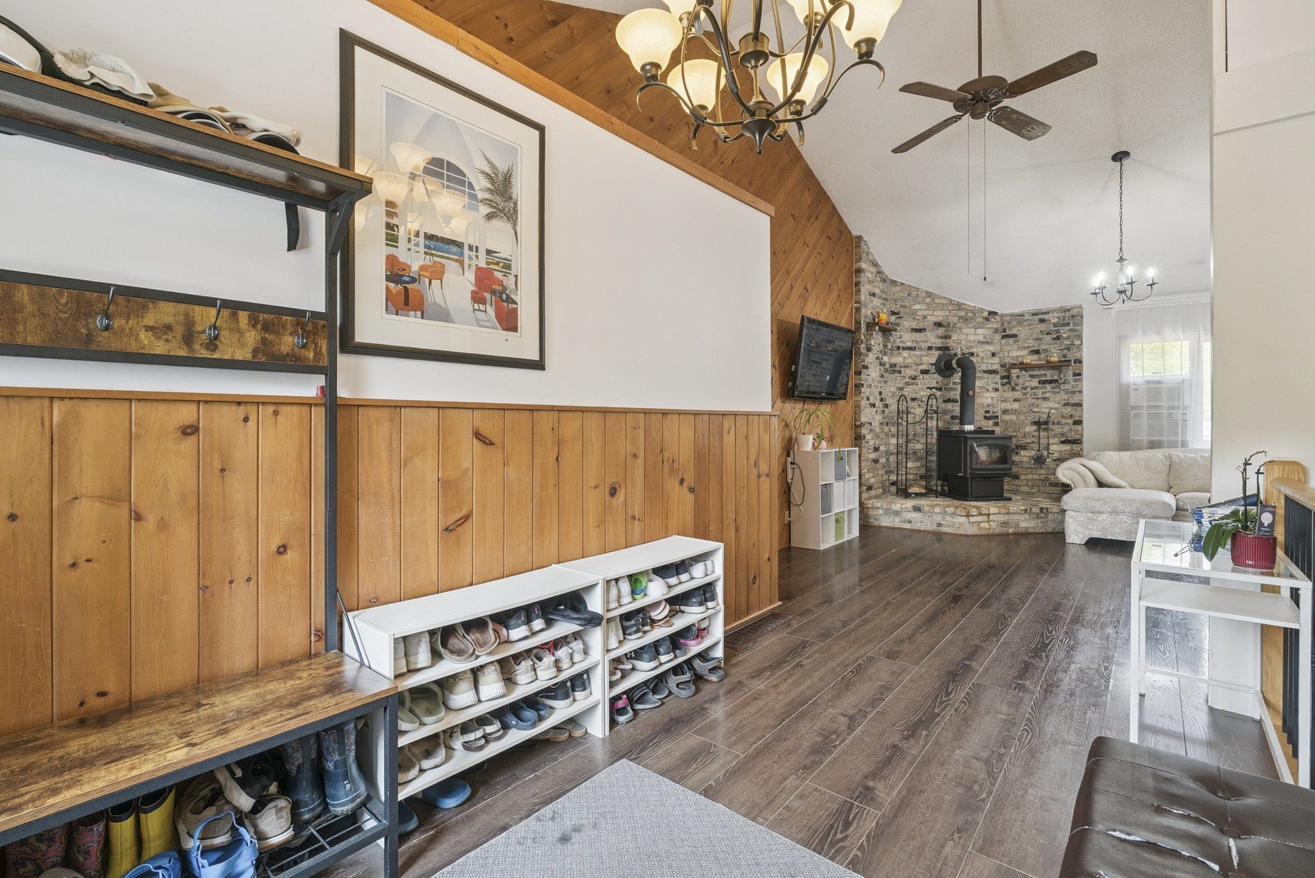 • Open-concept layout with vaulted ceilings and cozy fireplace.