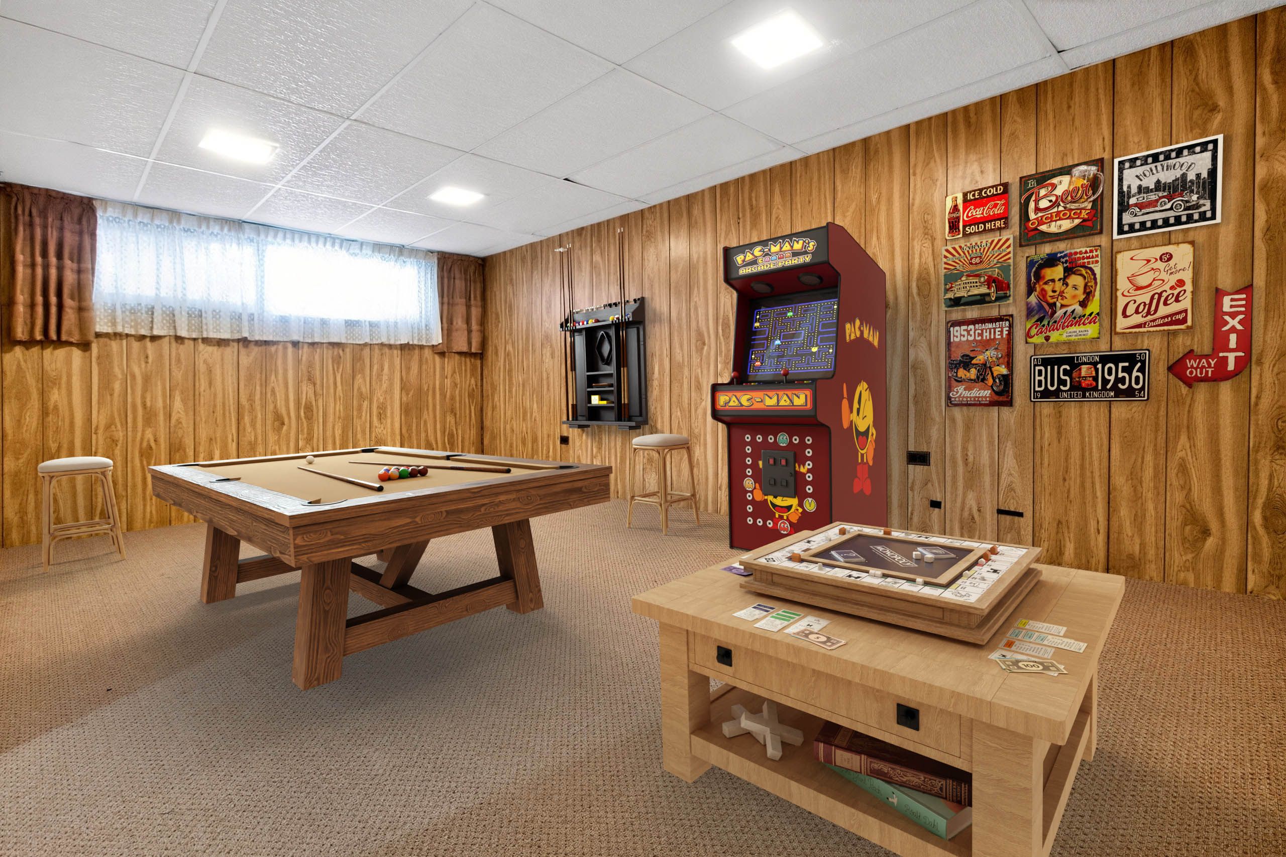 • Lower level with recreation room, den, and bathroom.