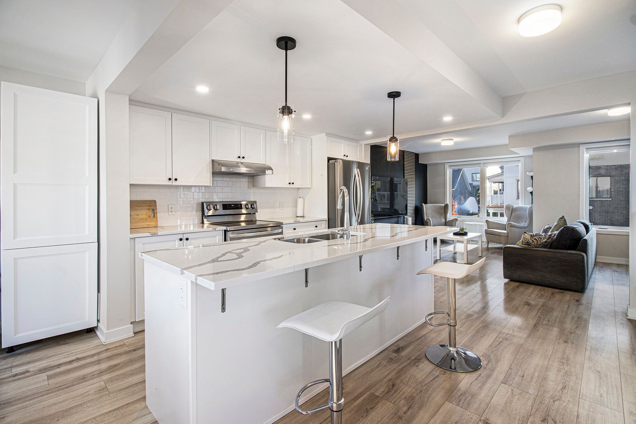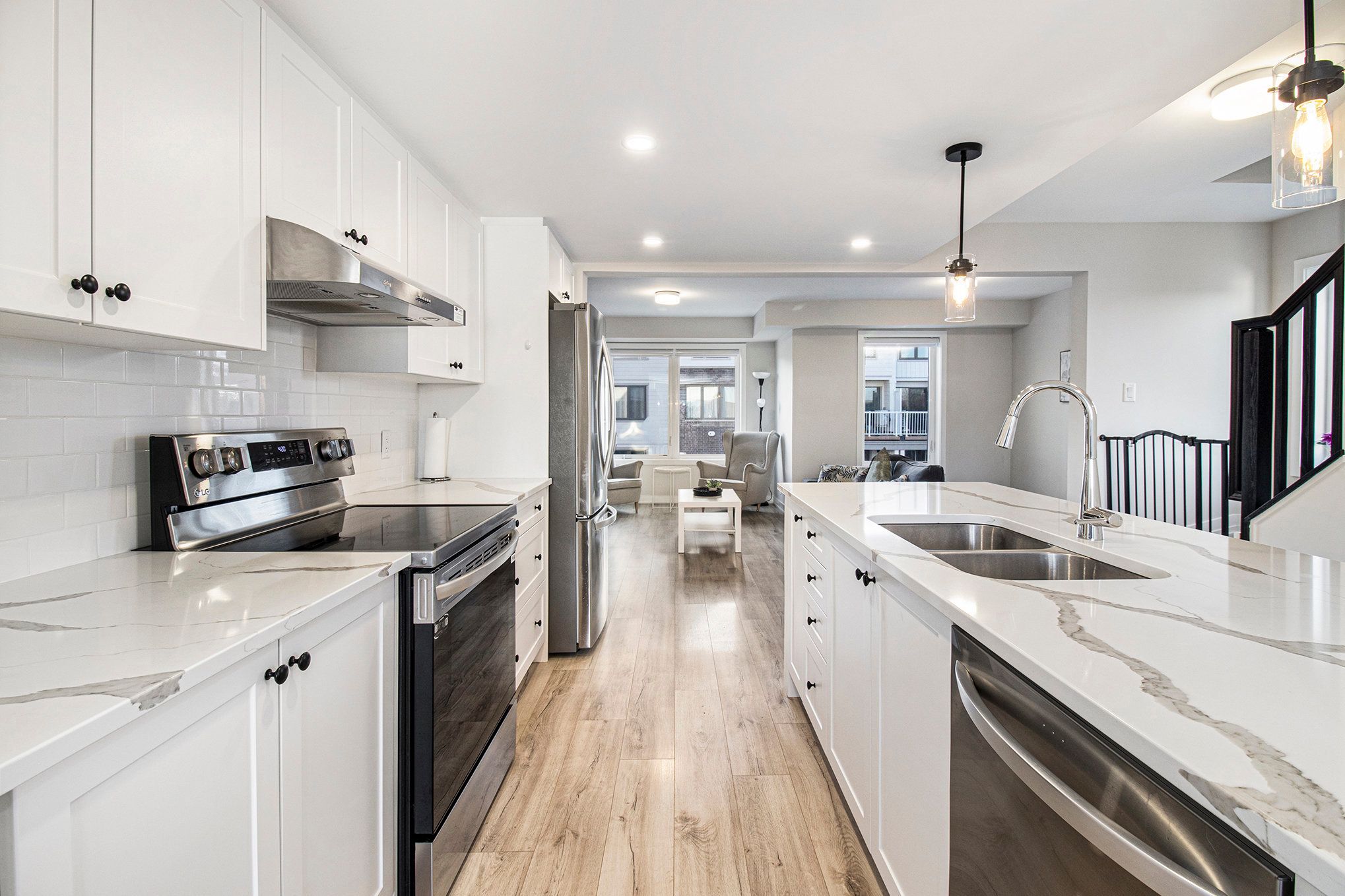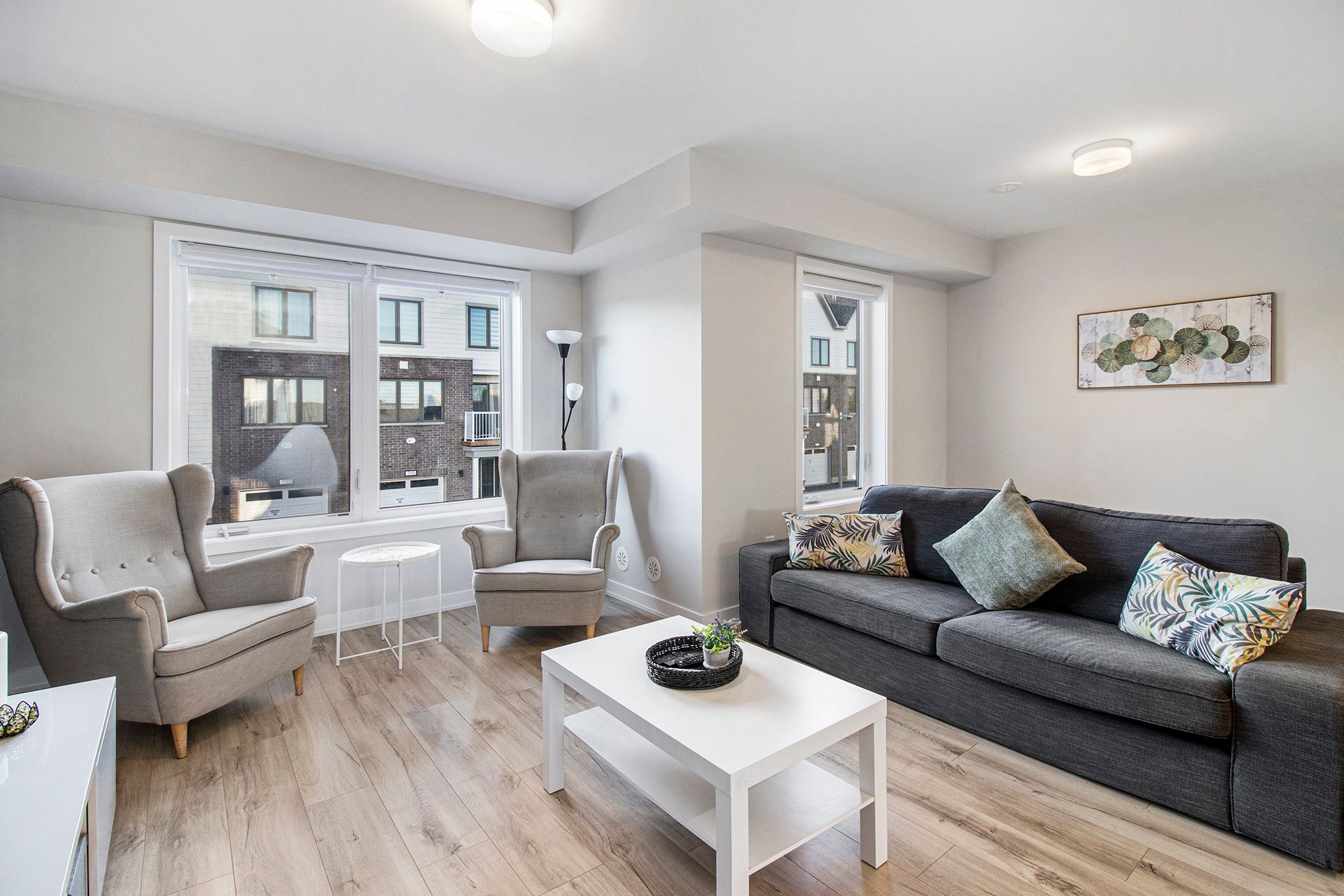 This stunning 2024 mattamy-built 3-storey bedford end-unit townhome offers the perfect combination of modern design, comfort, and functionality in a highly desirable west ottawa location. Over $42. 000 design and structural upgrades (such as guest suite). Situated on a premium corner lot, this home stands out with windows on three sides, creating an exceptionally bright and airy living space filled with natural light throughout the day. The ground floor features a versatile guest suite complete with a full bathroom and patio door access to the backyard-a perfect retreat for guests, in-laws, or use as a private home office. The second level showcases an inviting open-concept living and dining area with southwest exposure, providing warm afternoon sunlight and views of a nearby historic building. The modern kitchen is beautifully appointed with quartz countertops, pots and pans drawers, and upgraded cabinetry. Recessed pot lights and a clean white palette give the space a bright, elegant, and contemporary feel. A smart thermostat adds to the home's comfort and energy efficiency. The third floor features a spacious primary bedroom and a private ensuite bathroom, offering a quiet space to unwind. Additional bedrooms are well-sized and designed to maximize comfort and privacy. A convenient laundry area is also located on the upper floor for everyday ease. With two parking spaces (one garage and one exterior driveway), this home offers both practicality and flexibility. Built in 2024, it comes with the remainder of the tarion warranty, ensuring peace of mind for years to come. Set on a quiet street in a family-friendly and growing community, residents will enjoy nearby walking paths, green spaces, and parks ideal for outdoor activities. Located just minutes from highway 417, public transit, top-rated schools, centrum shopping centre, canadian tire centre, and tanger outlets, this home combines modern living with exceptional convenience.