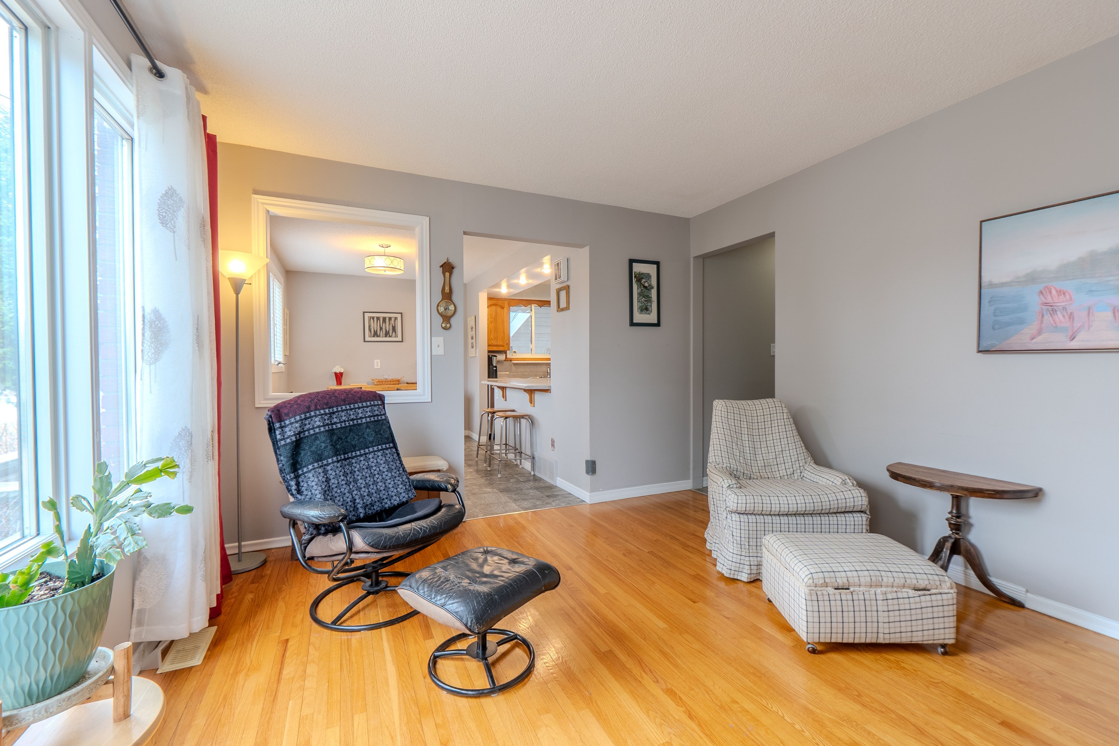 • Main level features a kitchen, dining room, and living room.