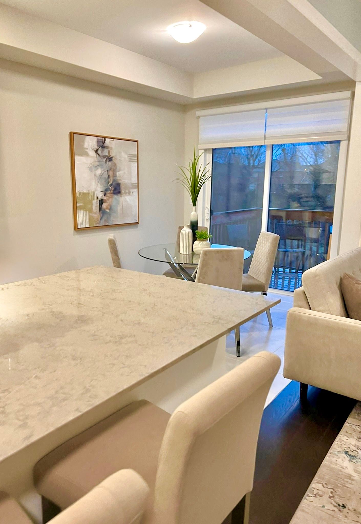 Stunning freehold end-unit townhouse (2018) with 1,778 sq. Ft. Above grade, attached only by the garage and backing onto serene greenspace. Thoughtfully upgraded with hardwood floors on both levels, smooth ceilings, and 9-ft ceilings on the main floor. Bright, modern eat-in kitchen with quartz countertops, oversized island, and abundant storage. Luxurious primary retreat with a large walk-in closet and 5-piece ensuite. Second bedroom offers a walkout to a private balcony. Direct garage access to the house. Basement has large windows and walkout to the backyard. Great location, highways access, schools, hospital, restaurants, shops, and walking trails!