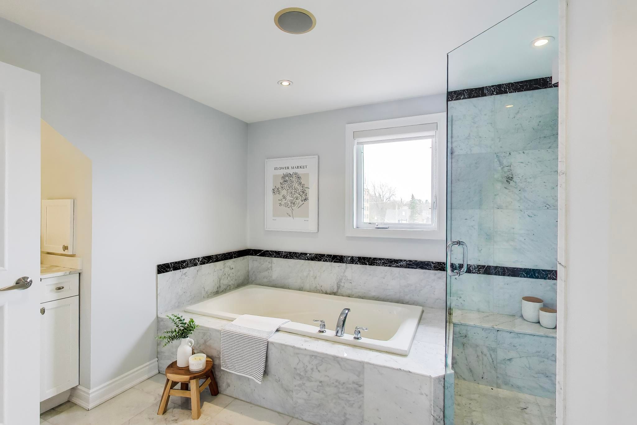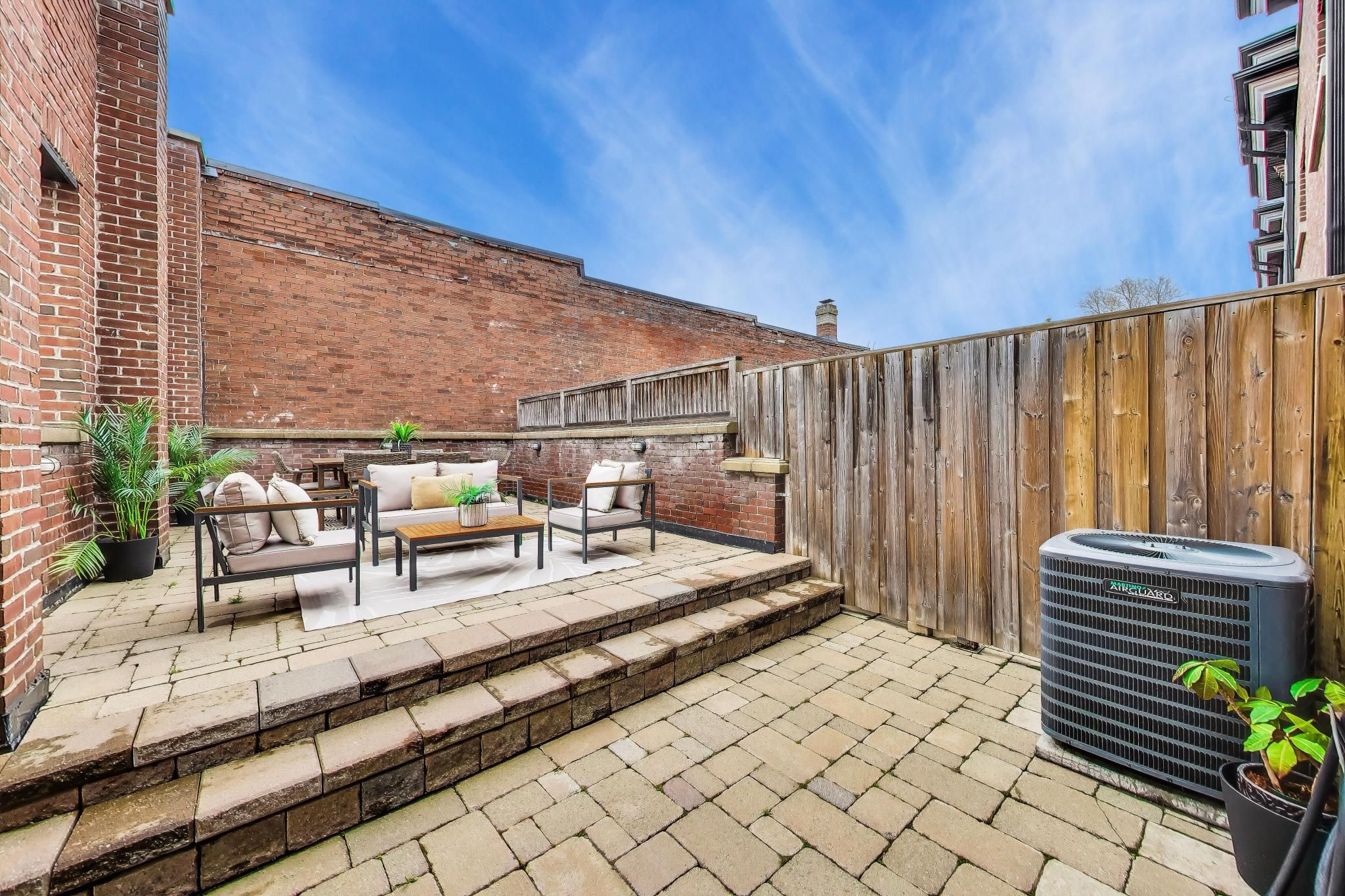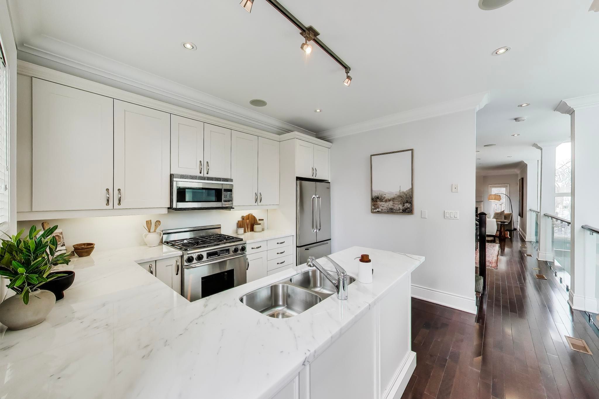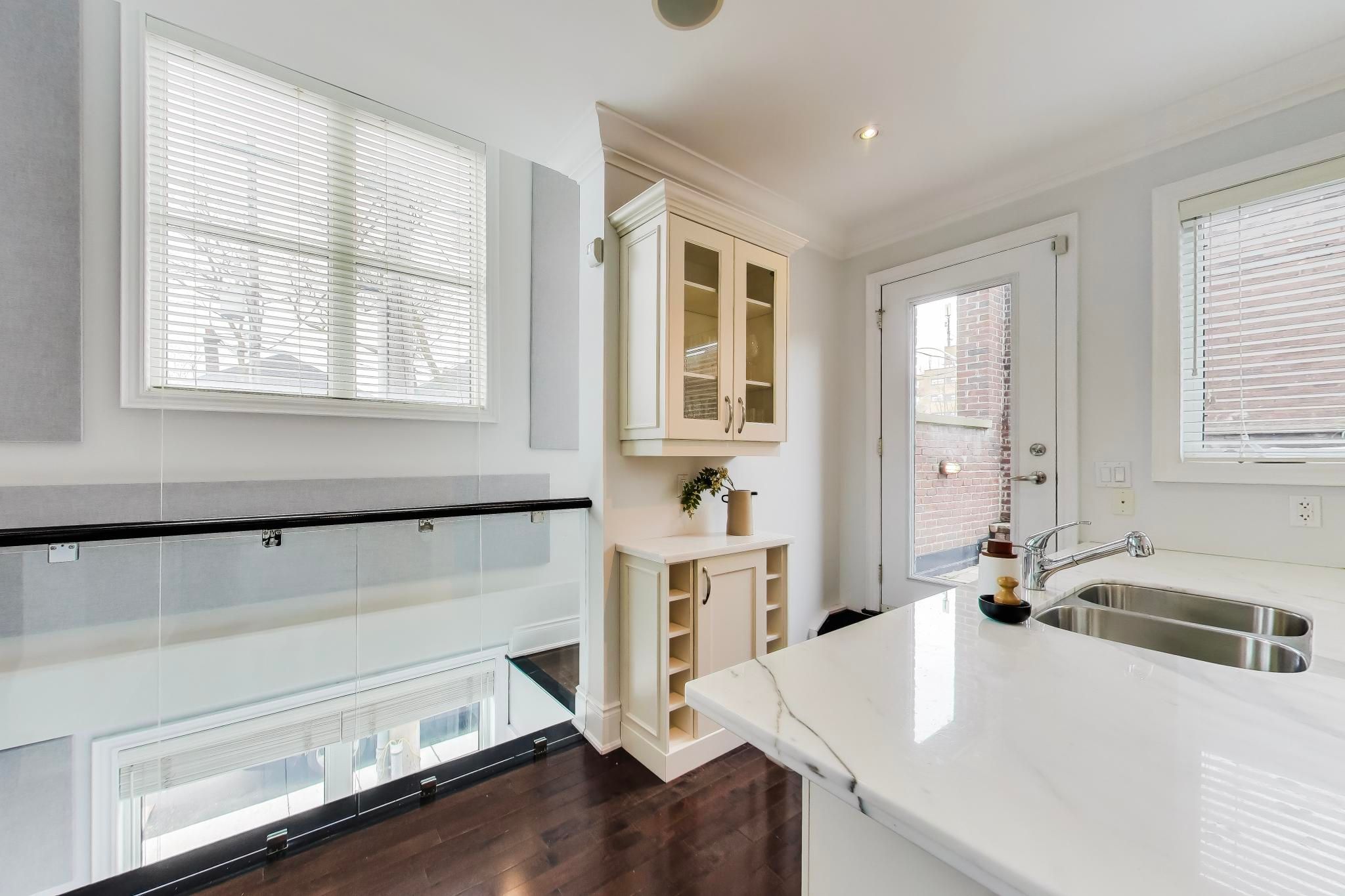 Hidden gem at 'annette lanes' in bloor west village: sophisticated freehold townhome with live/work potential! Welcome to a truly exceptional & rarely offered 2700 square foot townhome, where timeless elegance meets modern versatility across four above-grade thoughtfully designed levels. A grand double-door entrance with wrought iron detailing opens to an impressive entry level featuring exquisite marble flooring & an airy, light-filled ambiance enhanced by expansive windows with a privacy glass option. Perfect as a dream home office, this versatile space also features a cozy gas fireplace and inviting sitting area, easily doubling as a family room or den, with a powder room and dedicated laundry for added convenience. The second level reveals a bright open-concept living and dining area enhanced by a second gas fireplace, pot lights, and dramatic two-storey windows that flood the space with natural light. An atrium-style glass railing overlooks the level below, adding architectural sophistication. The kitchen is beautifully appointed with marble countertops, stainless steel appliances, & a functional layout for entertaining, with a walkout to a stunning south-west facing brick terrace featuring three charming cut-out windows - perfect for entertaining & relaxing. The third level offers two spacious bedrooms, including one with a private balcony, along with a well-designed double-entry 4-piece bathroom with glass shower. The top level is a true retreat, showcasing a luxurious primary suite with vaulted ceiling, skylight, & a striking oversized round window. Enjoy a private third balcony & a marble 5-piece ensuite complete with water closet, dual vanities, soaker tub, & separate glass shower. With a private garage & just steps to restaurants, cafés, boutique shopping, ttc and everyday amenities, as well as the humber river trails, this is a rare opportunity to own a distinctive property that offers luxury, flexibility, and an unbeatable location all in one.