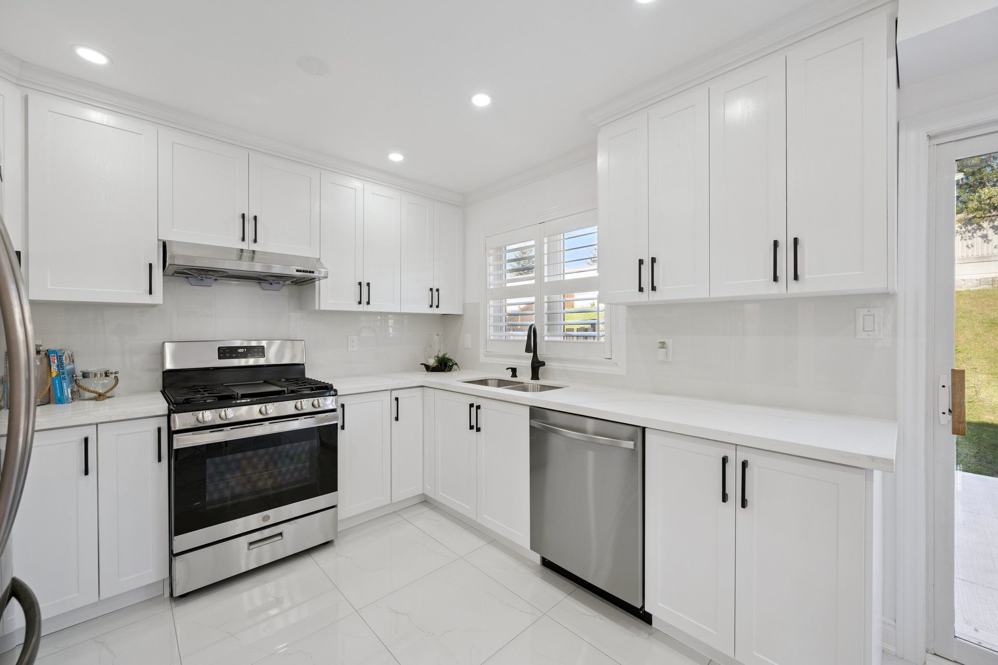 • Modern kitchen with quartz countertops and stainless steel appliances.