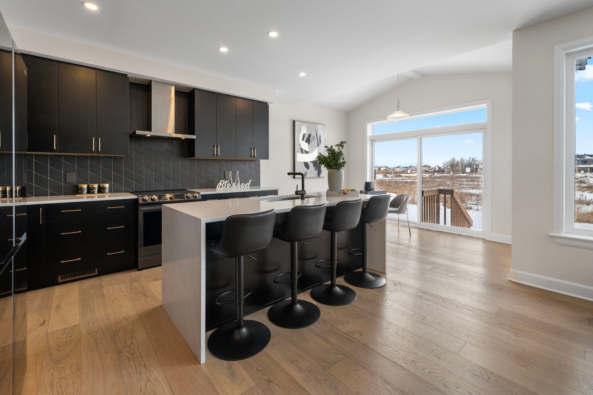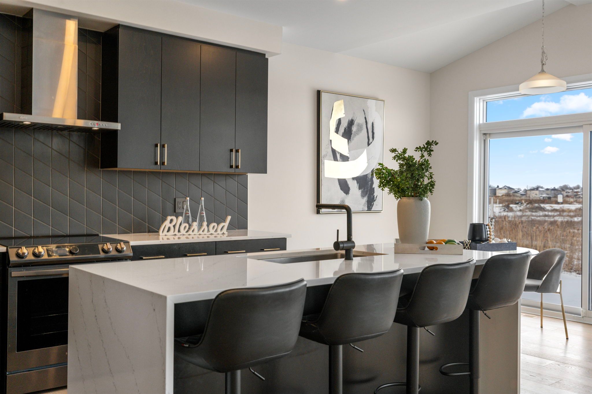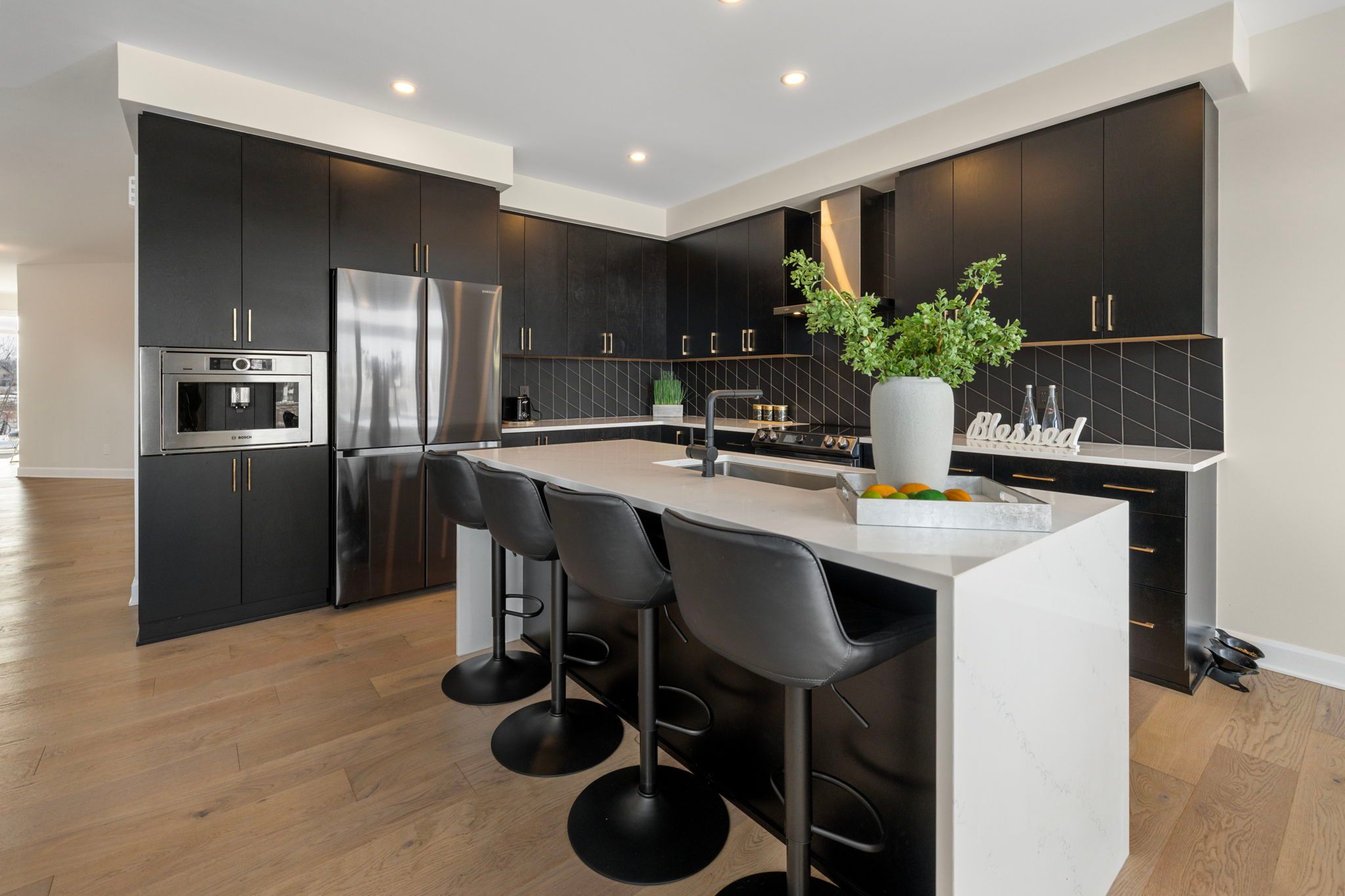 • High-end kitchen featuring waterfall quartz countertops and top appliances.