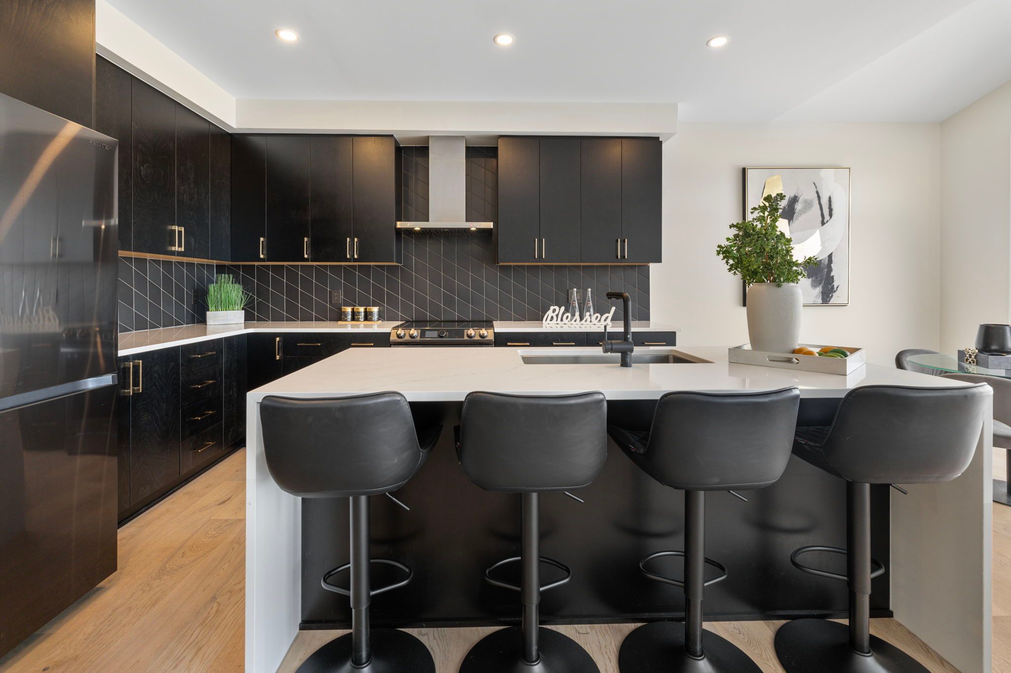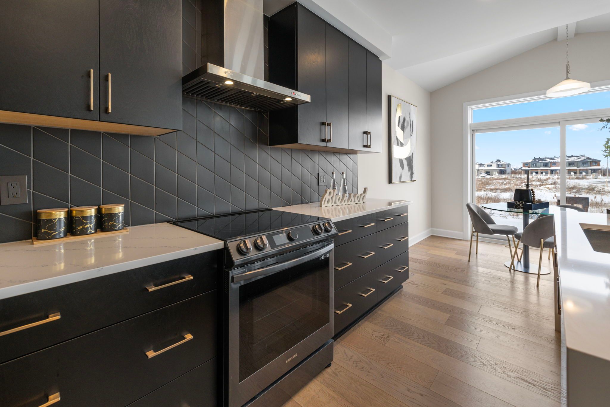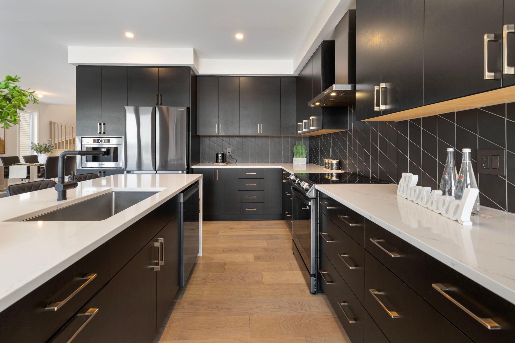 • High-end kitchen featuring waterfall quartz countertops and top appliances.