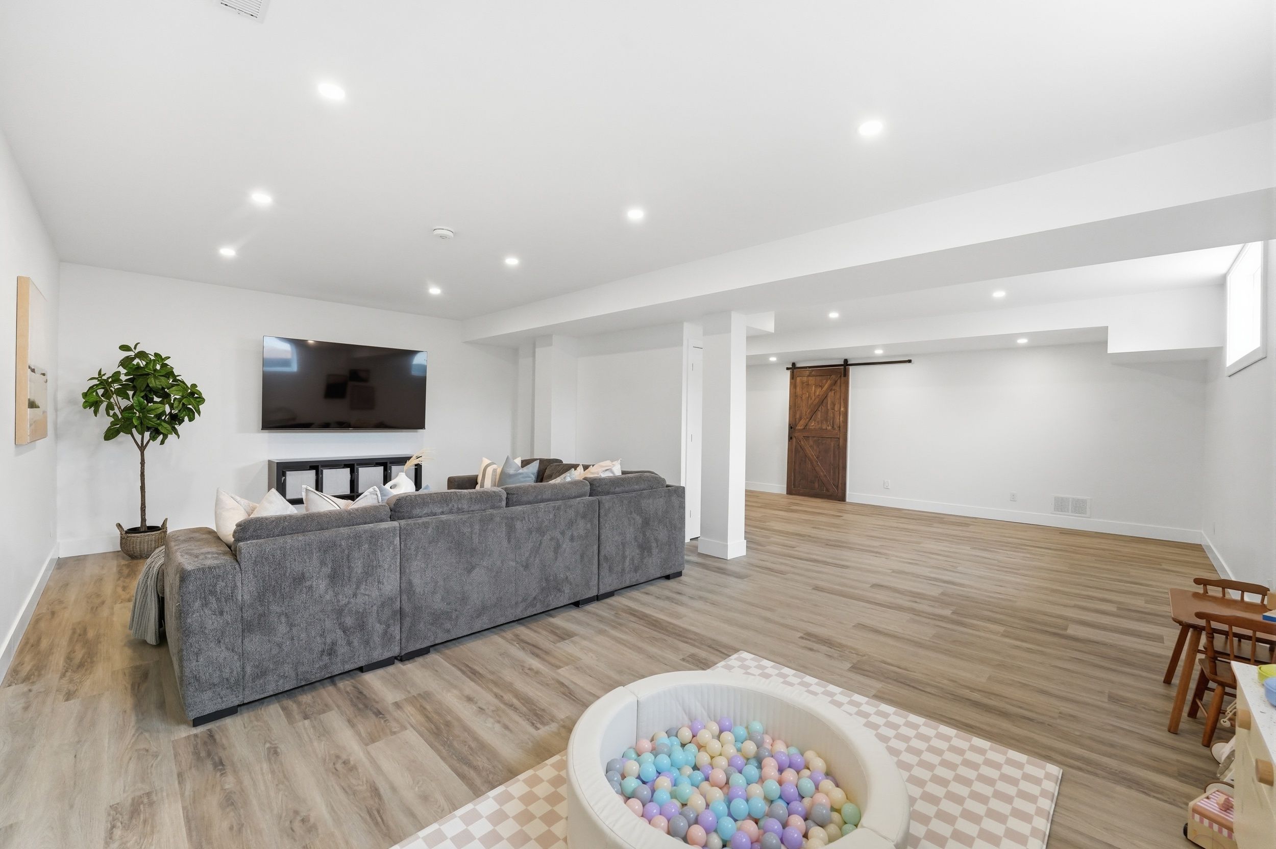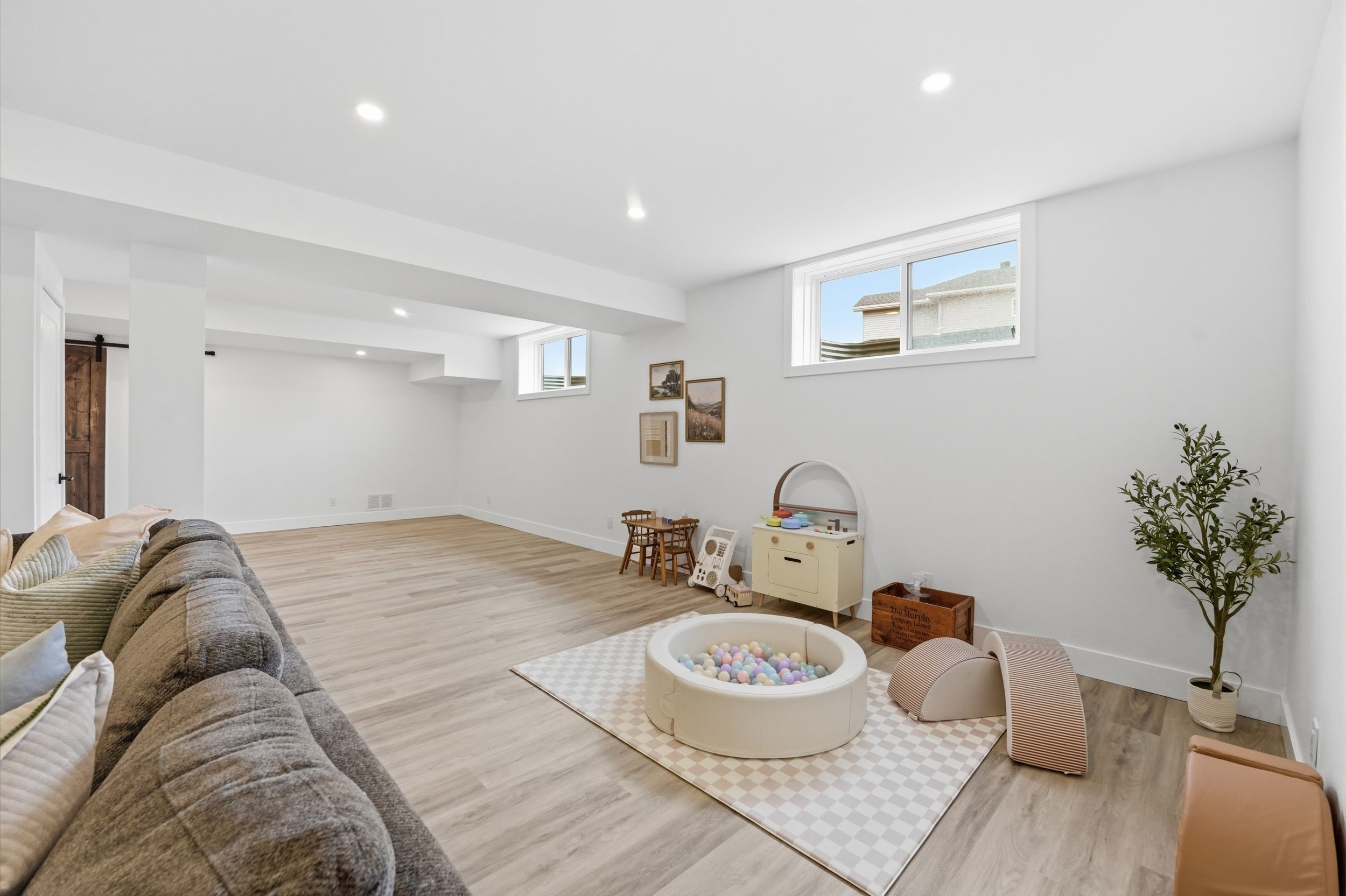 • Finished basement includes a large rec room, extra bedroom, and storage.