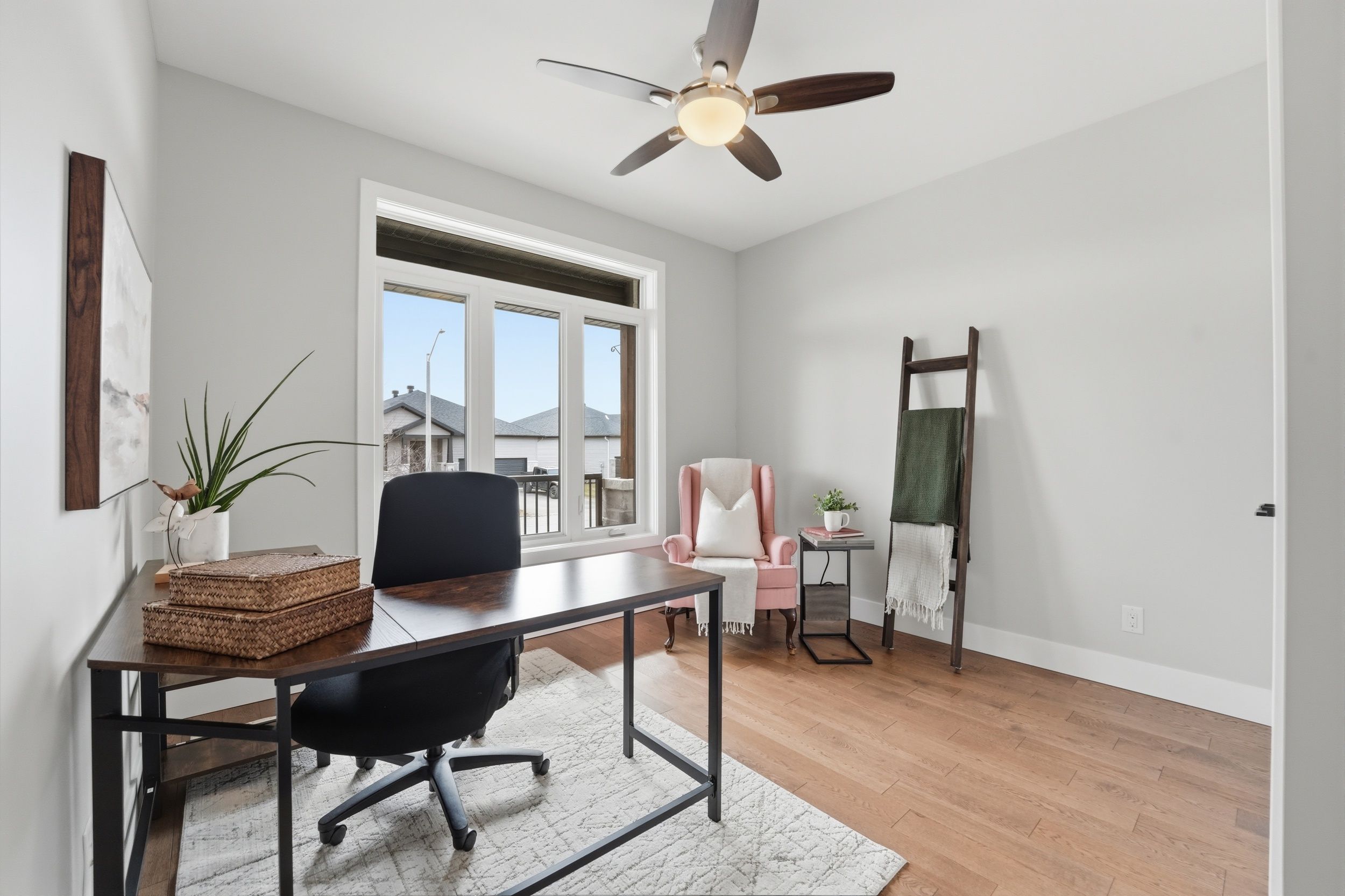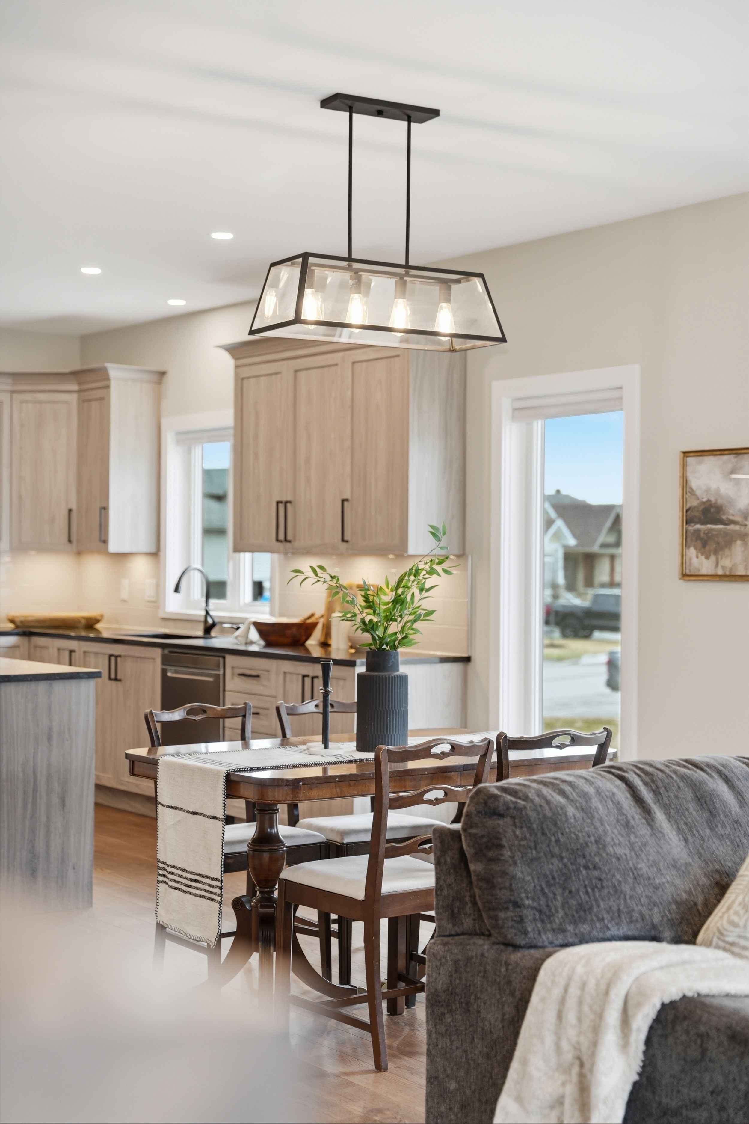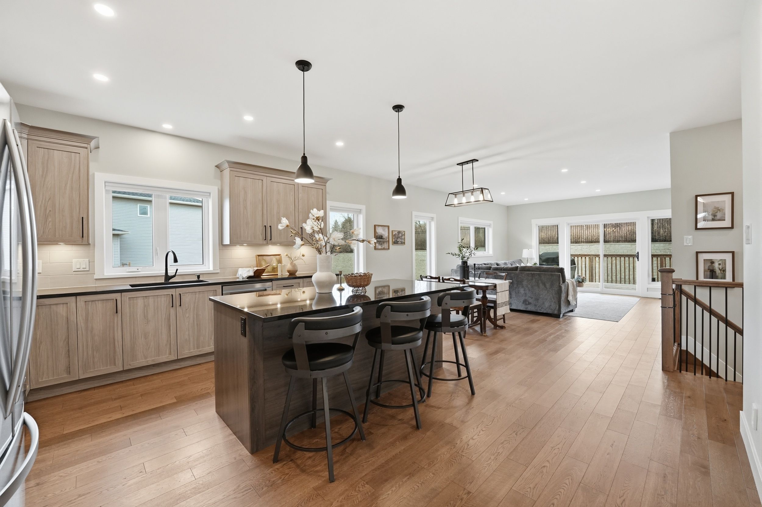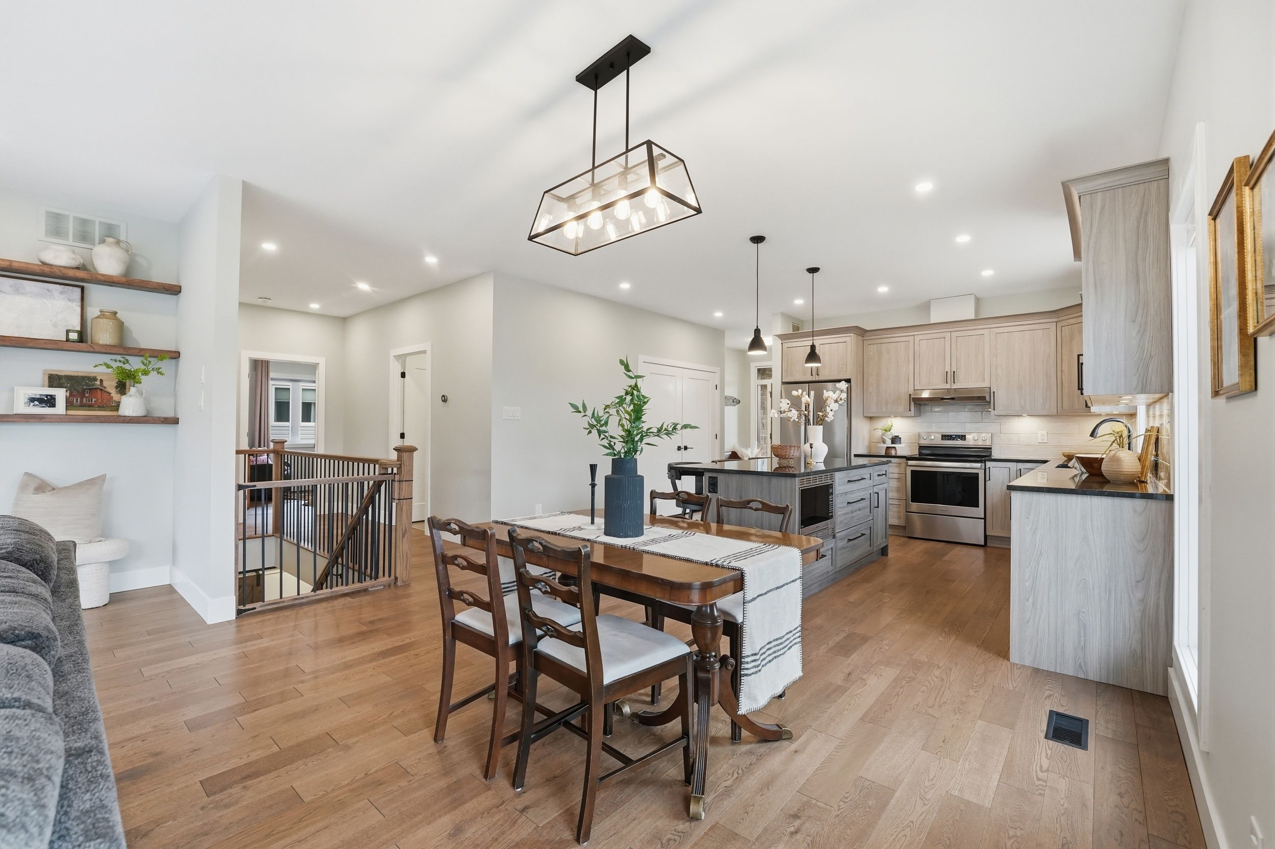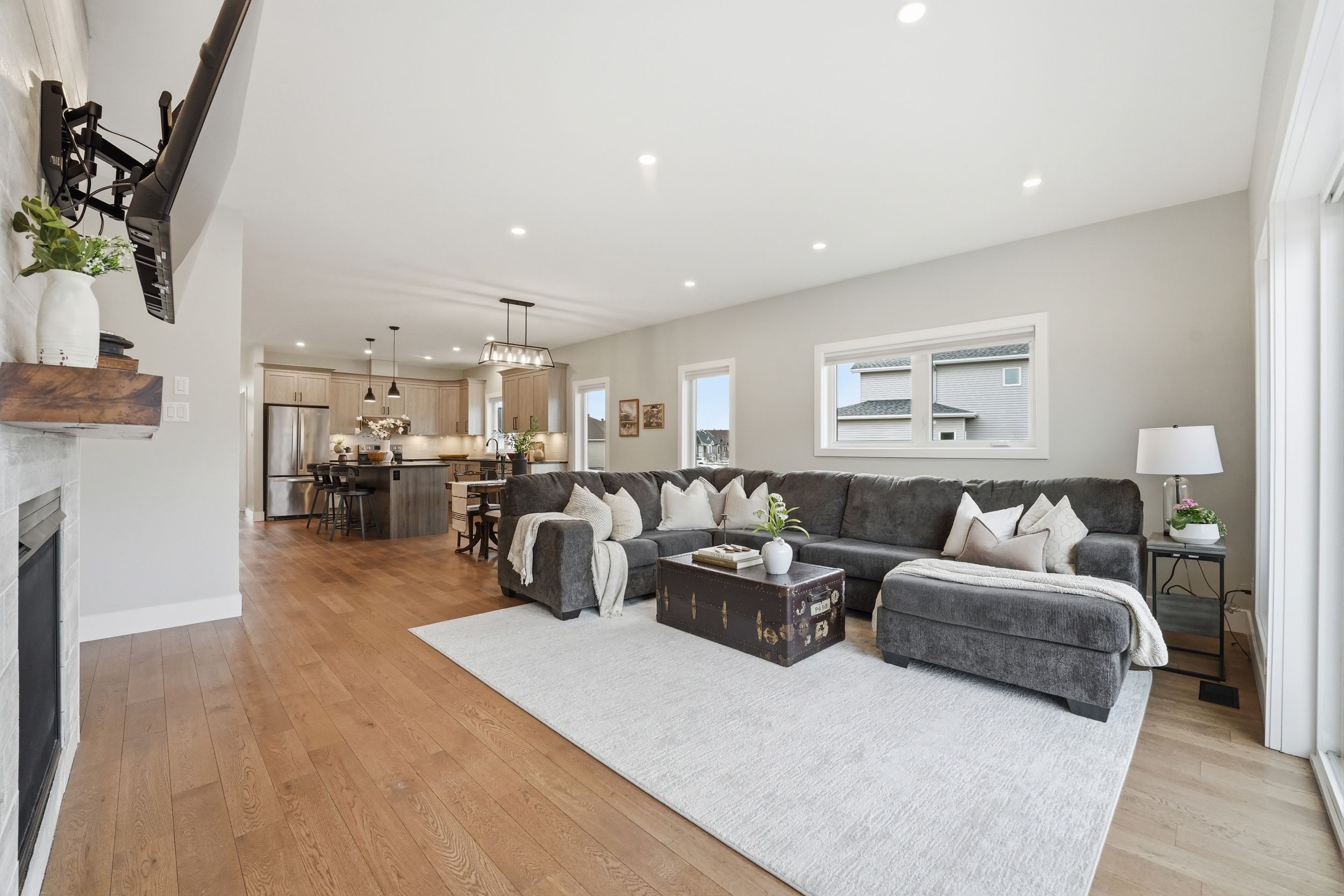 • Bright open-concept living area features gas fireplace and elegant hardwood flooring.