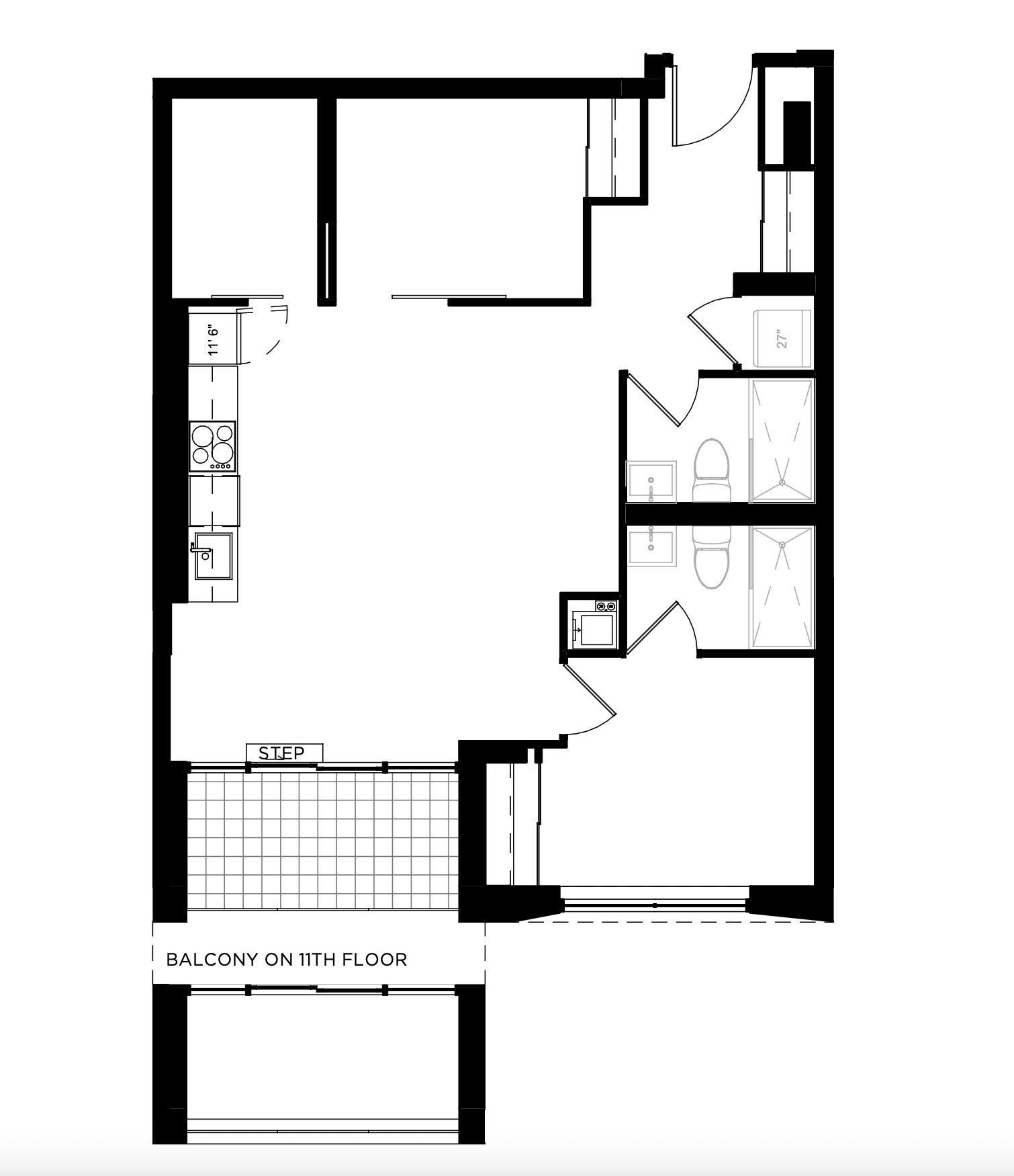 • Lower penthouse suite features 2 bedrooms, a den, and 2 bathrooms.